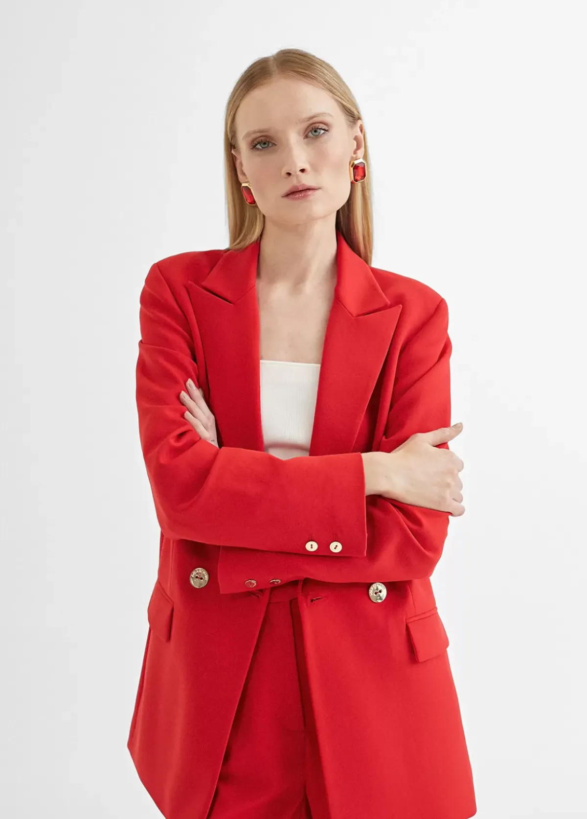 Blazer cruzada monocolor. Cuello solapa y cierre con botones dorados. Bolsillos de vivo con solapa en delantero. Forro en estampado animal print.