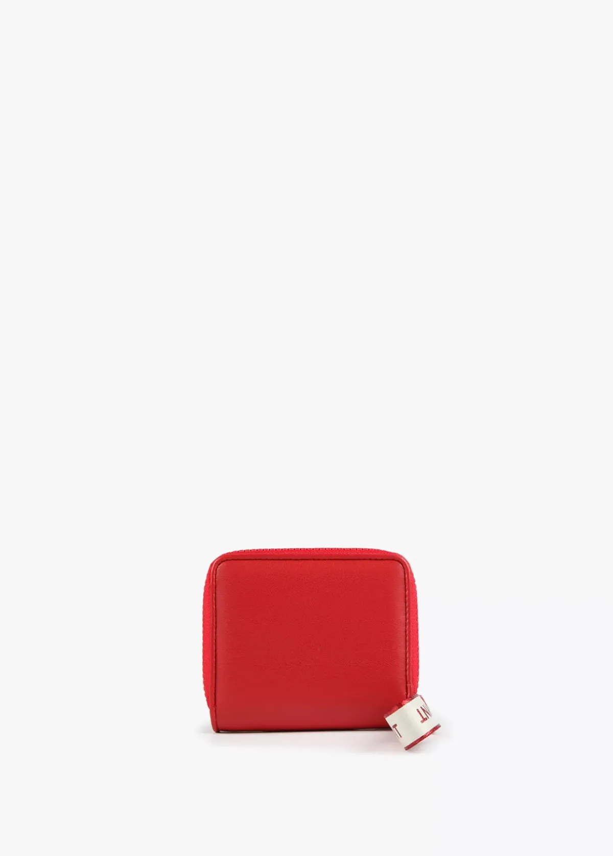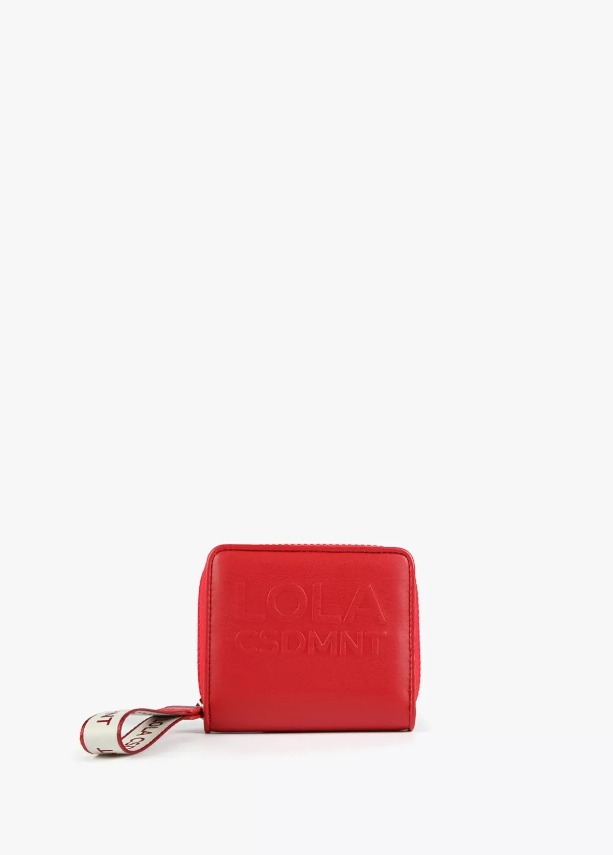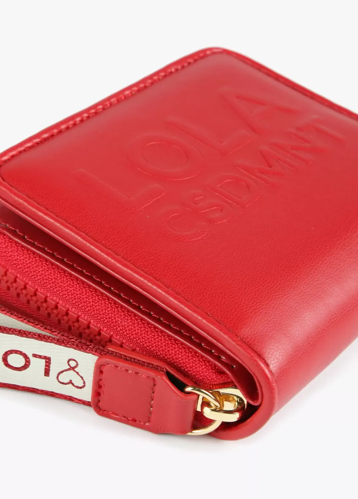 Billetero pequeño en efecto piel y logo en relieve. Asa de mano logotipada, cierre de cremallera y logo lacado en parte frontal.