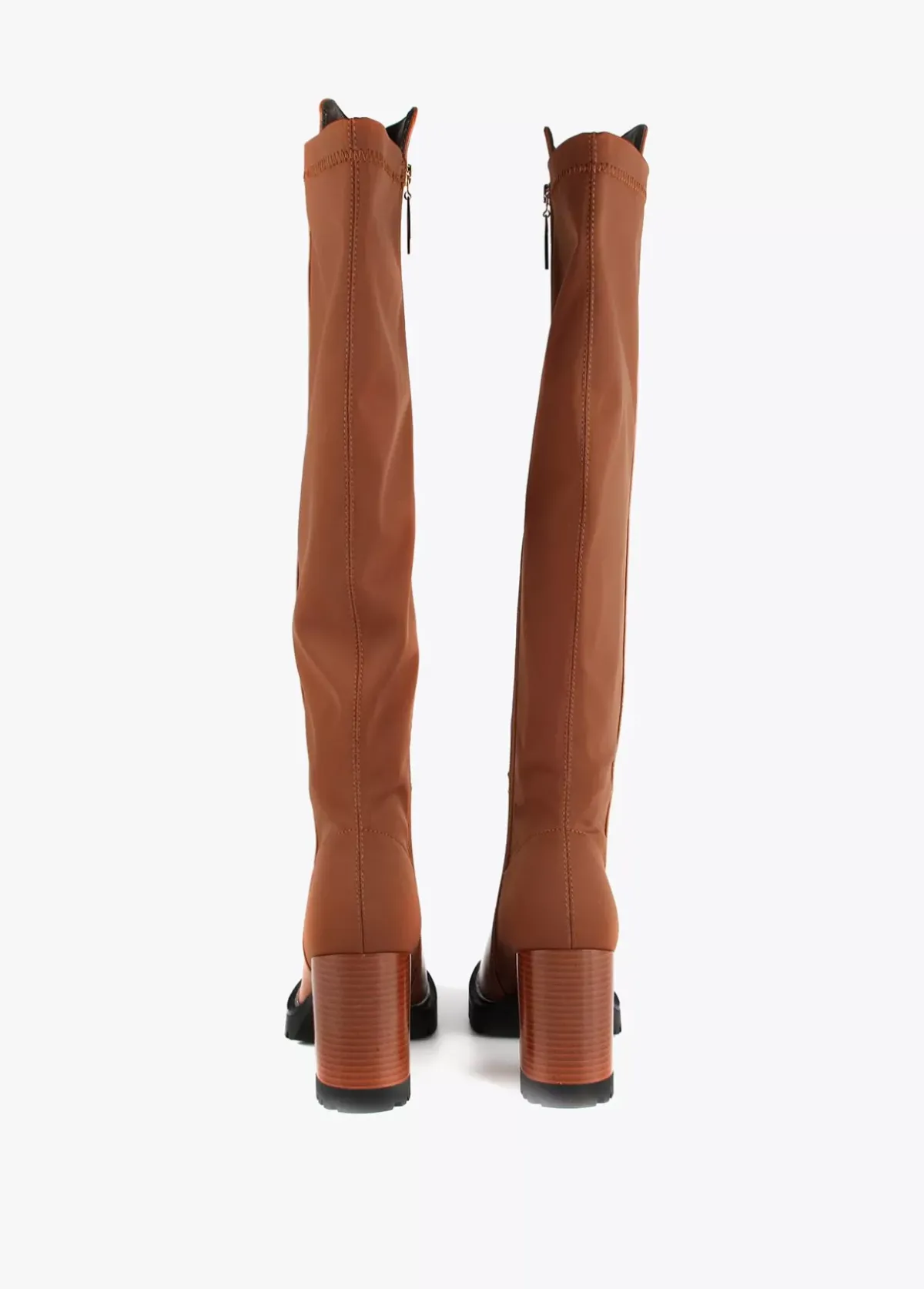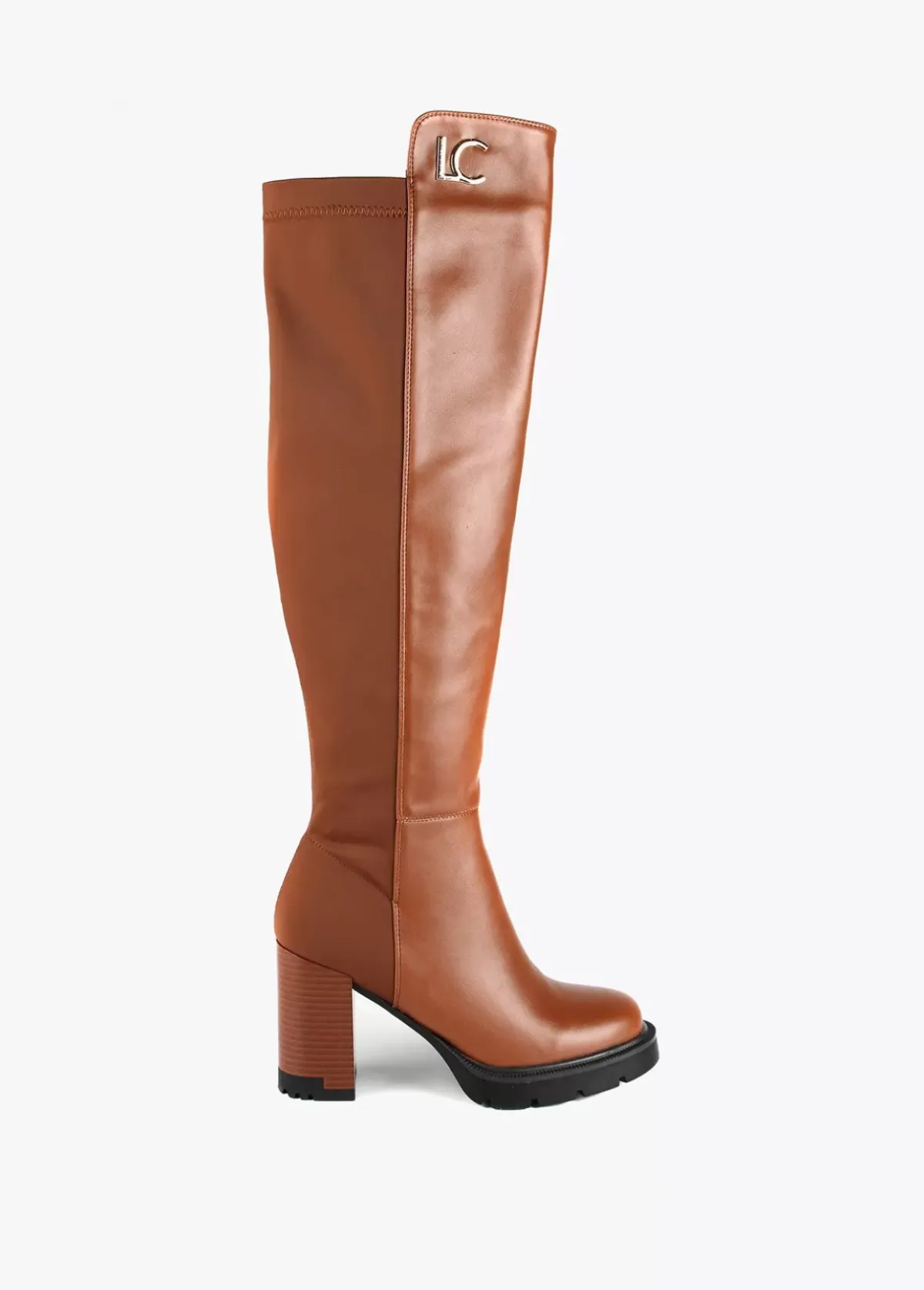 Botas tipo mosquetera altas con tacón en diferentes tejidos, efecto piel y efecto neopreno combinados. Maxi suela y logo dorado en parte superior.