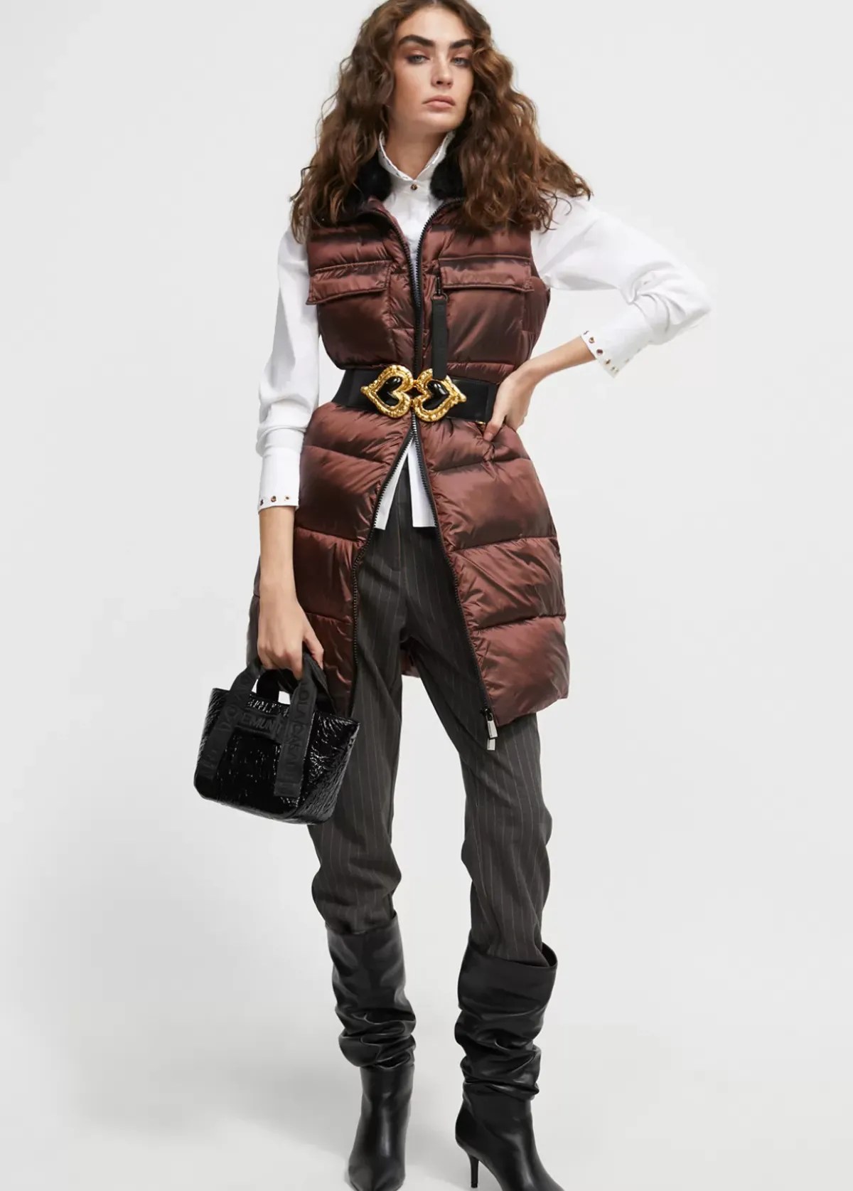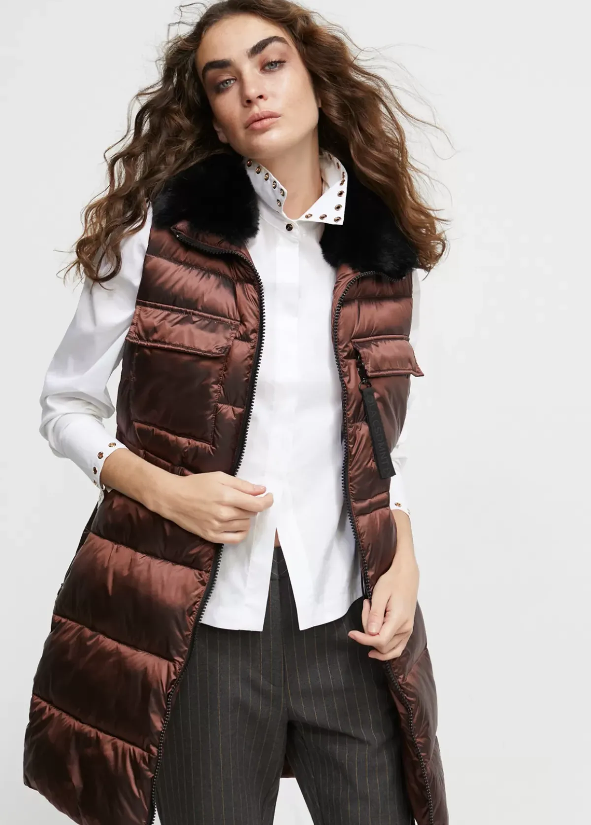 Chaleco acolchado efecto metalizado. Cuello de pelo. Bolsillos superiores tipo plastrón con tapete. Bolsillos laterales cerrados con cremallera. Cintura ajustable. Cierre con cremallera de doble carro.