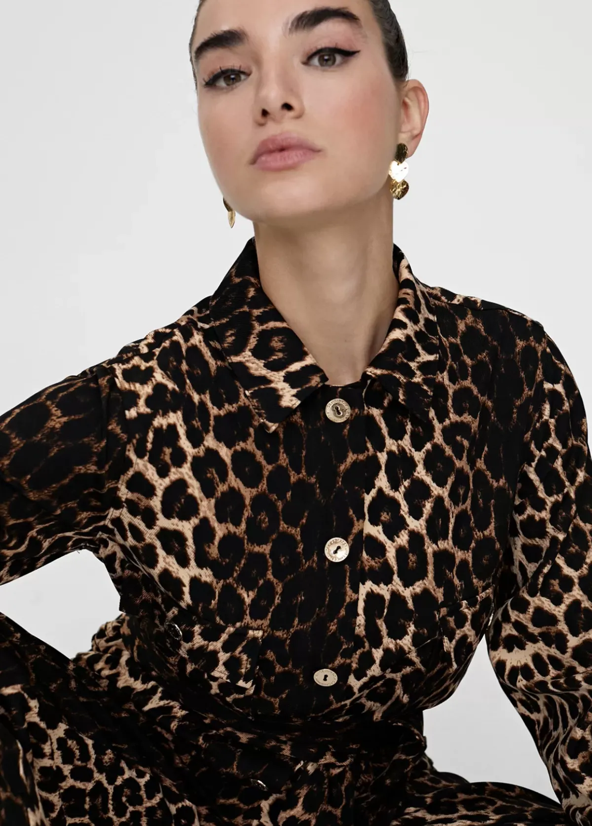 Mono con estampado animal y cierre de botones dorados y logotipados. Bolsillos laterales y traseros, cinta a modo de cinturón.