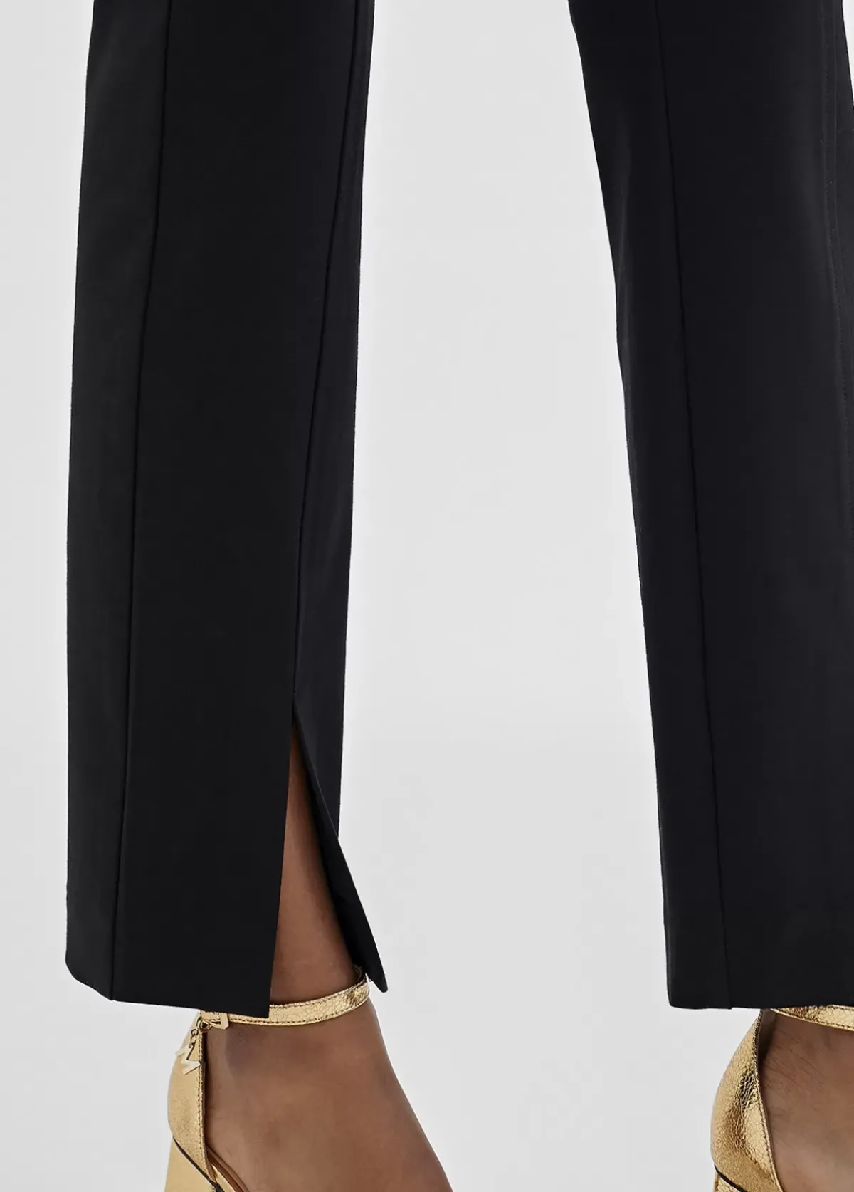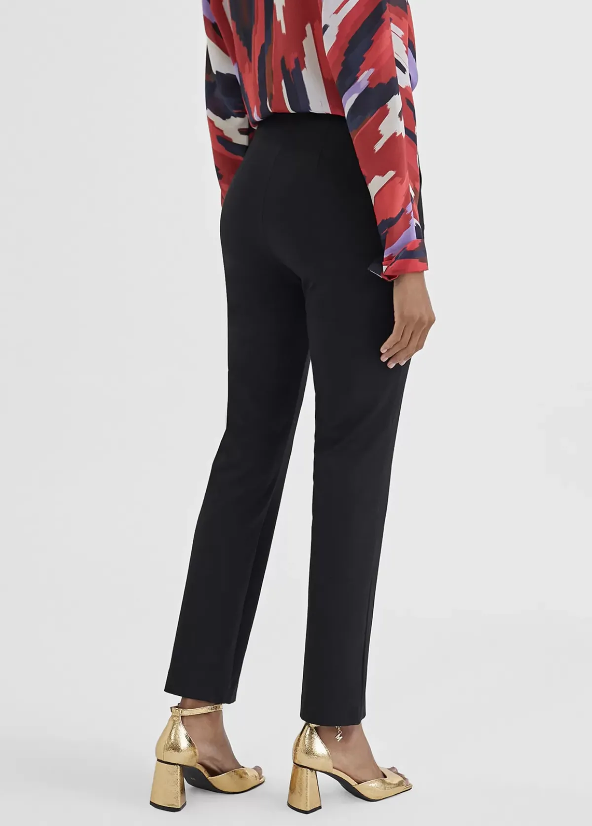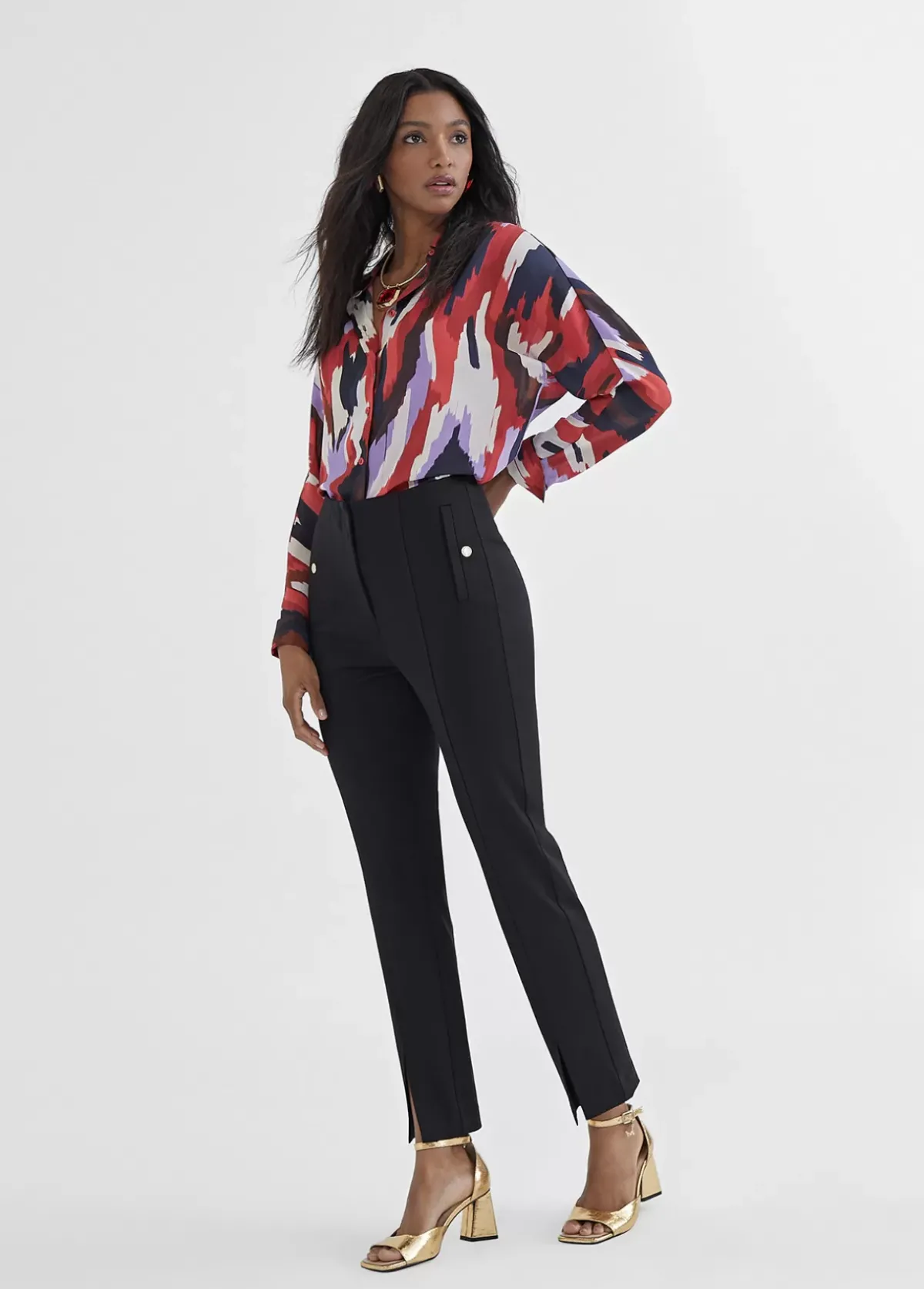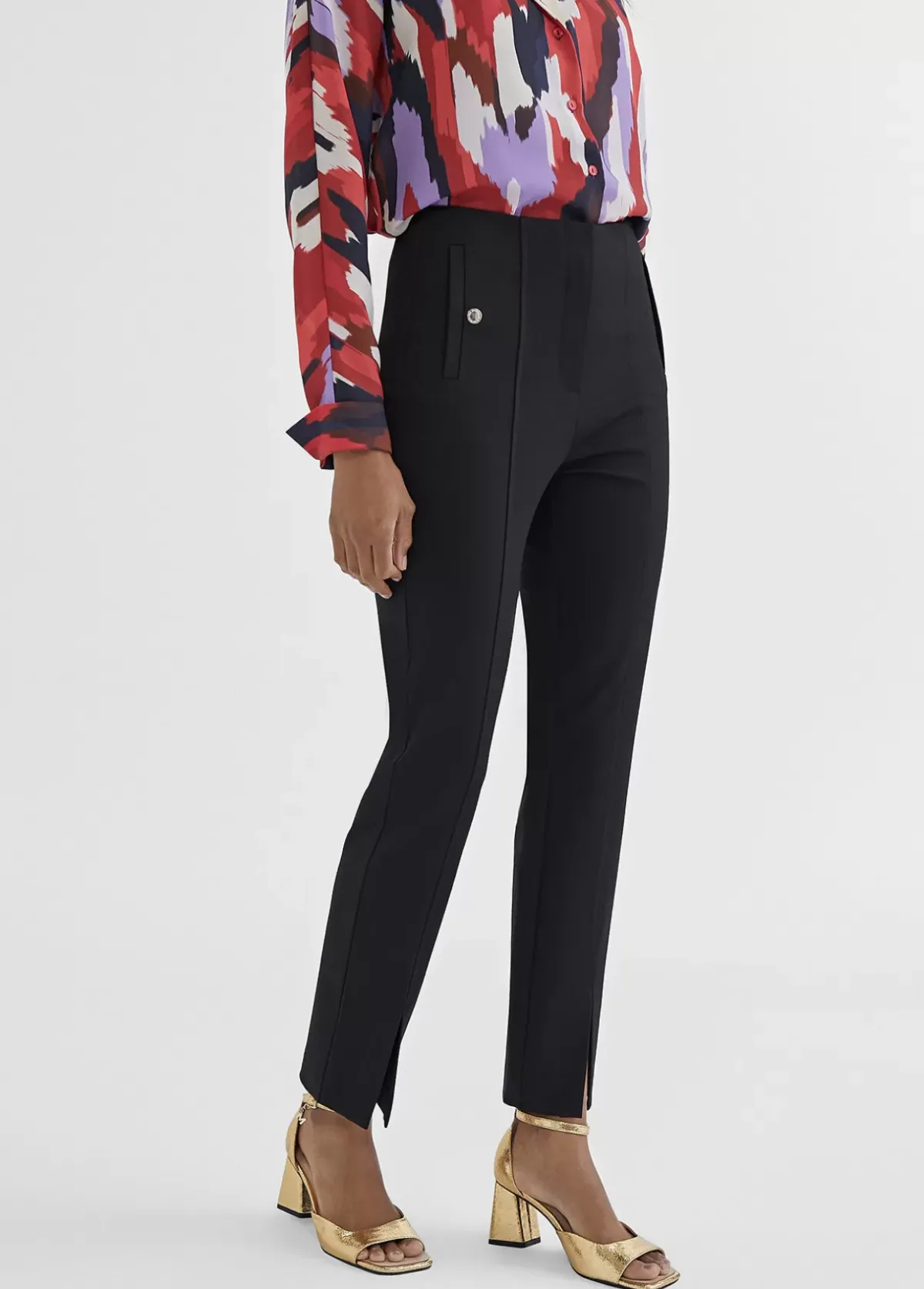 Pantalón pitillo de punto. De largo tobillero. Cierre con cremallera. Falsos bolsillos laterales con botón dorado. Aberturas frontales en bajo.