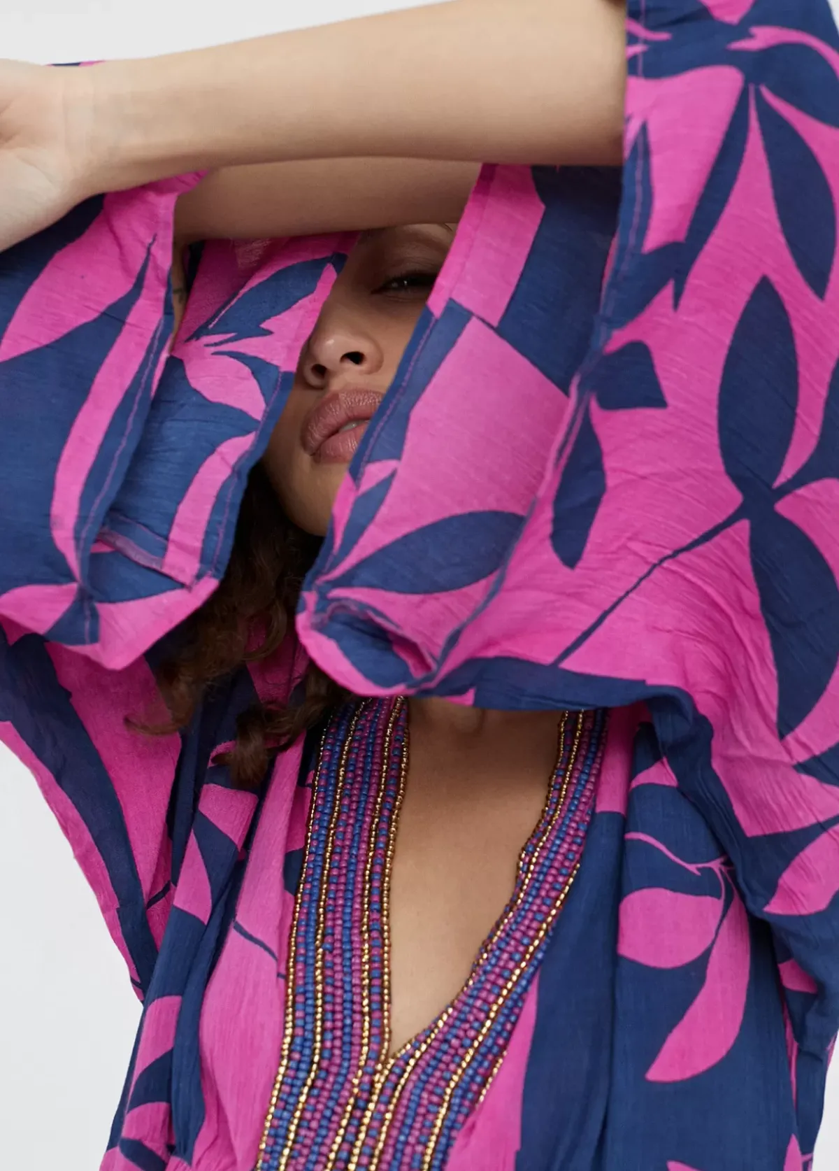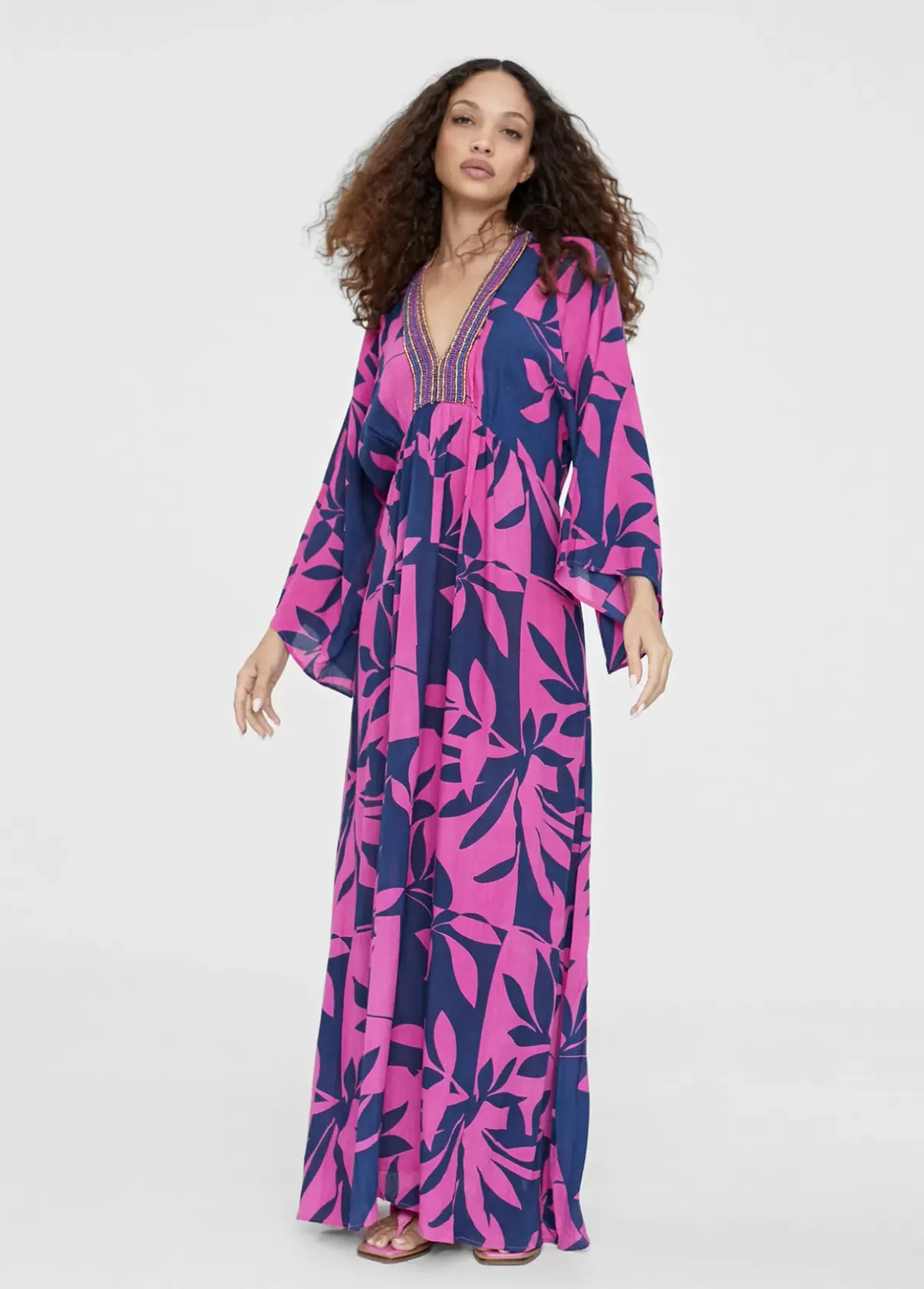 Vestido largo con manga japonesa larga y estampado floral. Detalle abalorios en zona pechera.