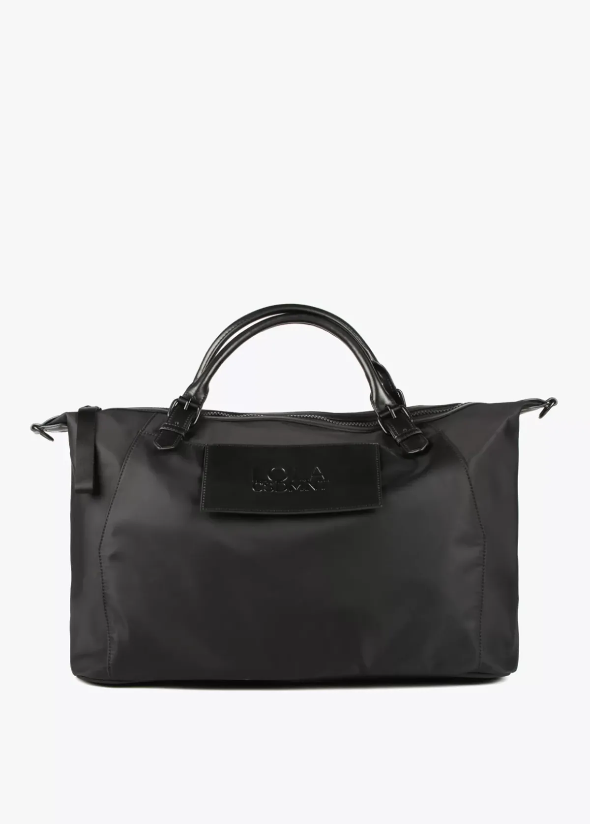 Weekend color negro de nylon y efecto piel combinados. Bolsillo y logo en parte frontal. Asas de mano y asa bandolera logotipada. Cierre de cremallera y compartimentos interiores.
