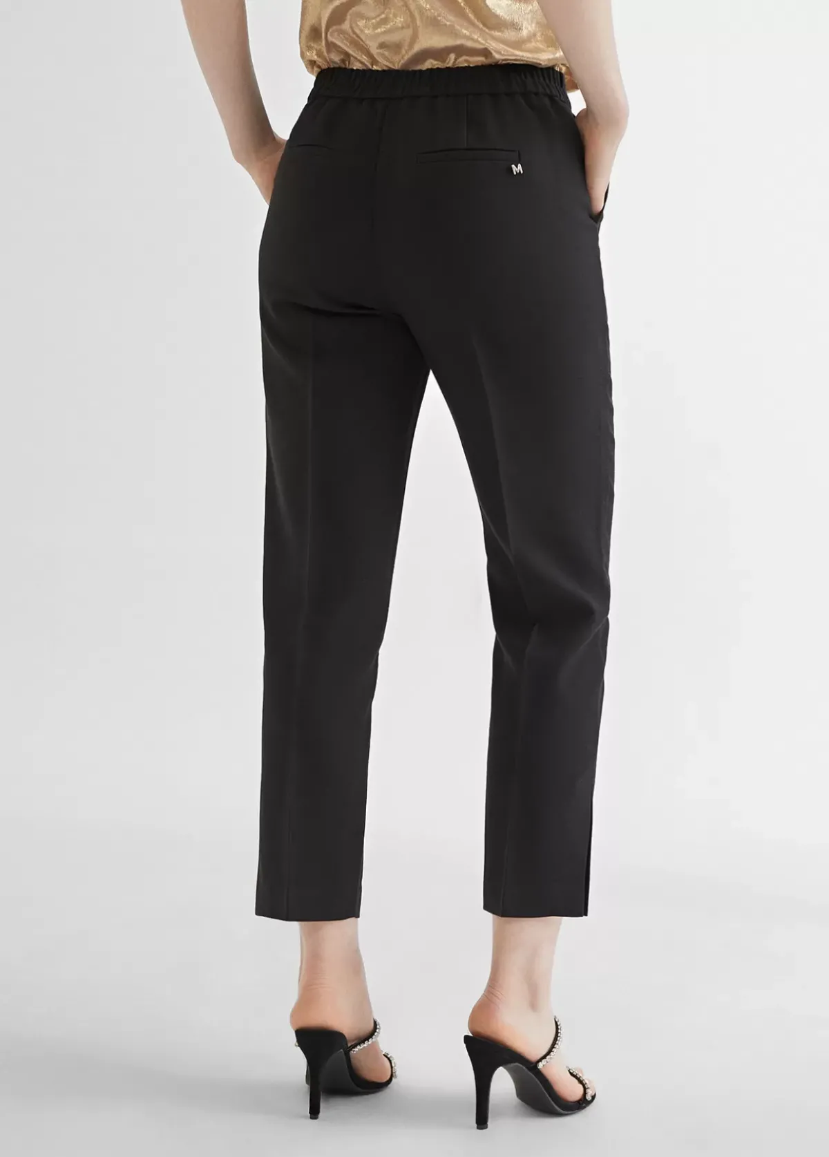 Pantalón en color negro y goma en cintura con aberturas laterales en bajo. Cierre con cremallera y botón invisible. Falsos bolsillos traseros con letra logo dorada. Bolsillos laterales.
