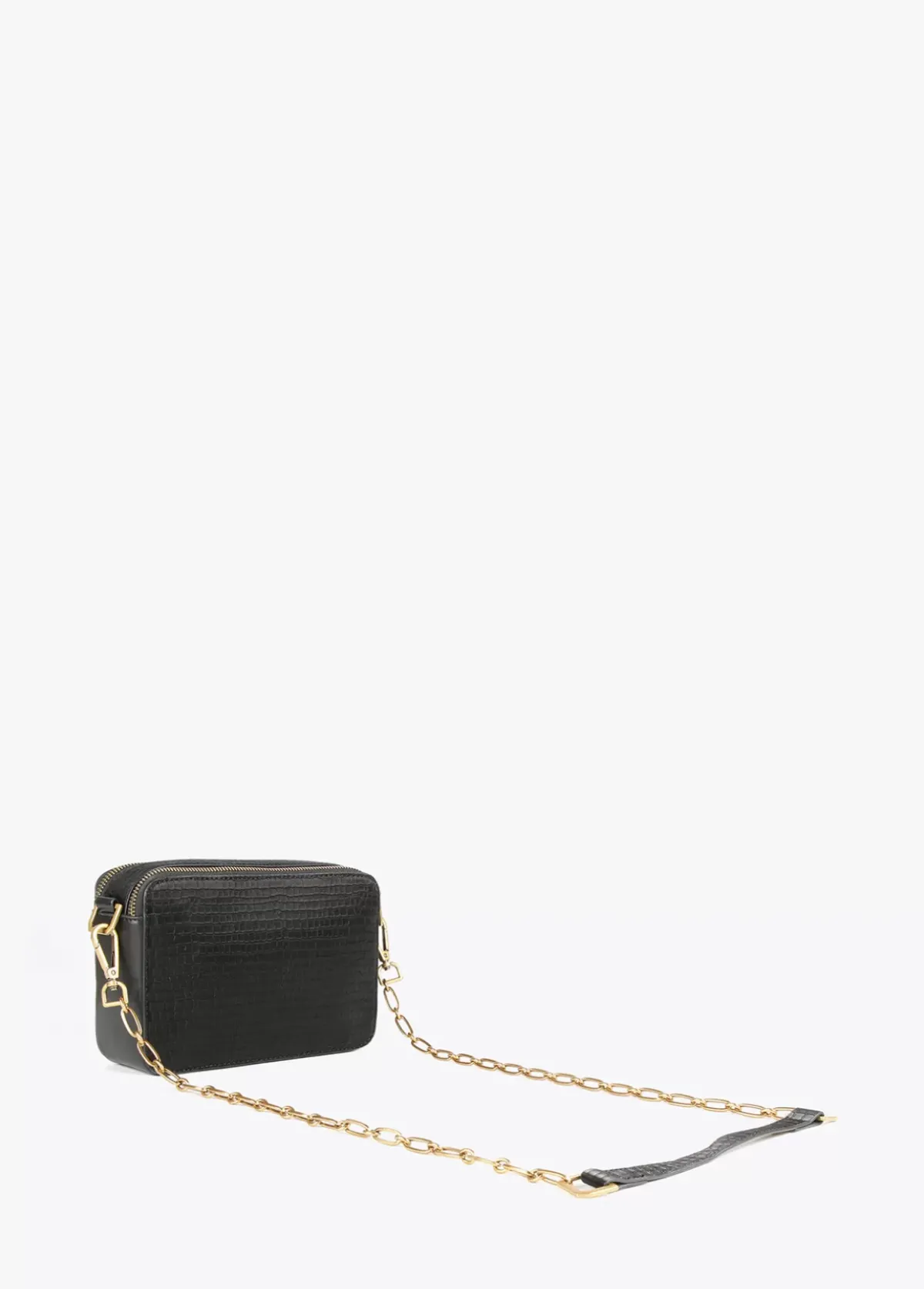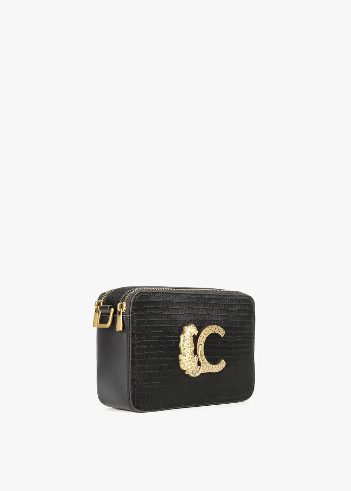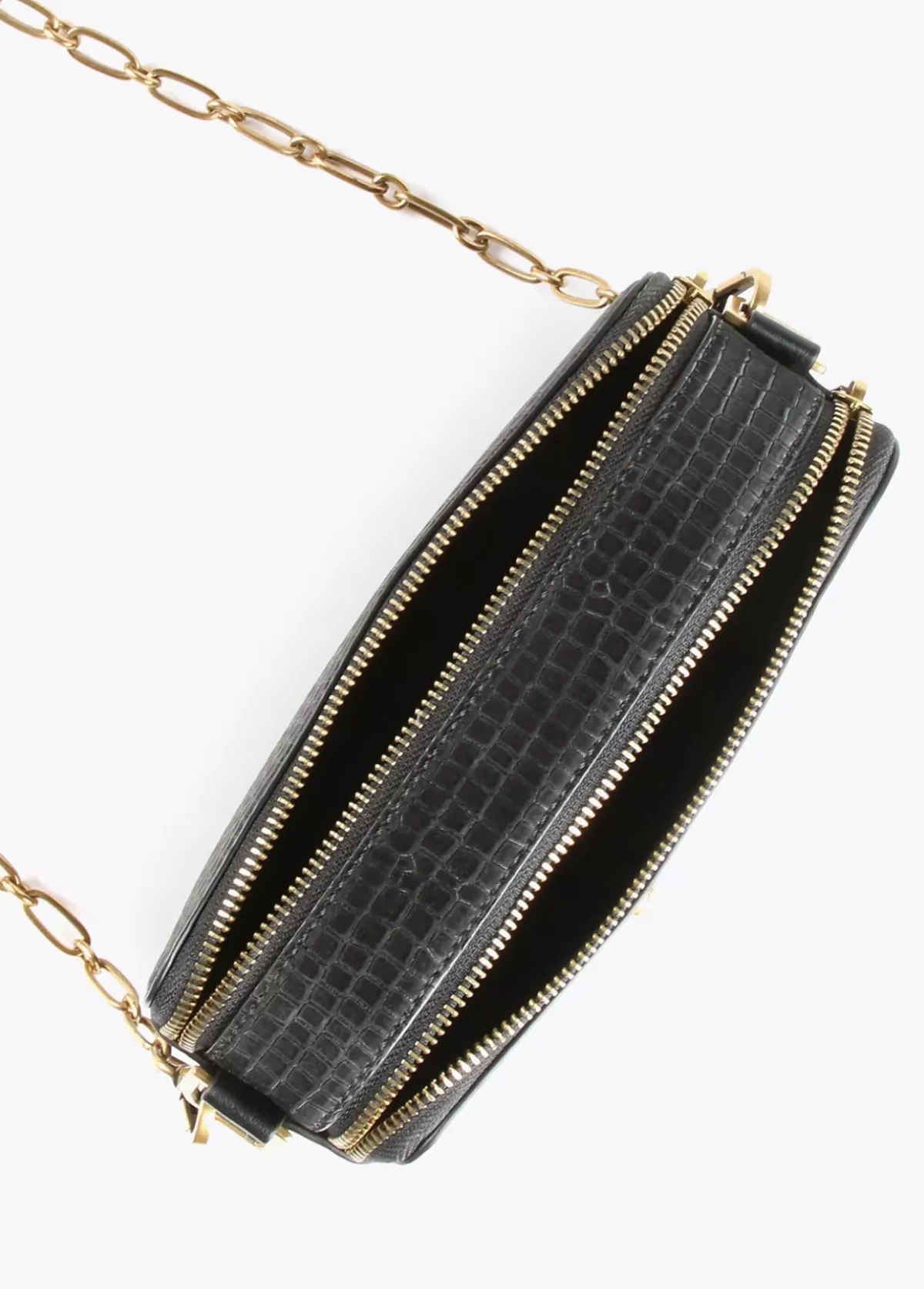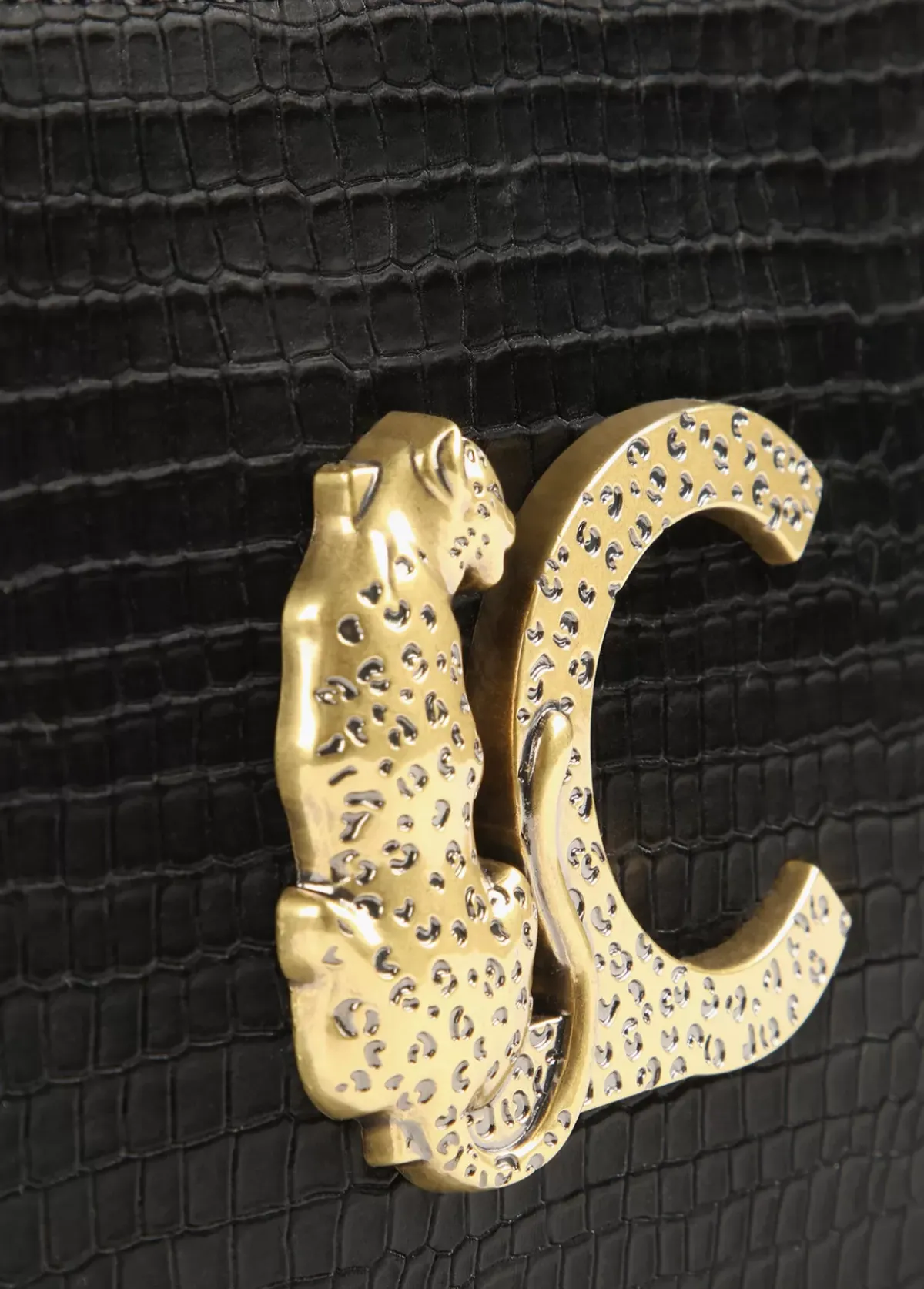 Bolso tipo bandolera en efecto piel cocodrilo y mega logo animal dorado en parte frontal. Doble cierre de cremallera y asa bandolera de cadena dorada.