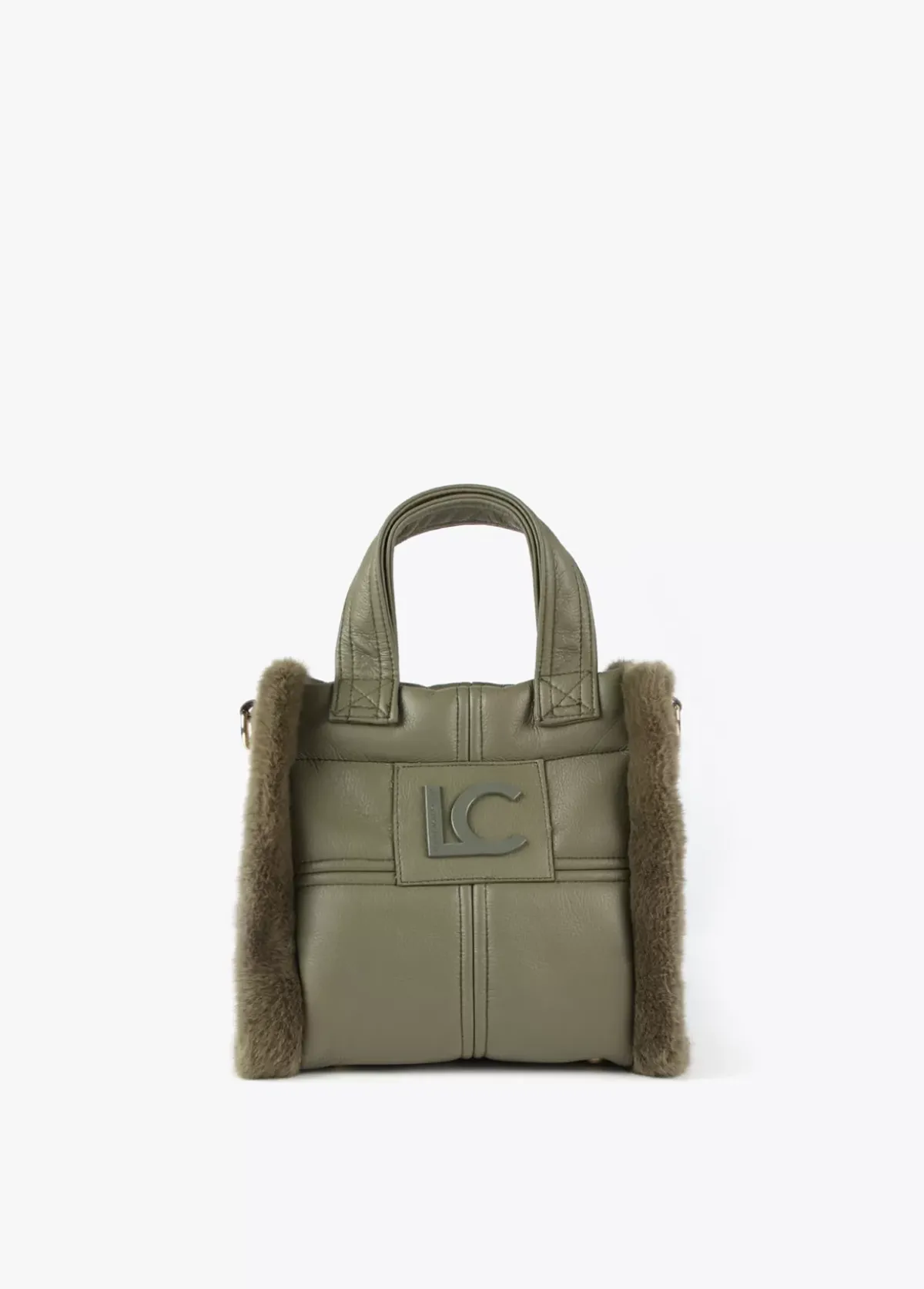 Bolso tipo bandolera en efecto piel y efecto pelo combinados. Asas de mano y asa bandolera ajustable y extraíble. Cierre con botón imantado y logo lacado en parte frontal.