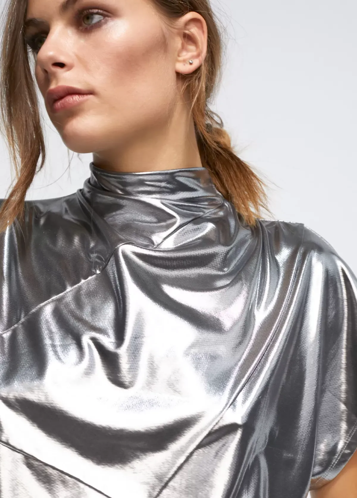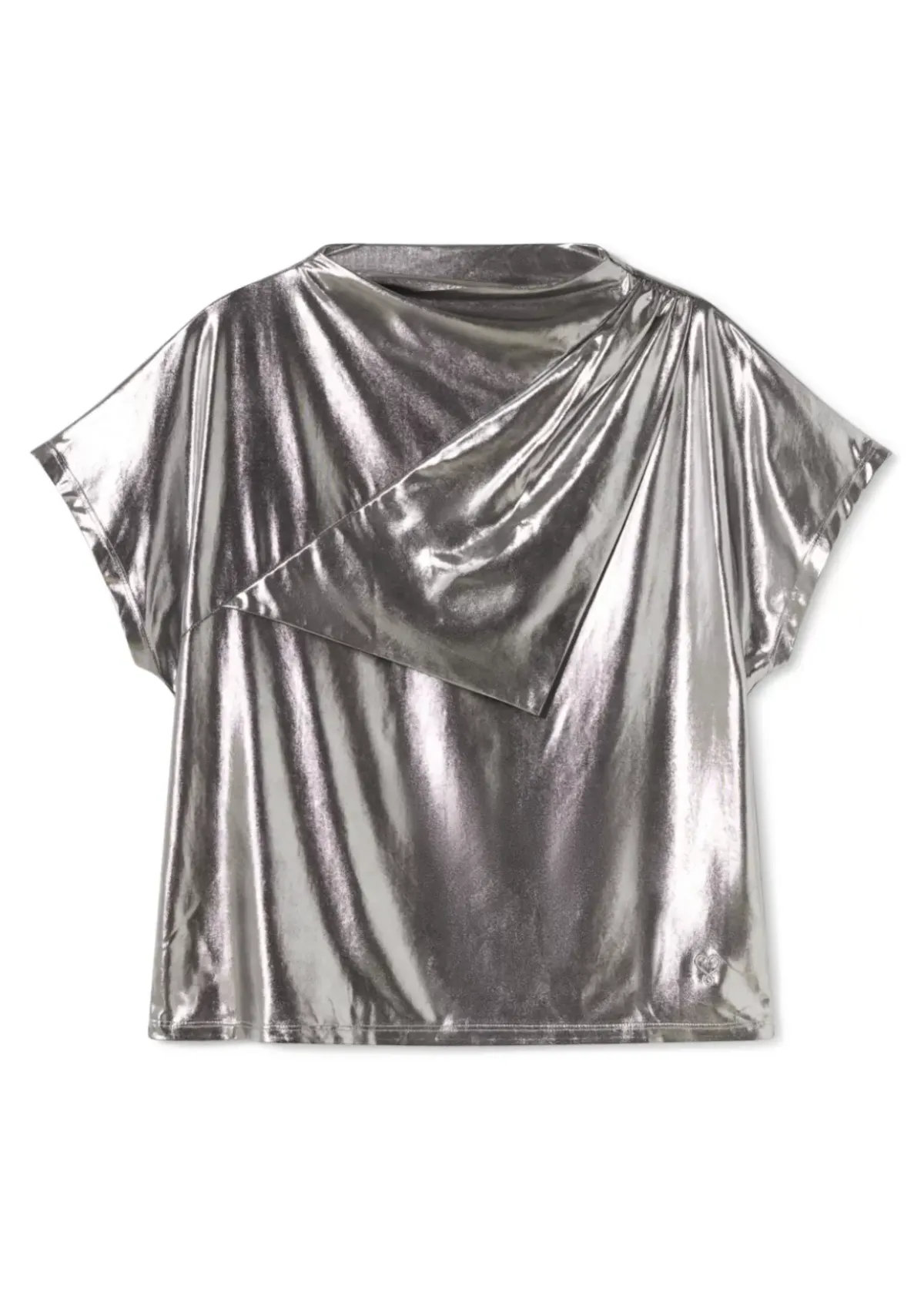 Camiseta de cuello perkins en tejido laminado color plata. Efecto pañuelo en frontal.