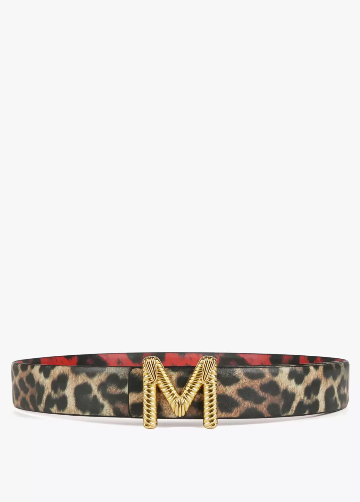 Cinturón reversible animal print en dos tonos, rojo y marrón. Letra logo dorada y grabada a modo de hebilla.