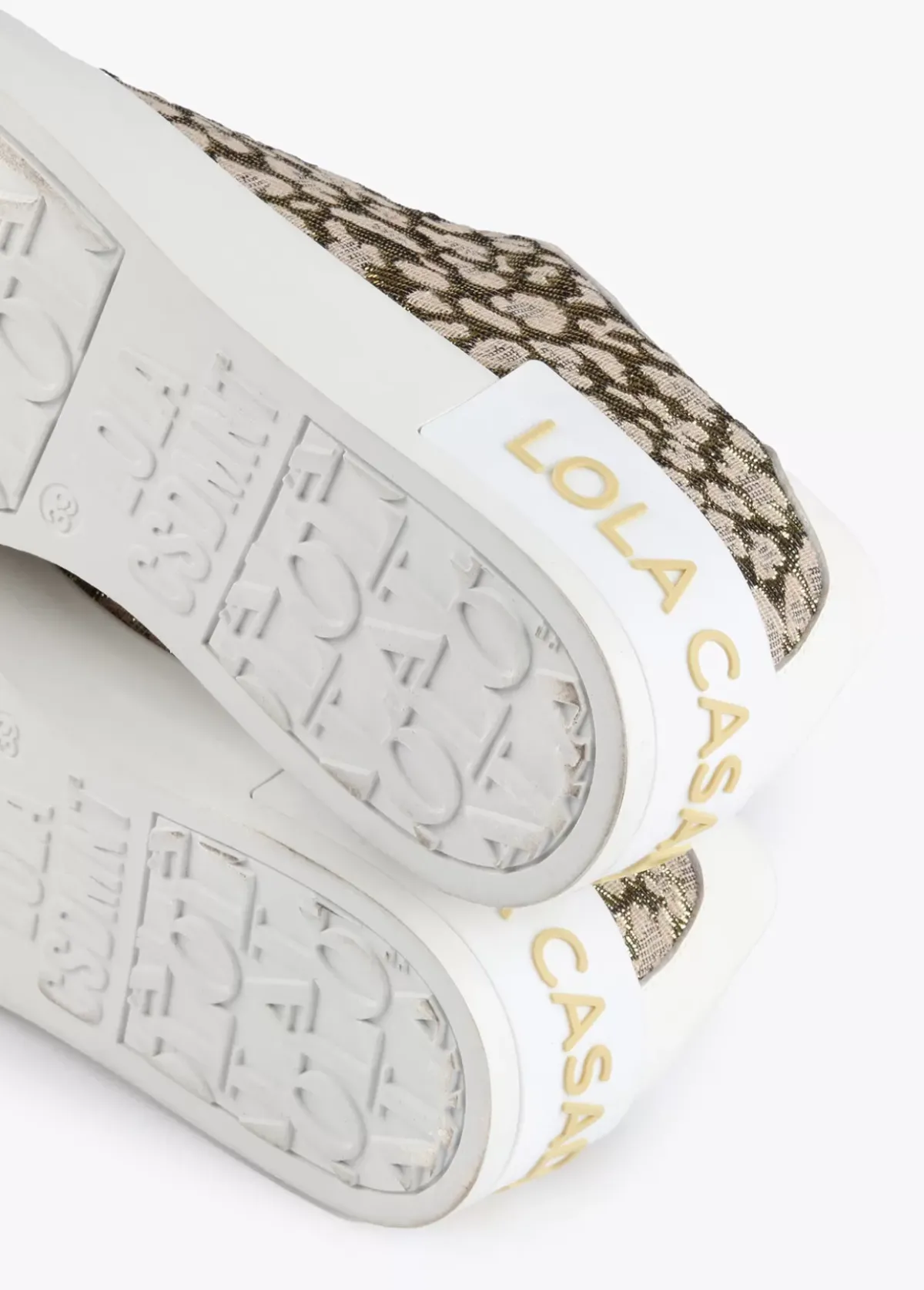 Zapatillas sneakers blancas combinadas con estampado de leopardo metalizado. Lengüeta y suela logotipadas y cordones dorados.