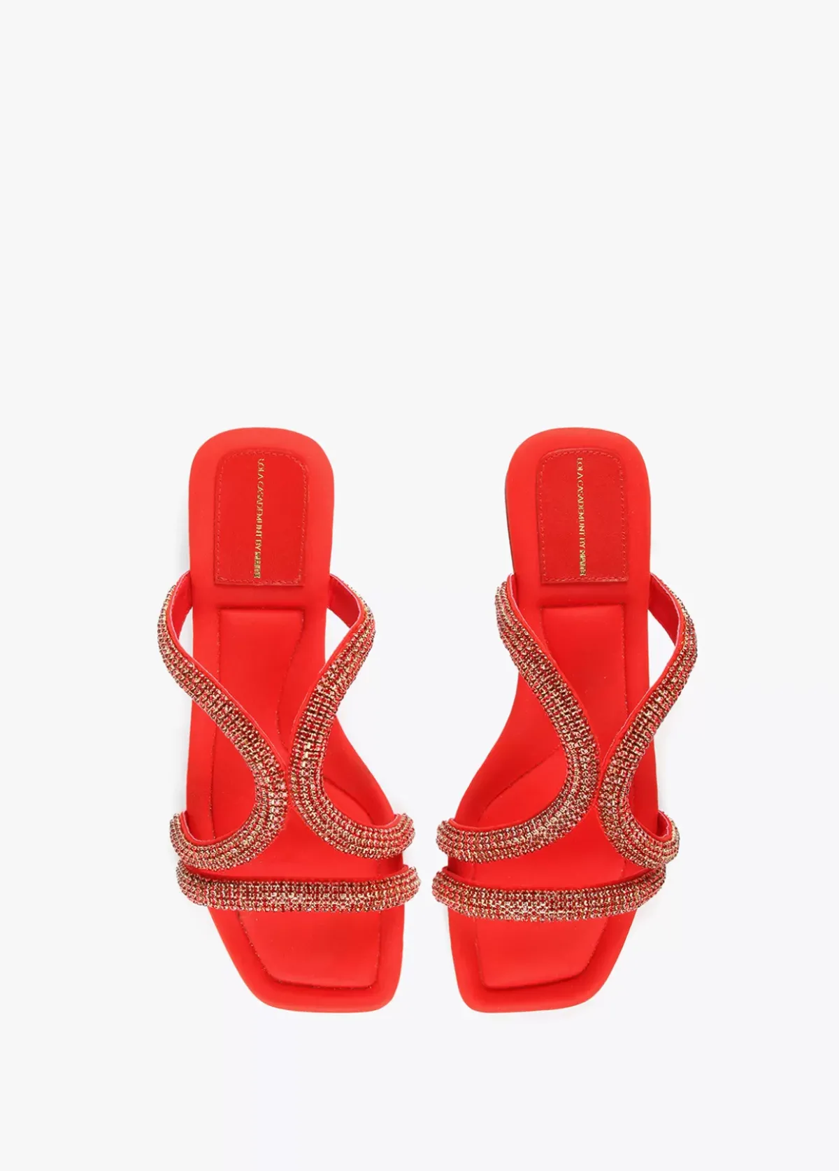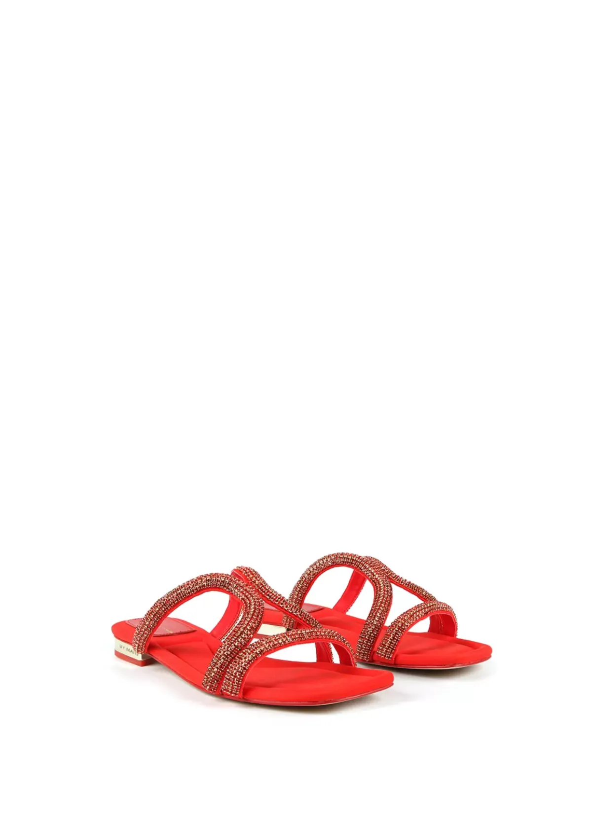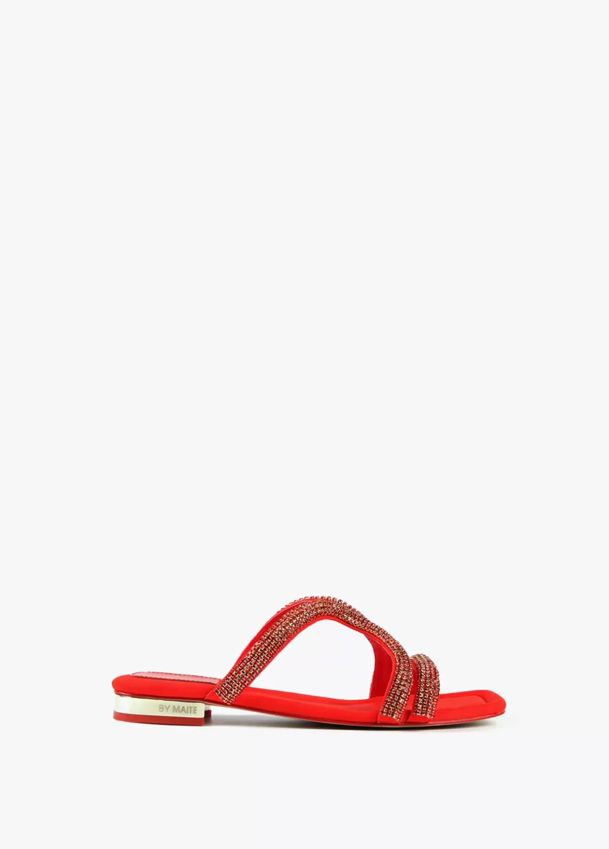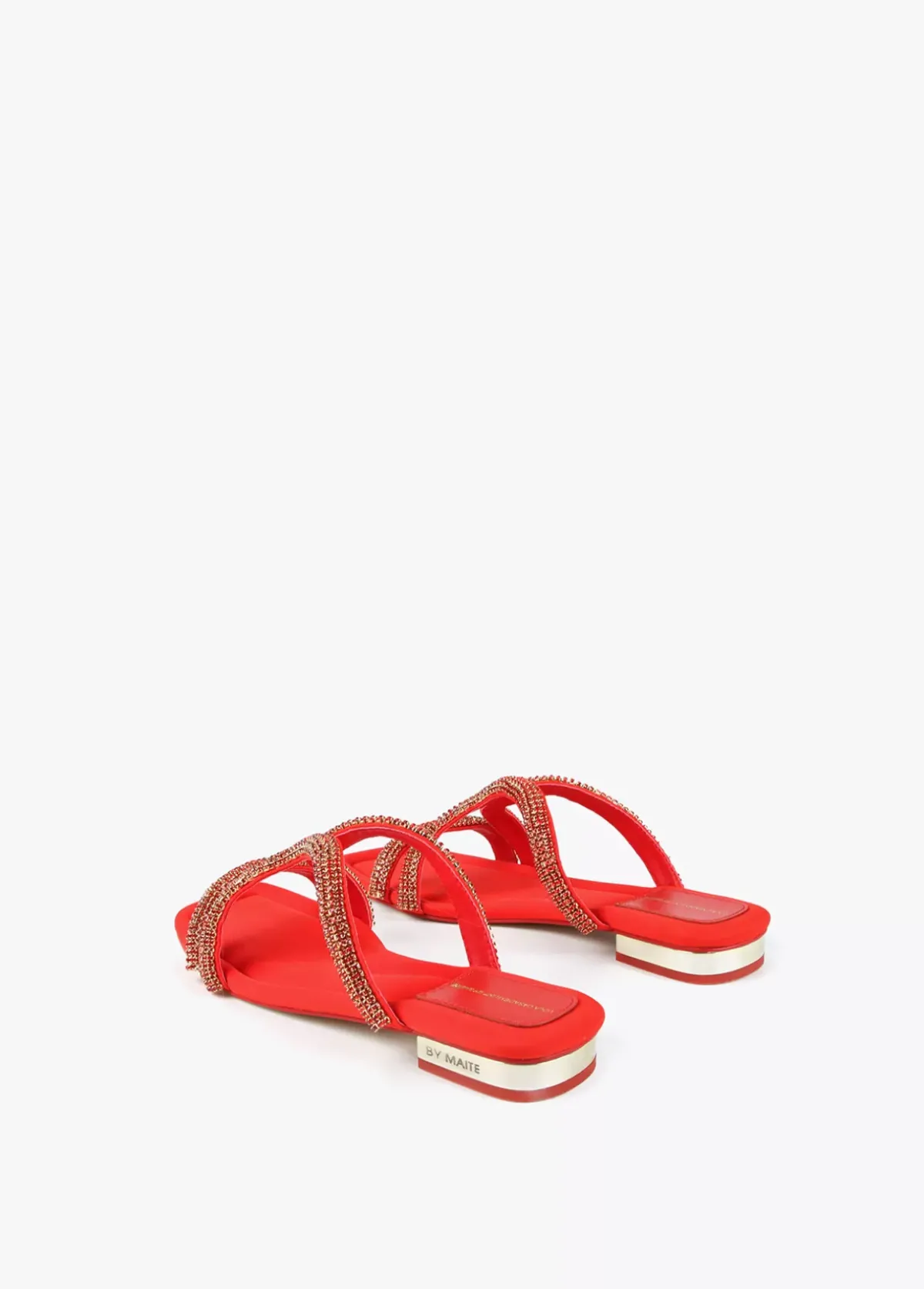 Sandalia plana con detalles en pedrería al tono y tacón dorado. Plantilla y tacón logotipado.
