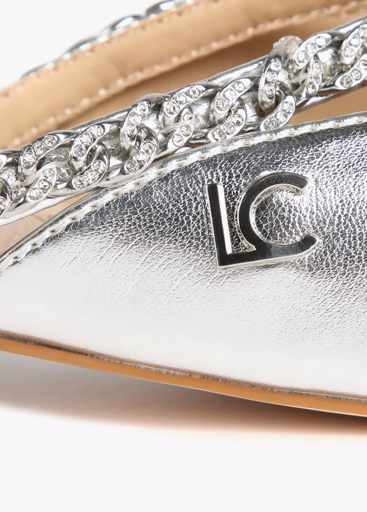 Zapato plano destalonado con punta y tira de pedrería en zona empeine. Suela logotipada y letras logo en laterales.