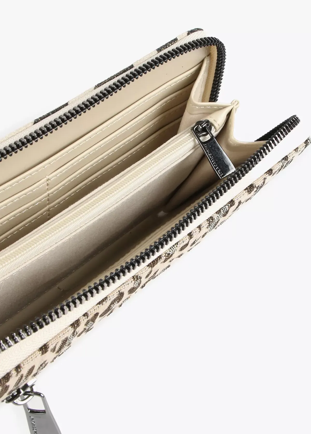 Billetero grande con estampado animal zebra. Cierre con cremallera, bolsillo exterior y letras logo doradas en parte frontal.
