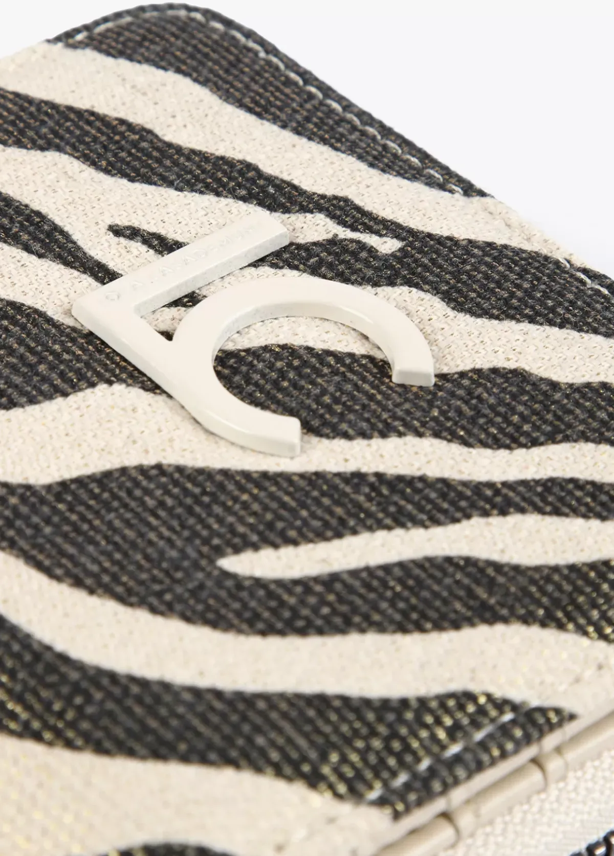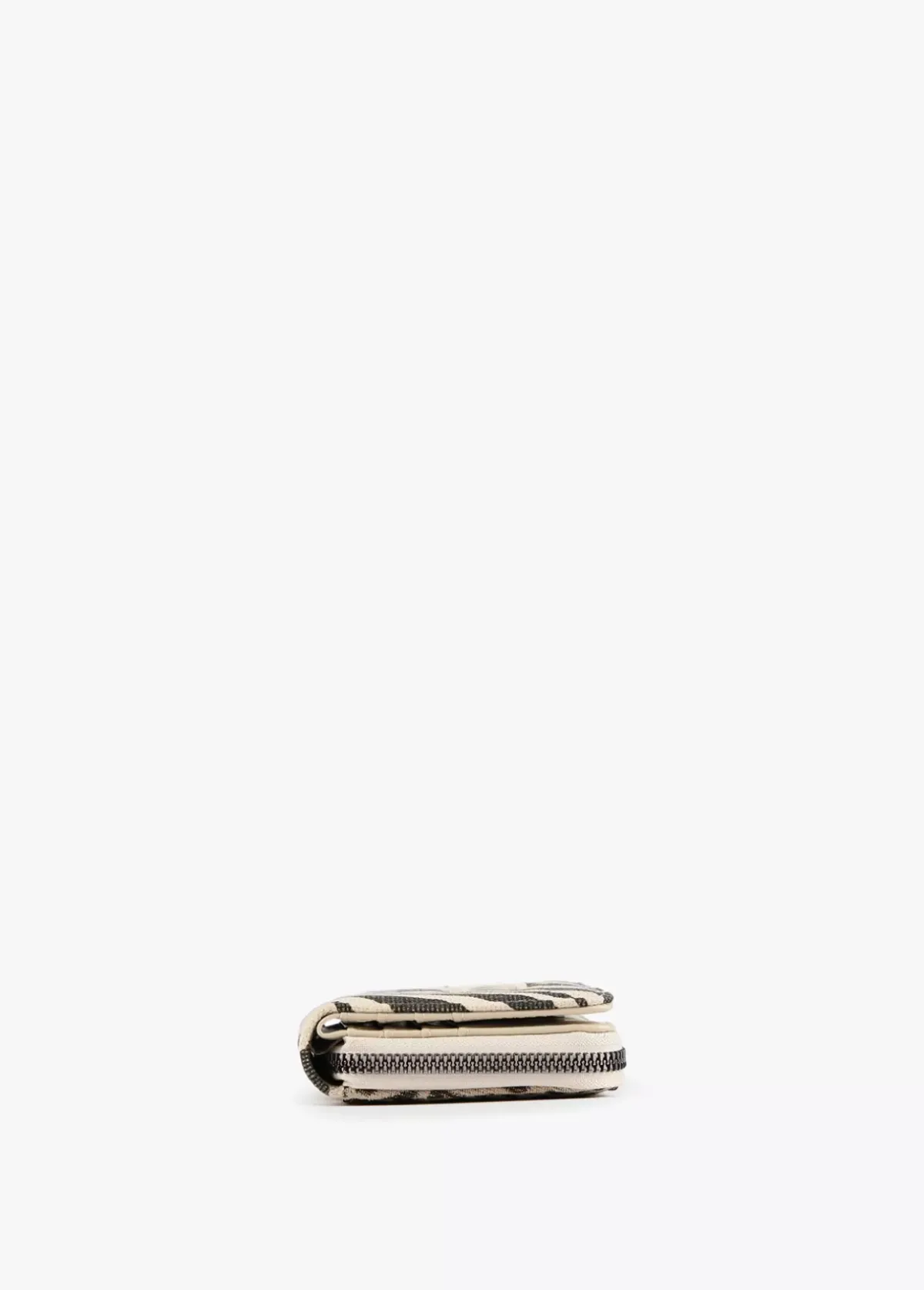 Billetero pequeño de tejido con estampado animal. Asa de mano logotipada, cierre de cremallera y logo lacado en parte frontal.