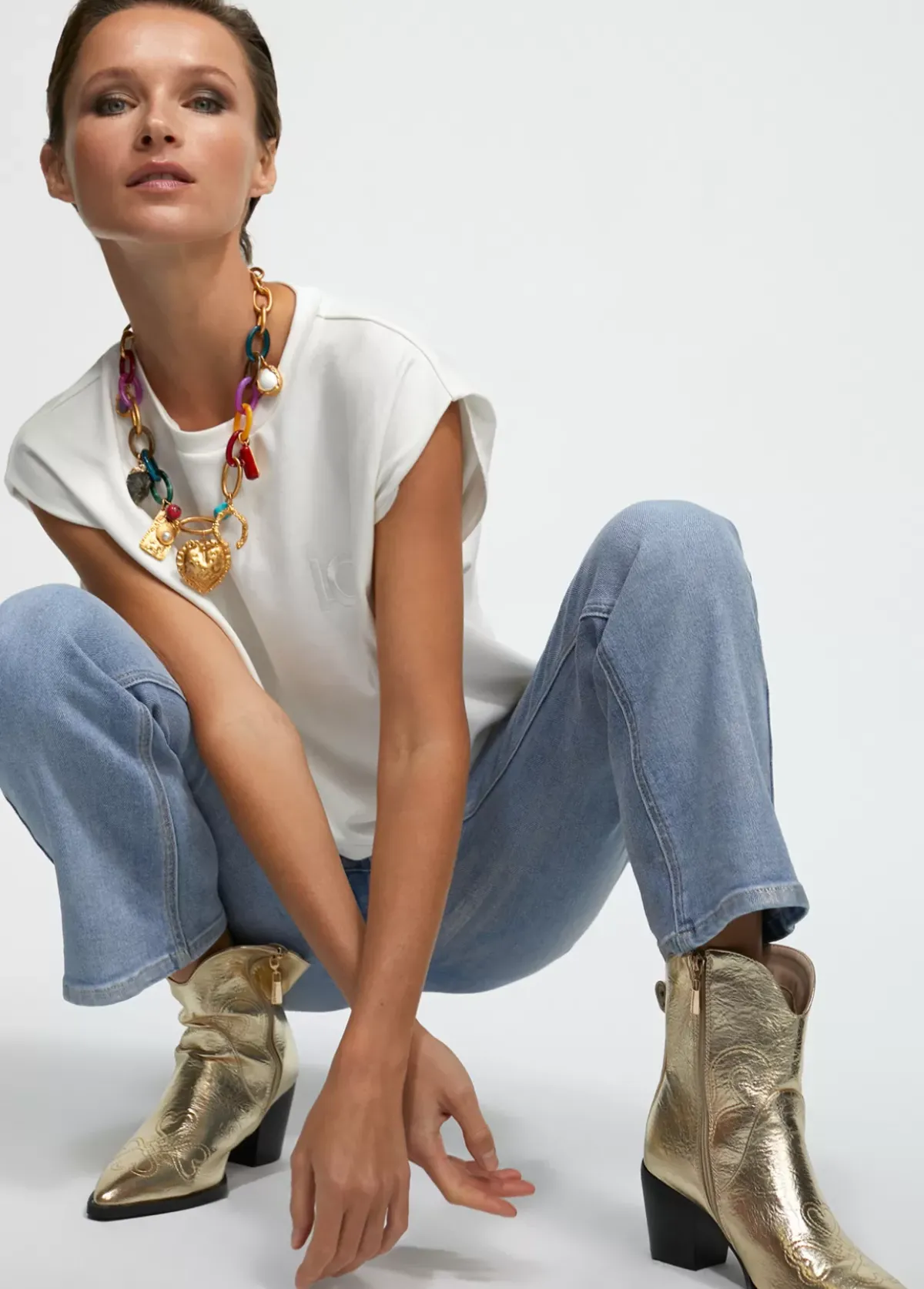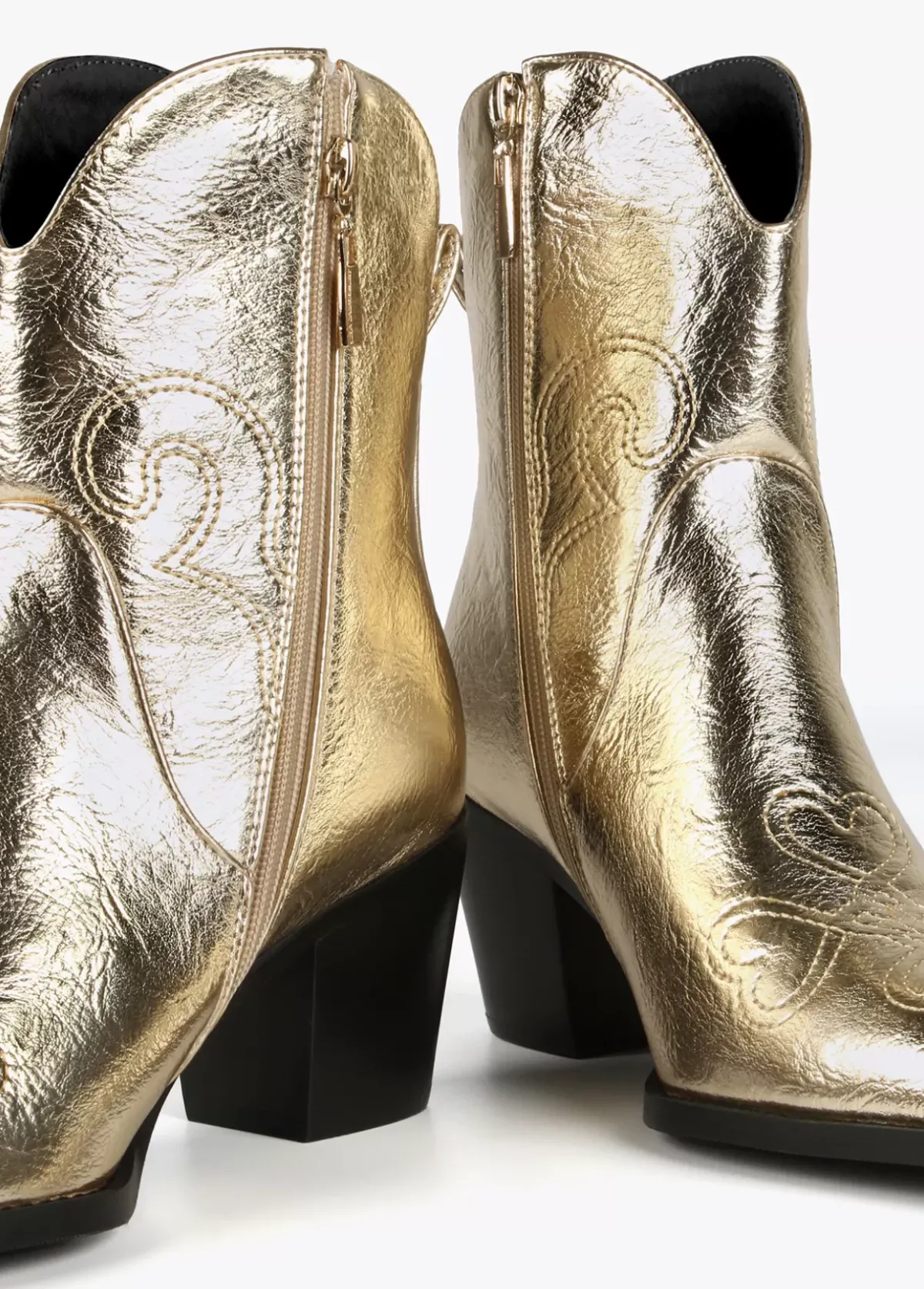 Botín estilo cowboy metalizado pespunteado y con cremallera en los laterales. Tira trasera logotipada y letras logo doradas.