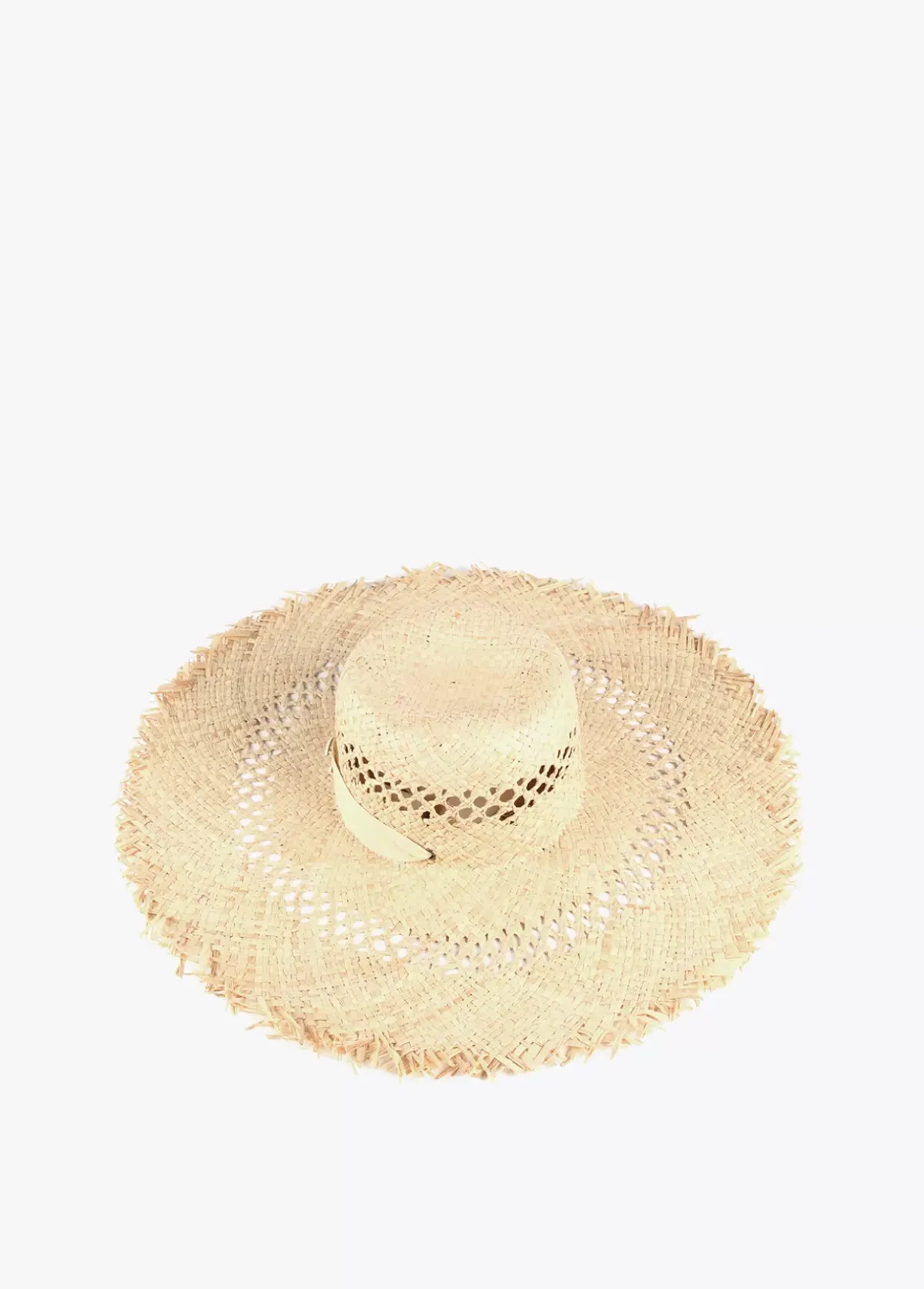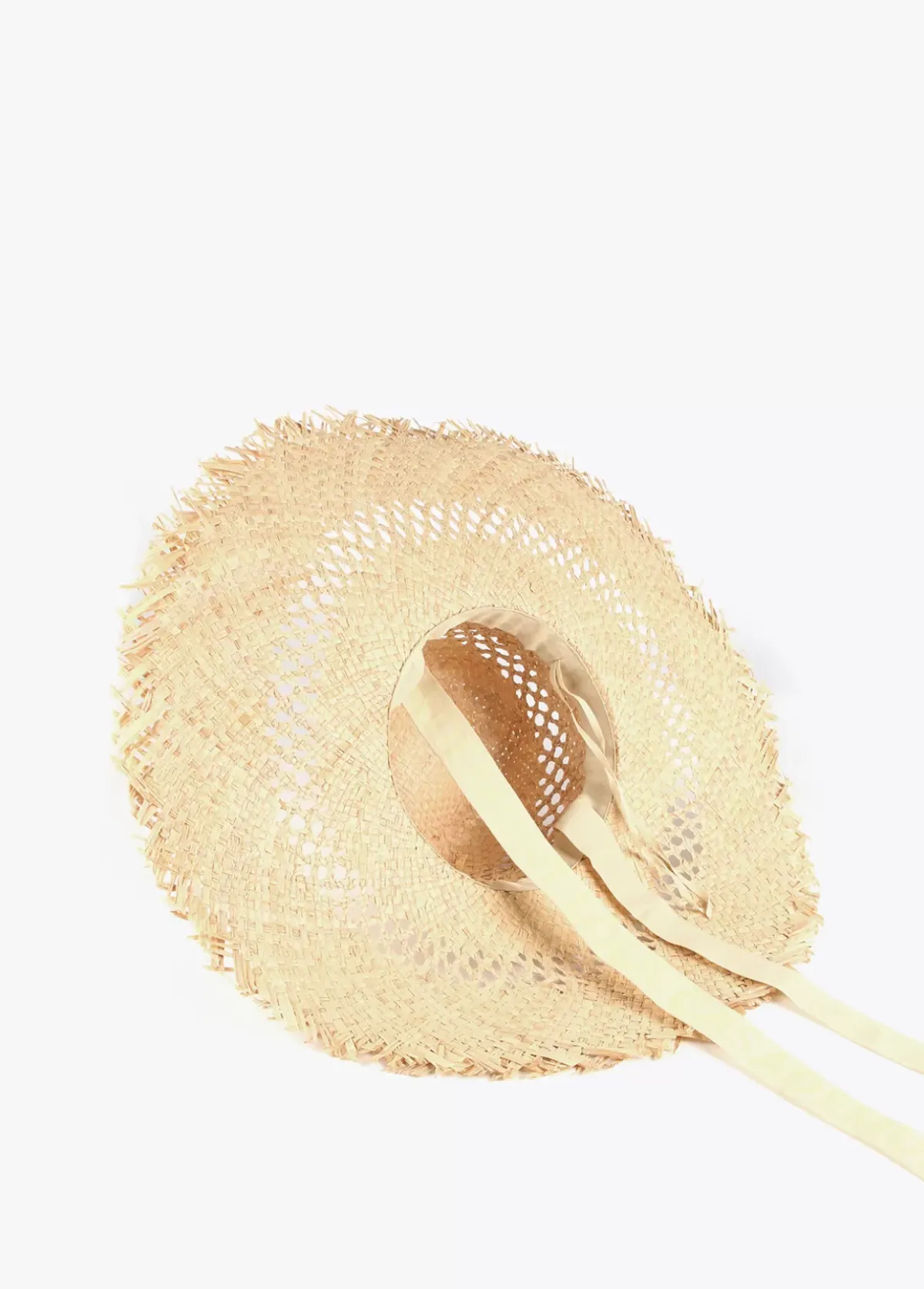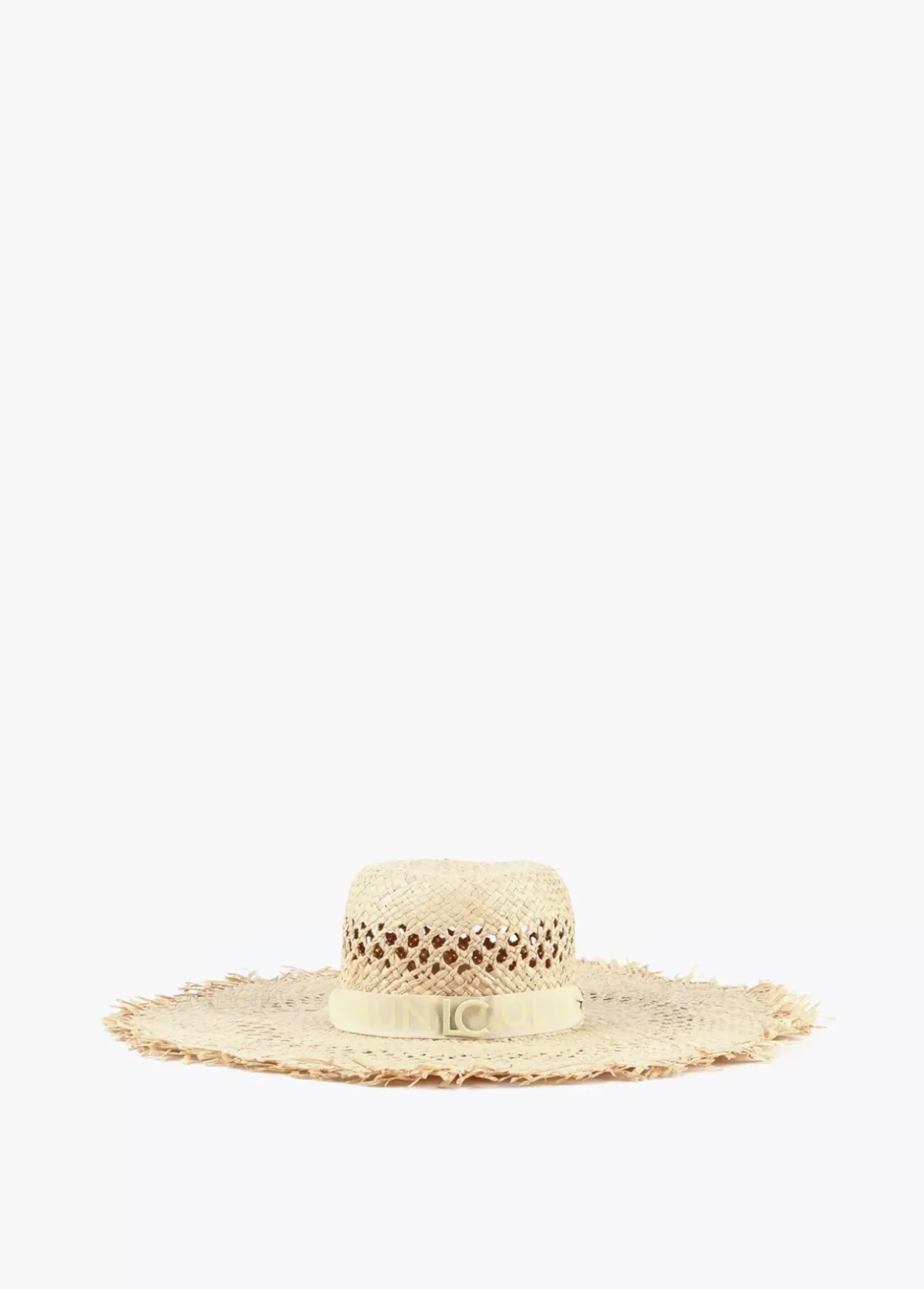 Pamela efecto ráfia monocolor con logo lacado al tono en parte frontal y flecos . Cintas logotipadas a modo de sujeción.