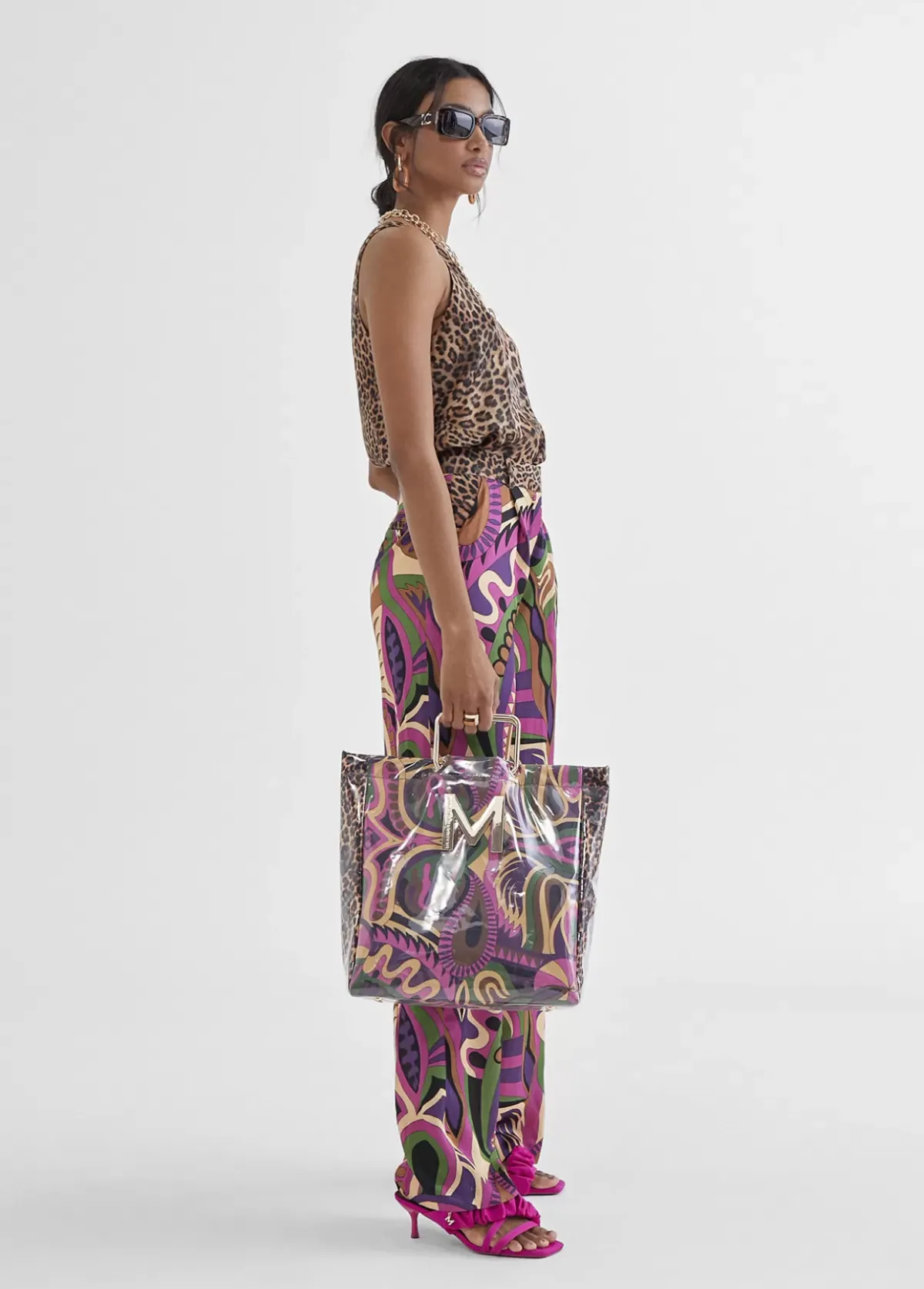Pantalón palazzo fluido en estampado multicolor. Pinzas frontales y bolsillos laterales. Cinturilla en animal print. Cierre con cremallera y gancho metálico.