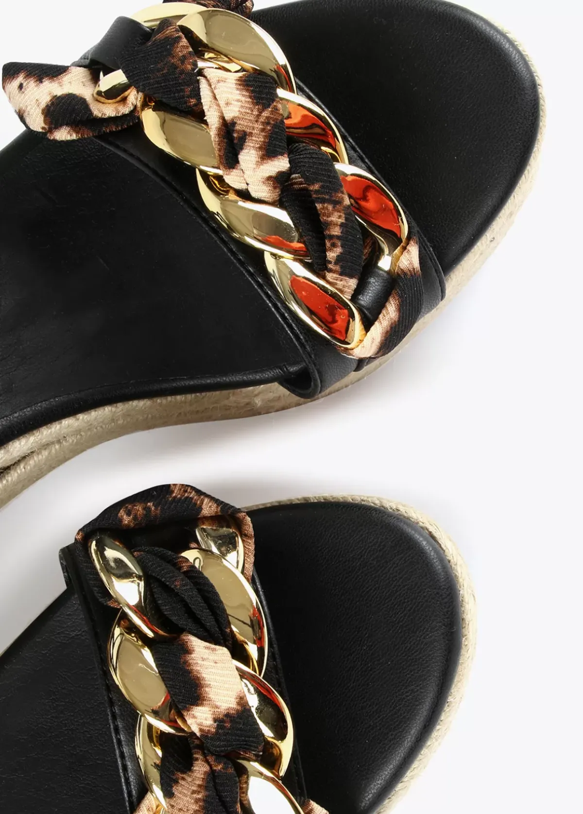 Sandalia cuña con animal print combinada y detalles en color dorado. Plantilla logotipada.