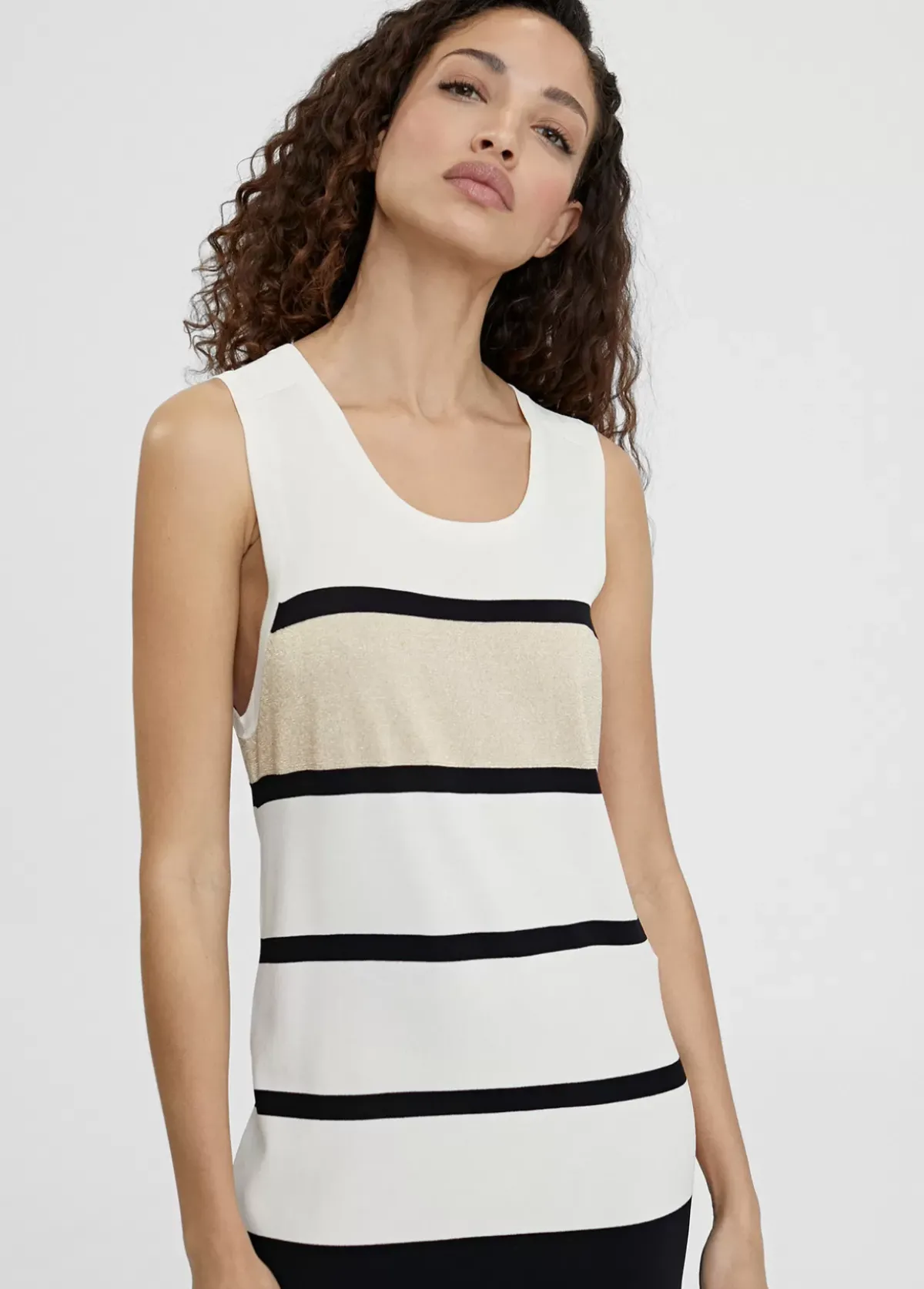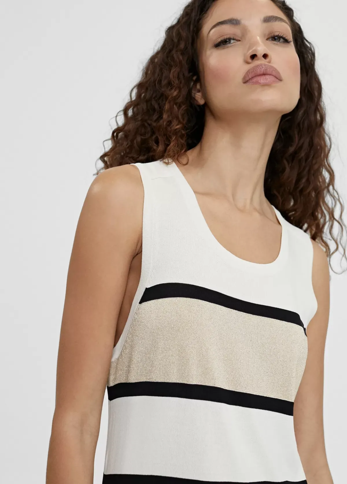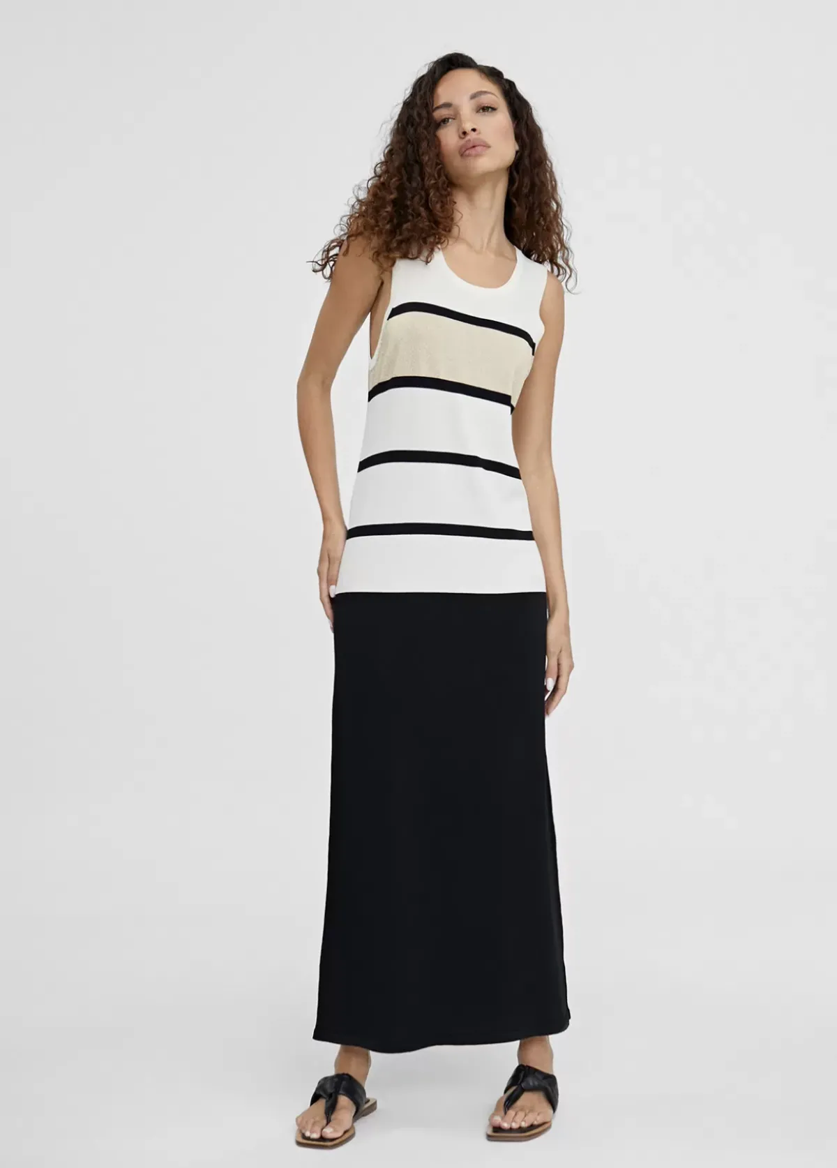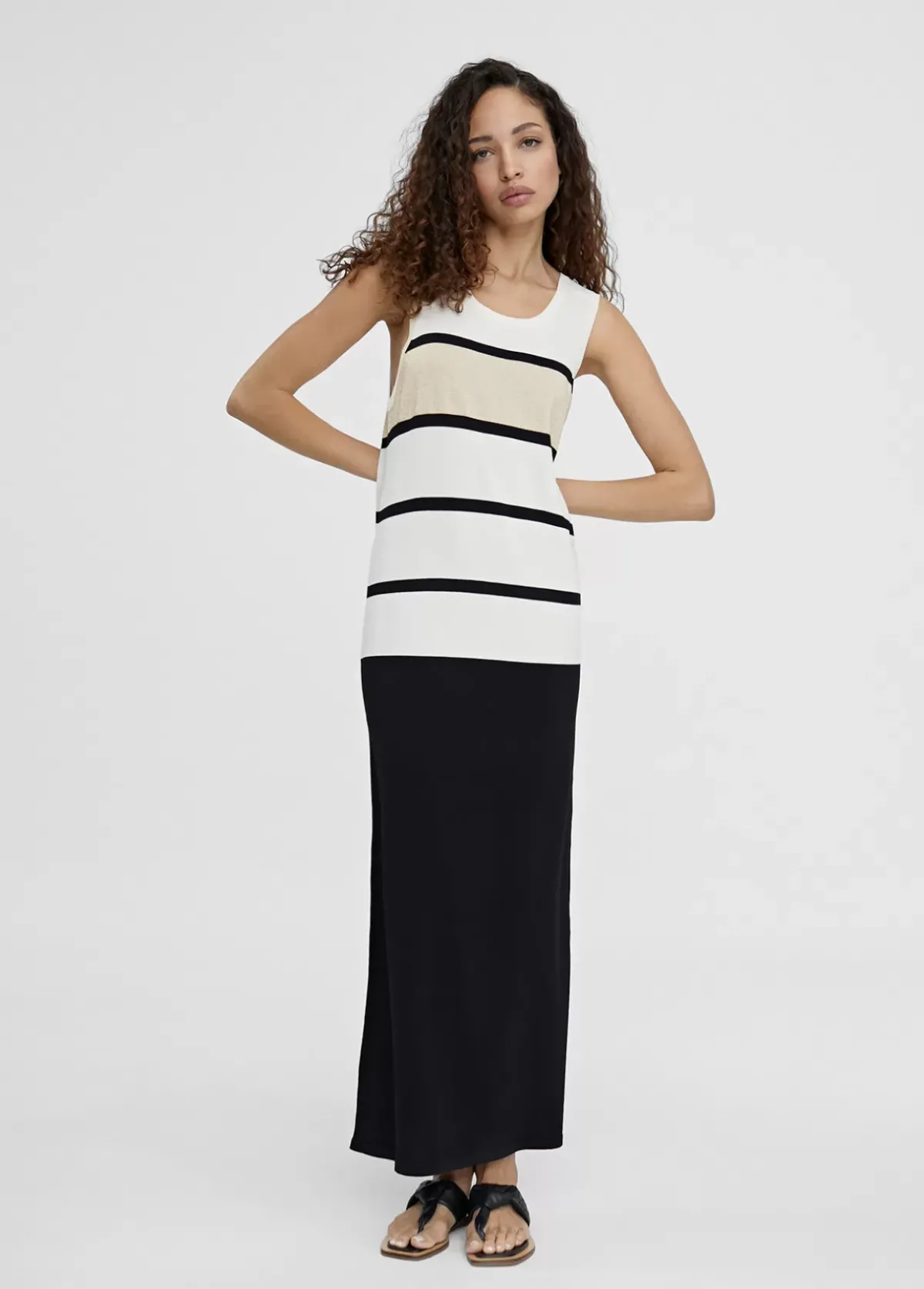 Vestido largo de punto. Rayas anchas en cuerpo y liso en falda. Escote semi redondeado y manga sisa. Detalle de botones dorados en hombro.