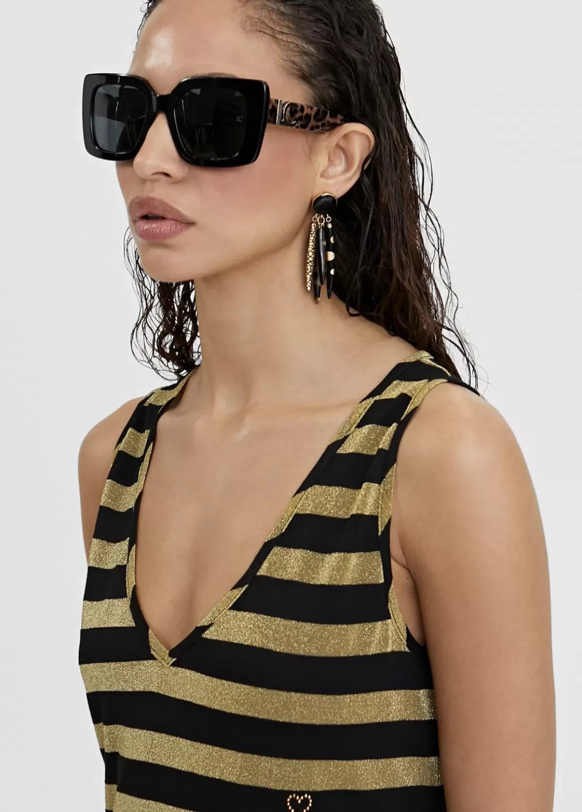 Vestido largo de rayas en punto. Escote pico y tirante sisa. Tejido en lúrex.