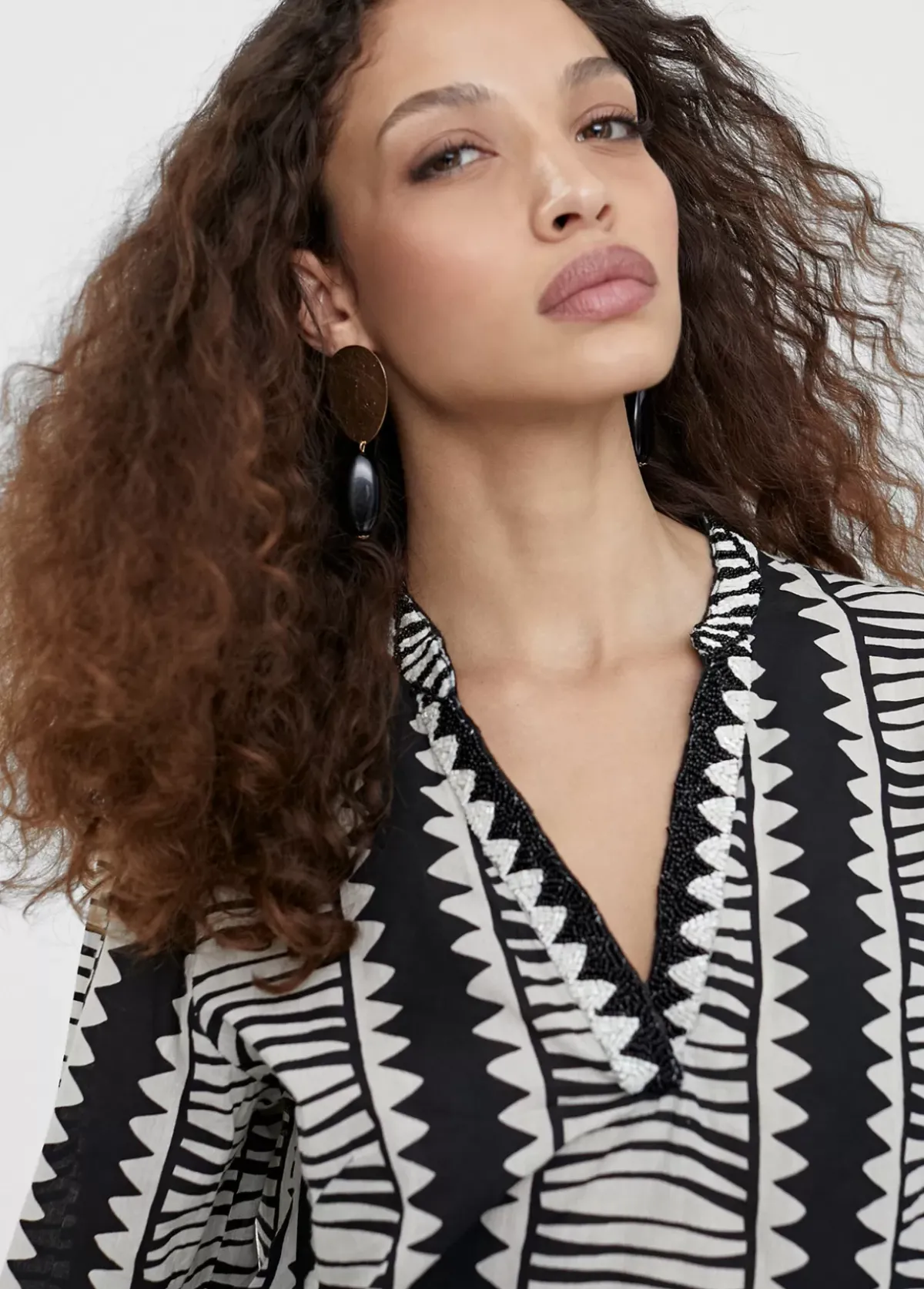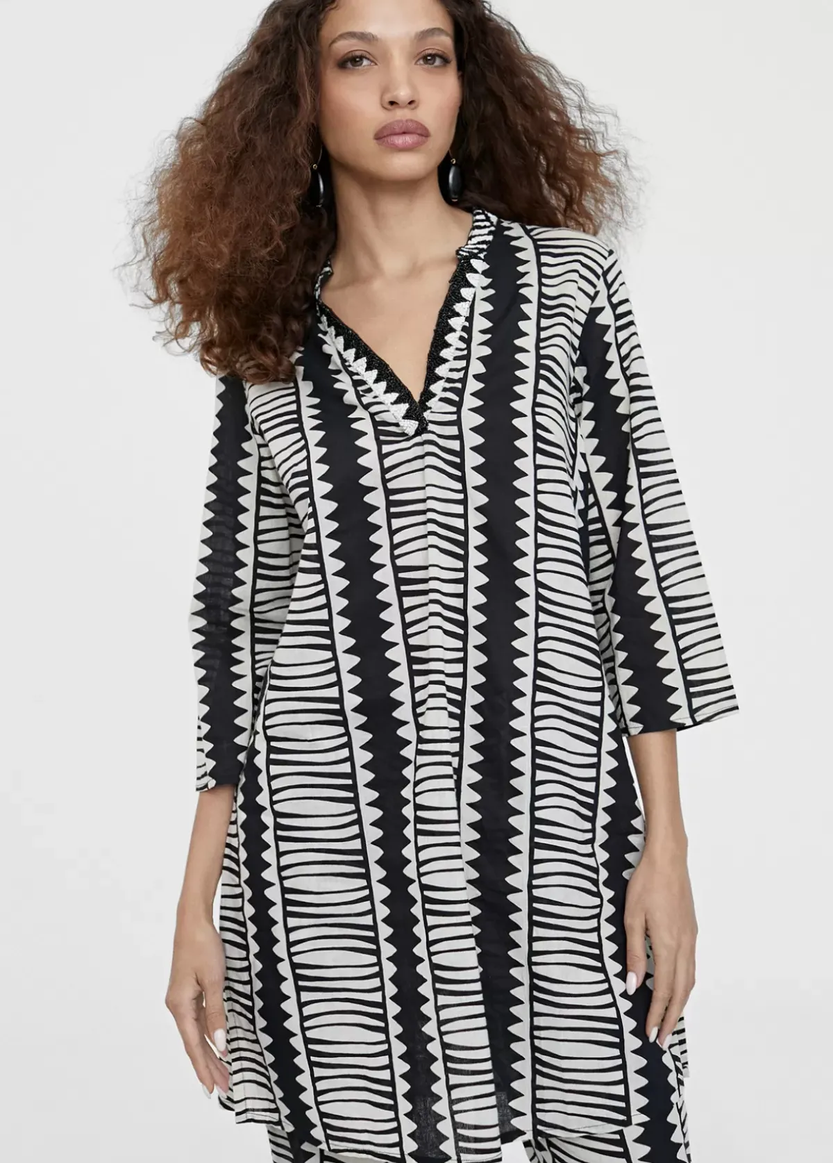 Caftan corto estilo camisero en tejido estampado étnico. Cuello mao y escote pico bordado. Media maga. Aberturas en bajo.