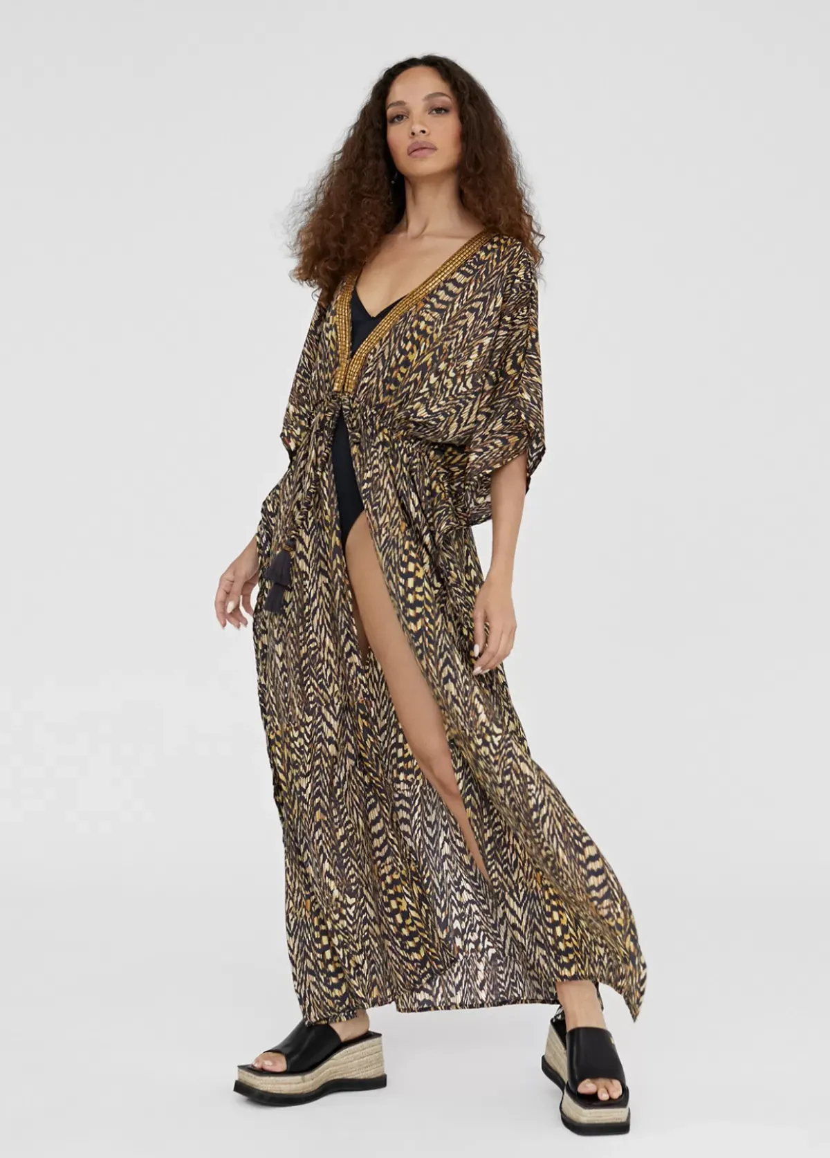 Caftan largo y abierto. Estampado animal print. Escote pico bordado. manga ancha y fruncido en cintura.