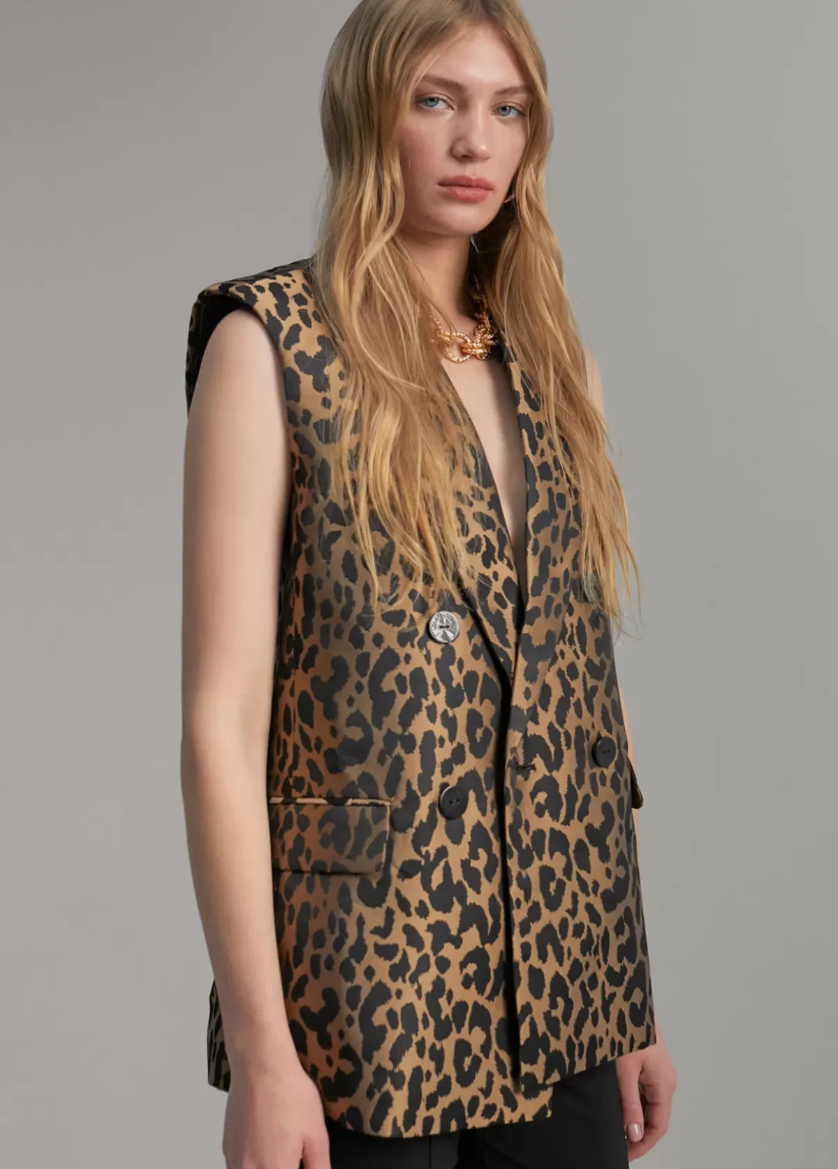 Chaleco recto en estampado animal print. Cuello solapa y hombreras. Botones centrales y tapetes laterales.