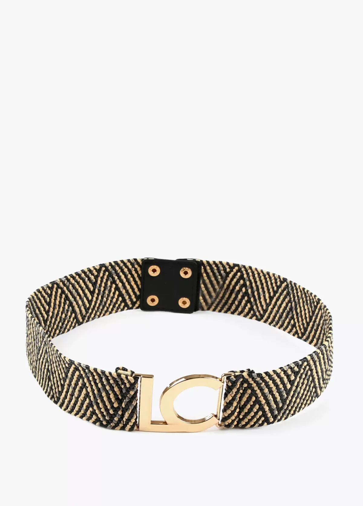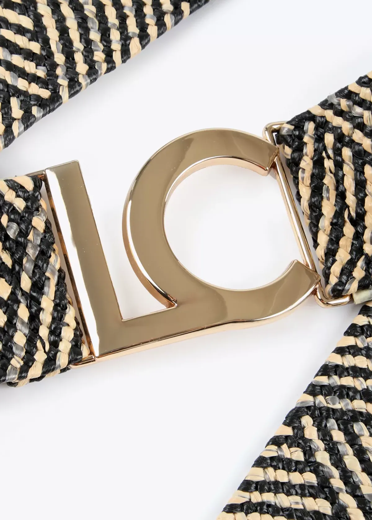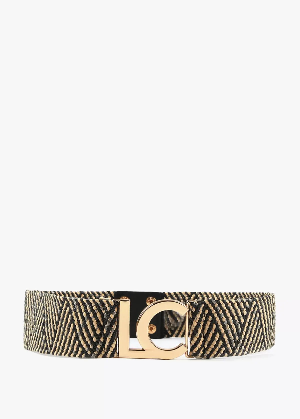 Cinturón bicolor efecto rafia elástica y logo dorado en parte frontal. Cierre trasero ajustable.