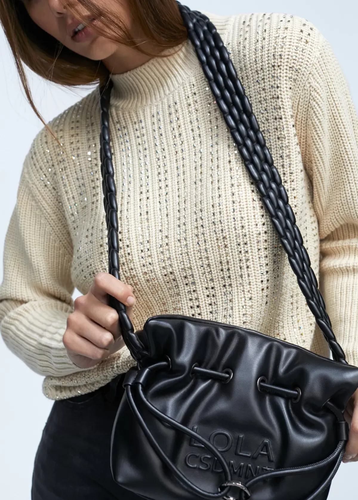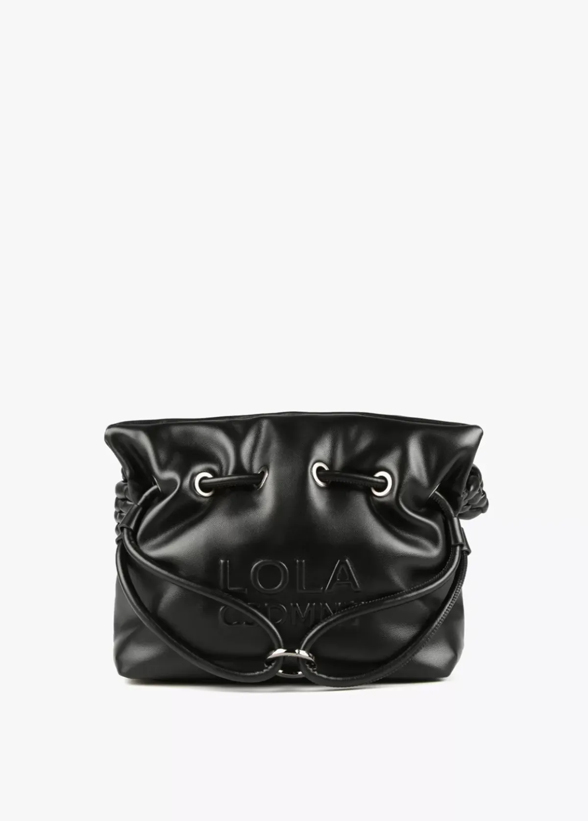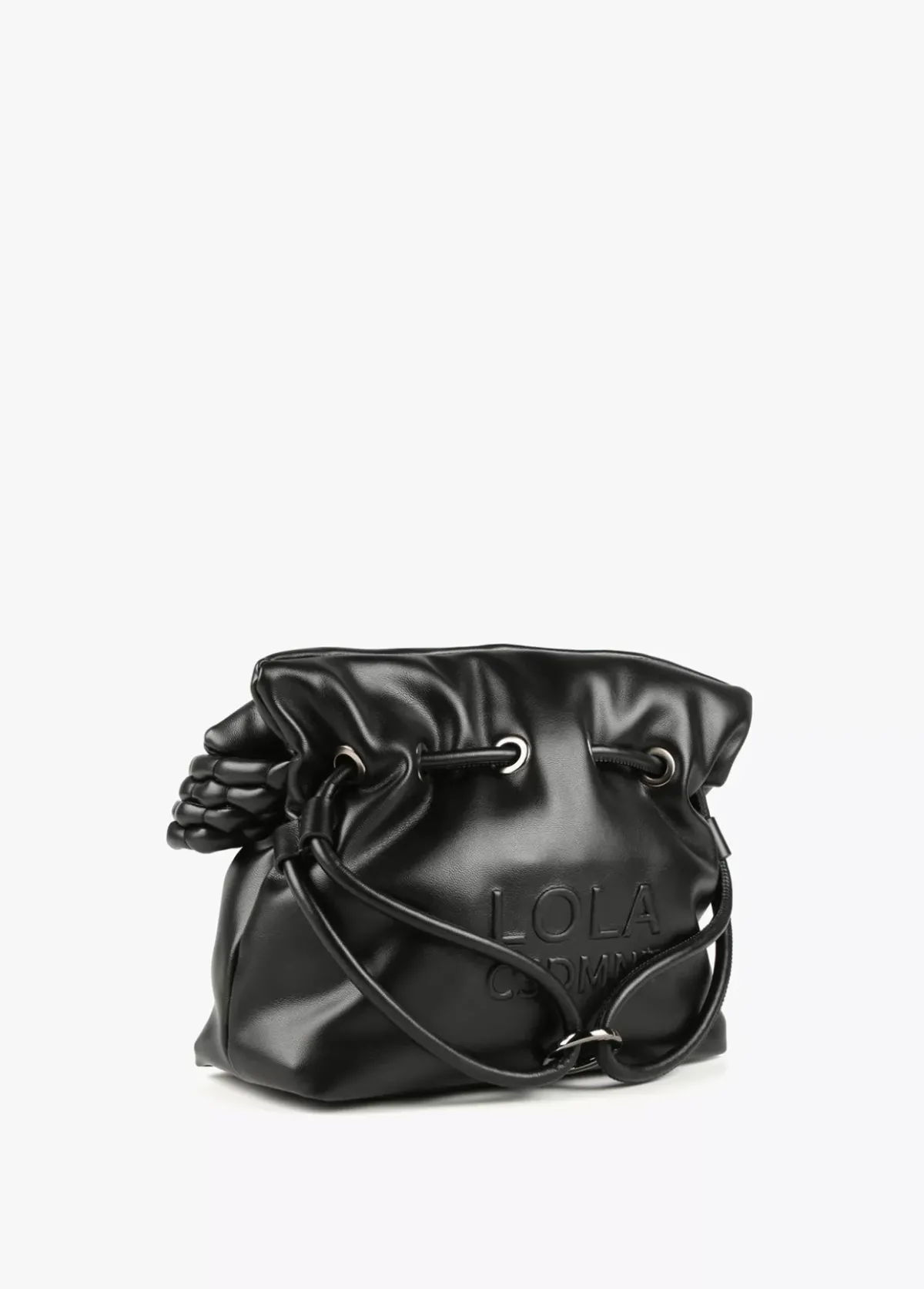 Bolso tipo bandolera en efecto piel con logo en relieve en parte frontal. Asa bandolera trenzada, cordón ajustable y cierre con botón imantado.