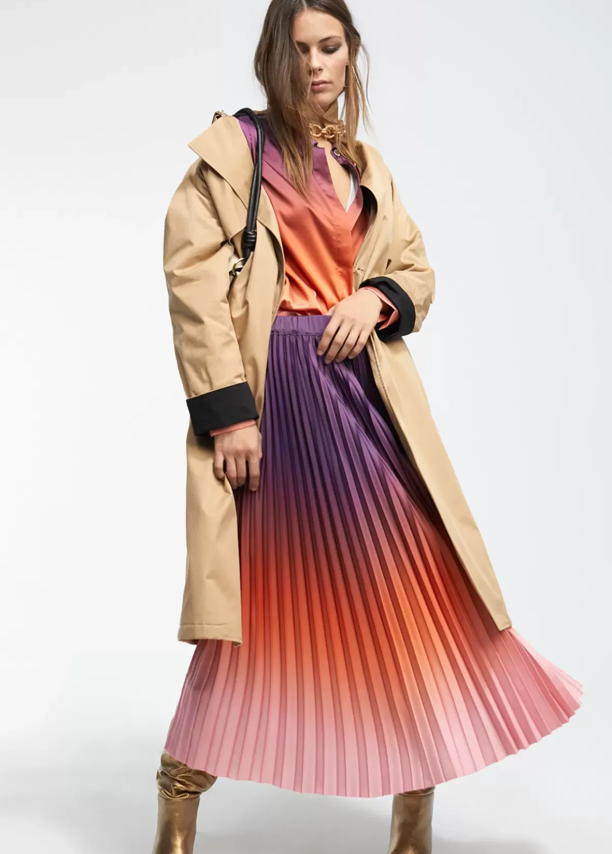 Falda plisada en color degradé. Cintura ajustable y de largo midi.