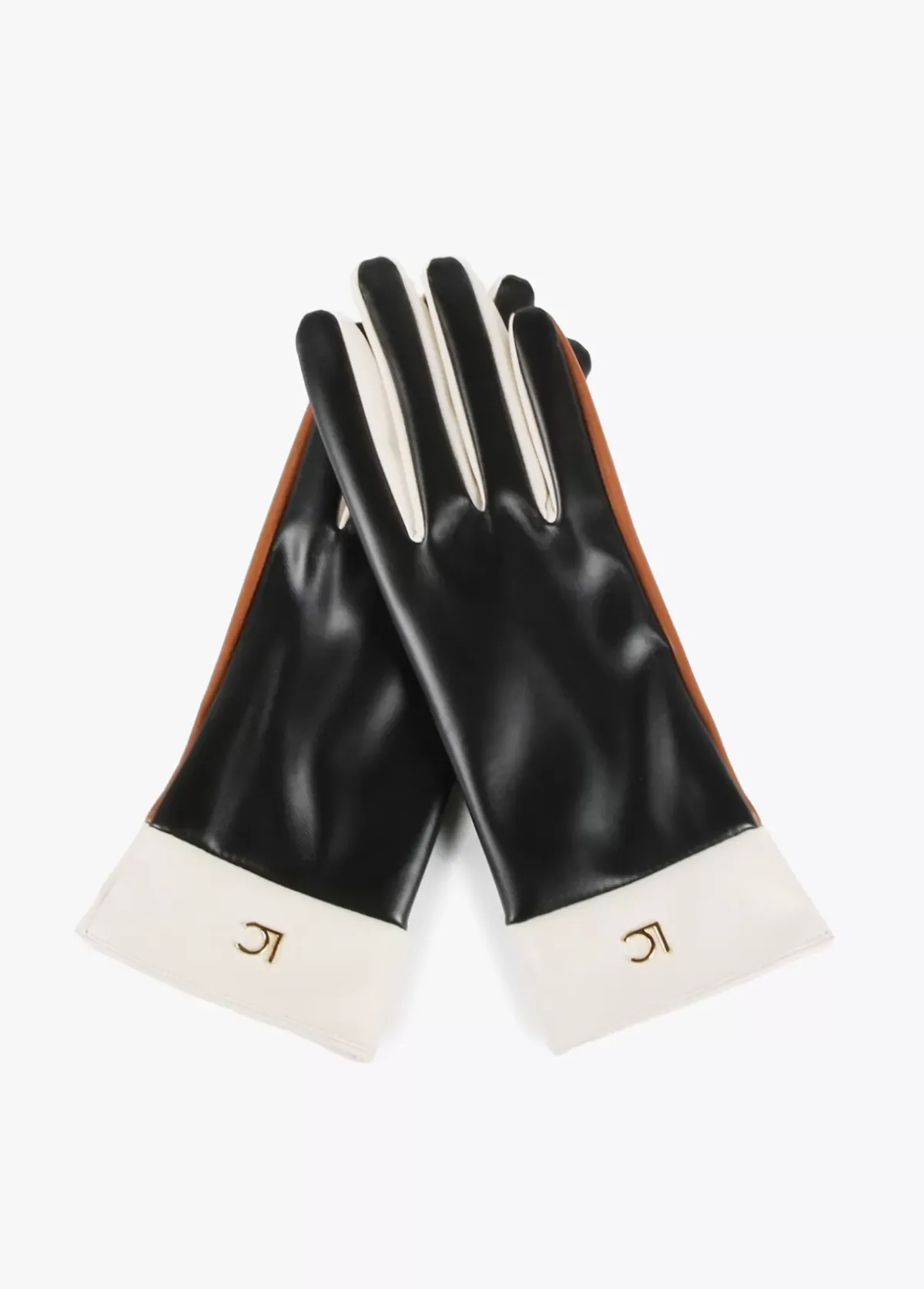 Guantes en efecto piel en tres colore combinados. Letra logo doradas en parte frontal.