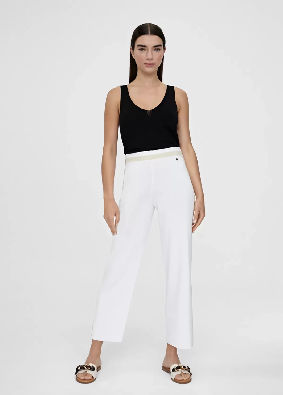Pantalón ancho de punto y de largo tobillero. Cintura elástica. Banda a contraste en cintura y perneras.