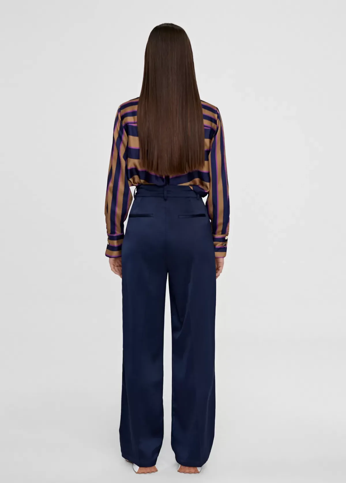 Pantalón recto y fluido con pinzas frontales. Cerrado con cremallera y botón dorado. Bolsillos laterales.