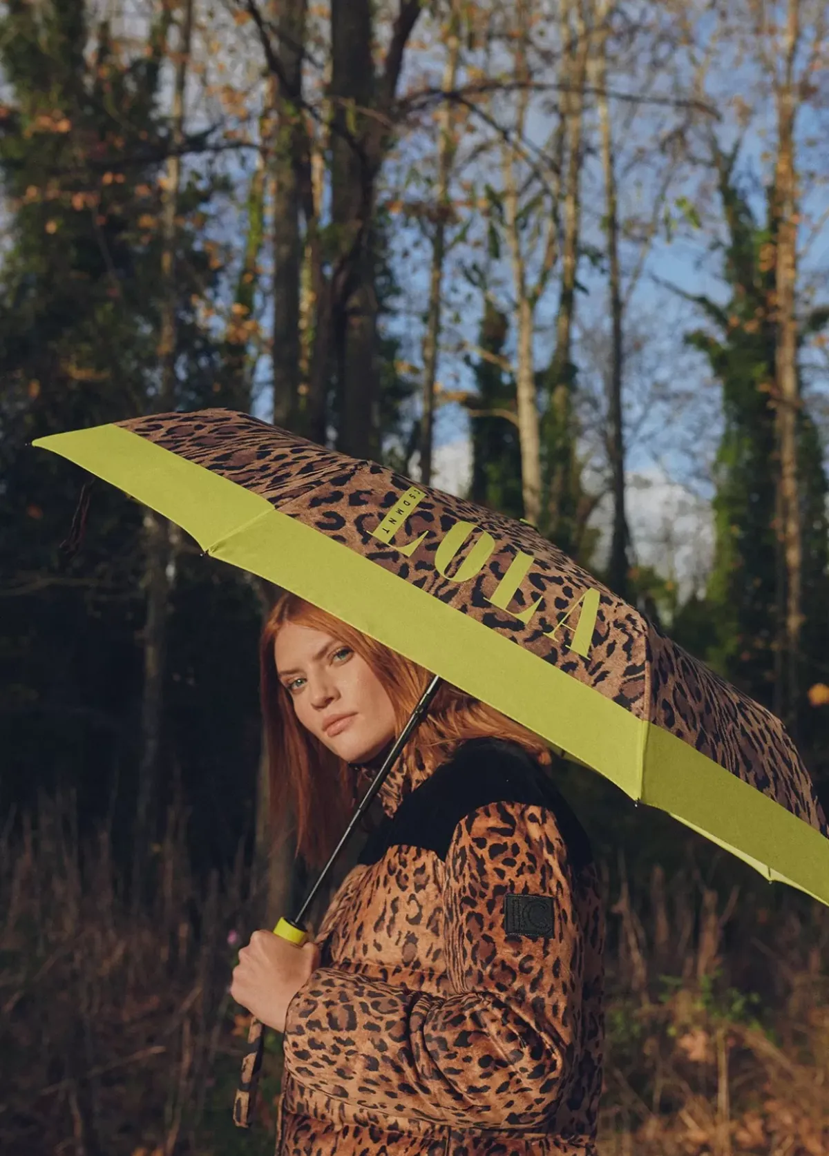 Paraguas logotipado en color lima sobre fondo con estampado animal leopardo. Apertura automática en 3 secciones y varillaje de aluminio. Funda protectora con el mismo estampado y asa de mano.