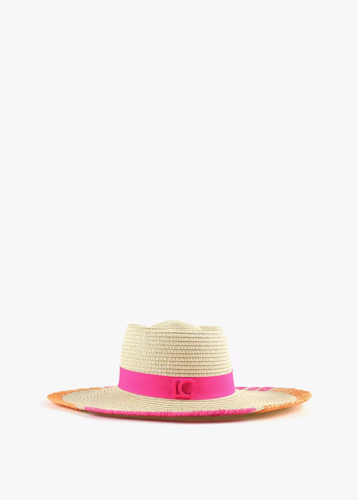 Sombrero en tonos naturales con detalles bordados de color. Logo lacado en cinta decorativa.