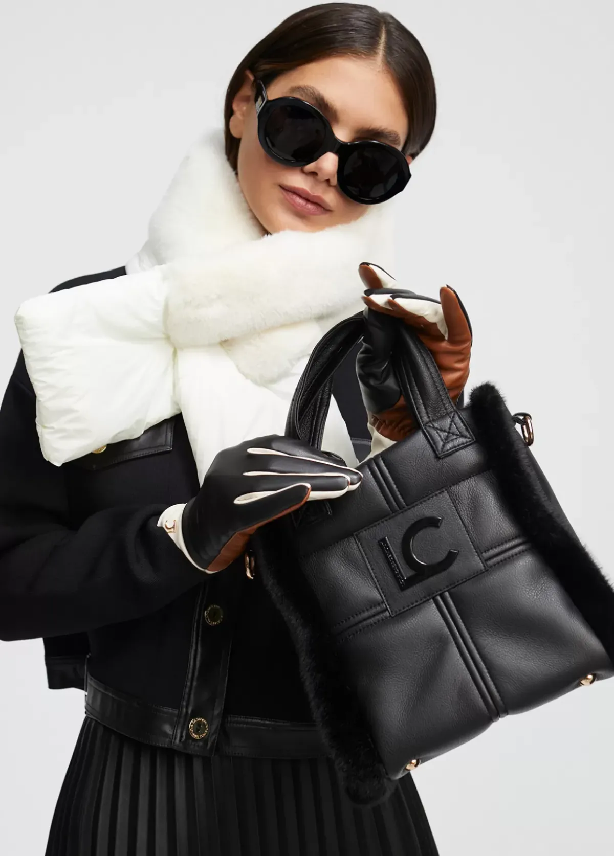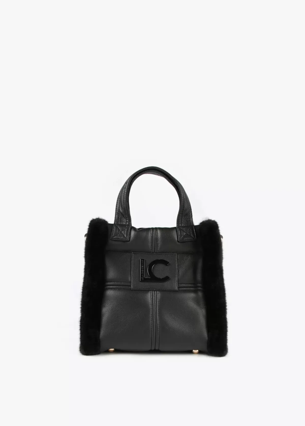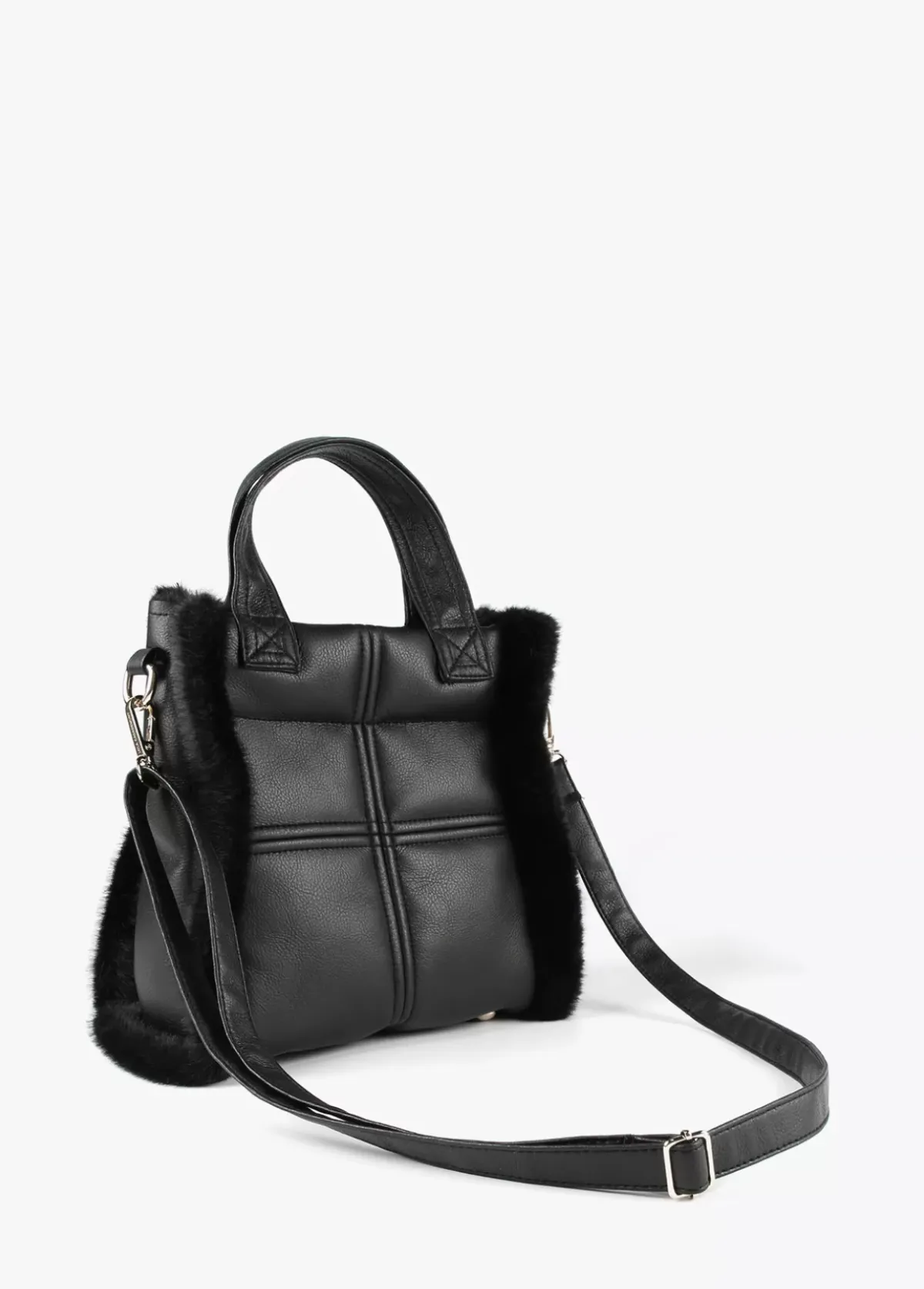 Bolso tipo bandolera en efecto piel y efecto pelo combinados. Asas de mano y asa bandolera ajustable y extraíble. Cierre con botón imantado y logo lacado en parte frontal.