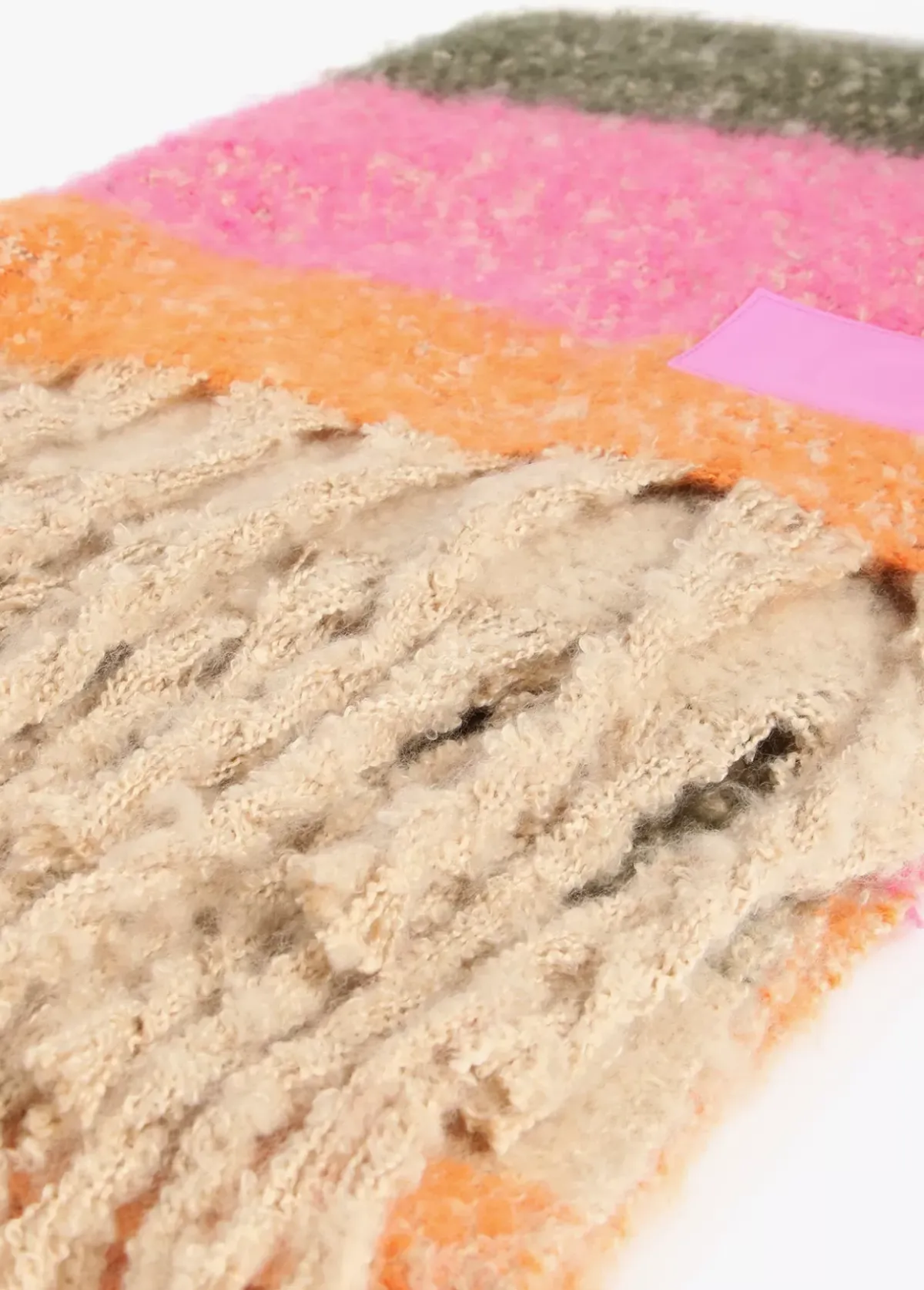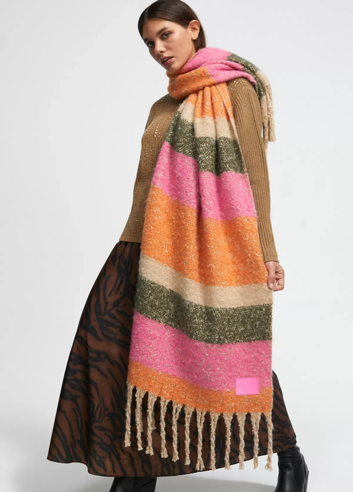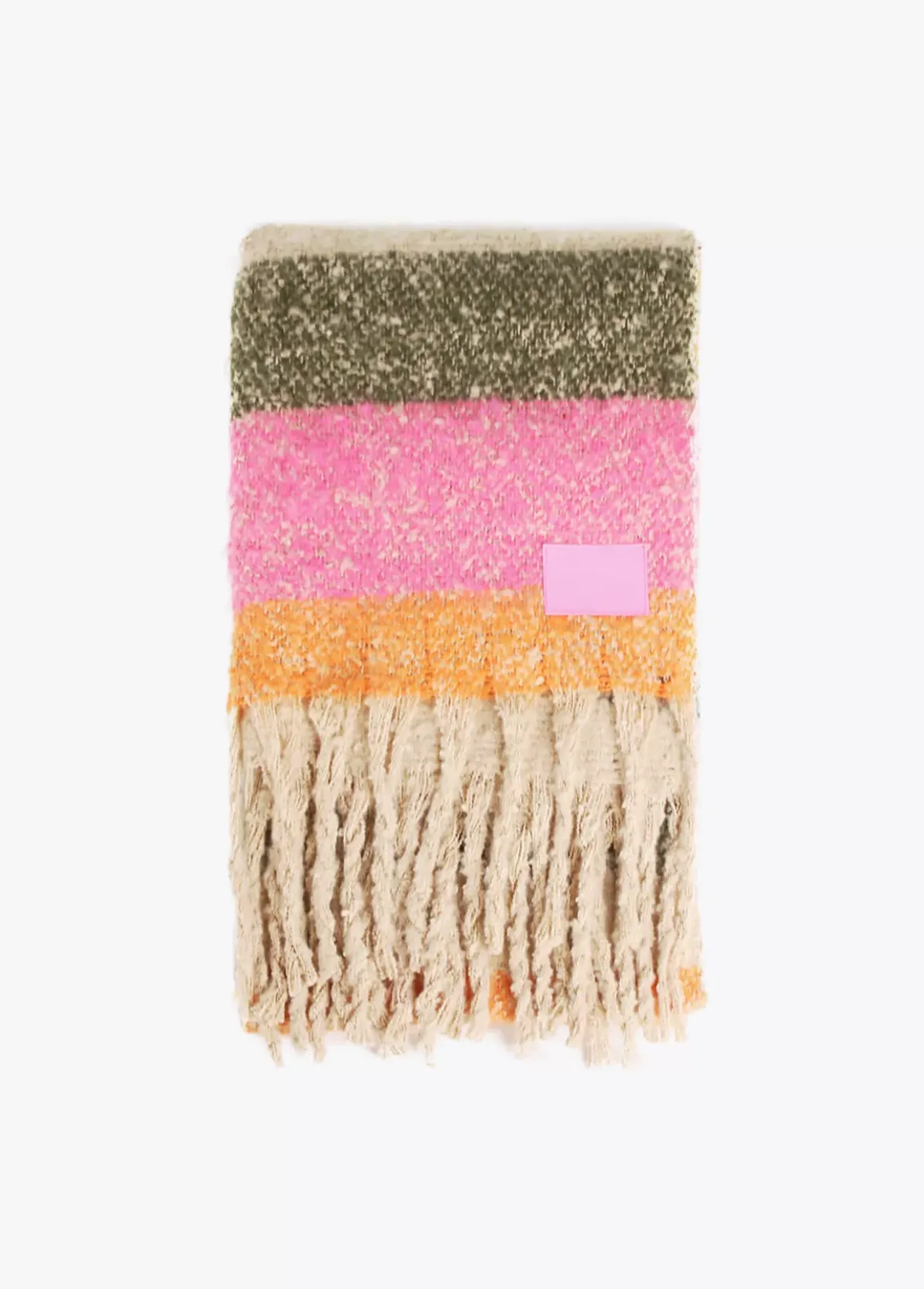 Bufanda de rayas gruesas multicolores con flecos en los extremos.