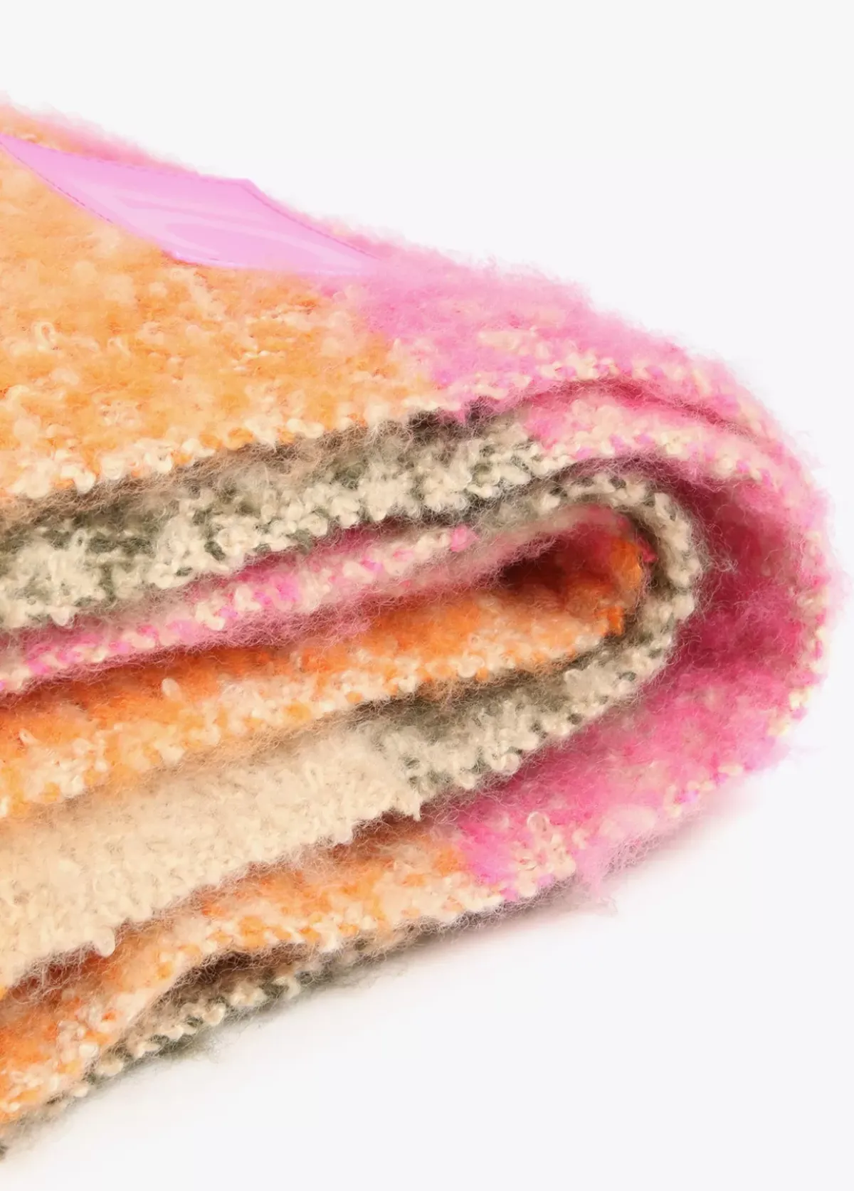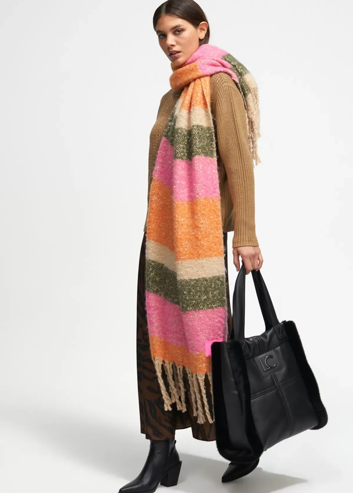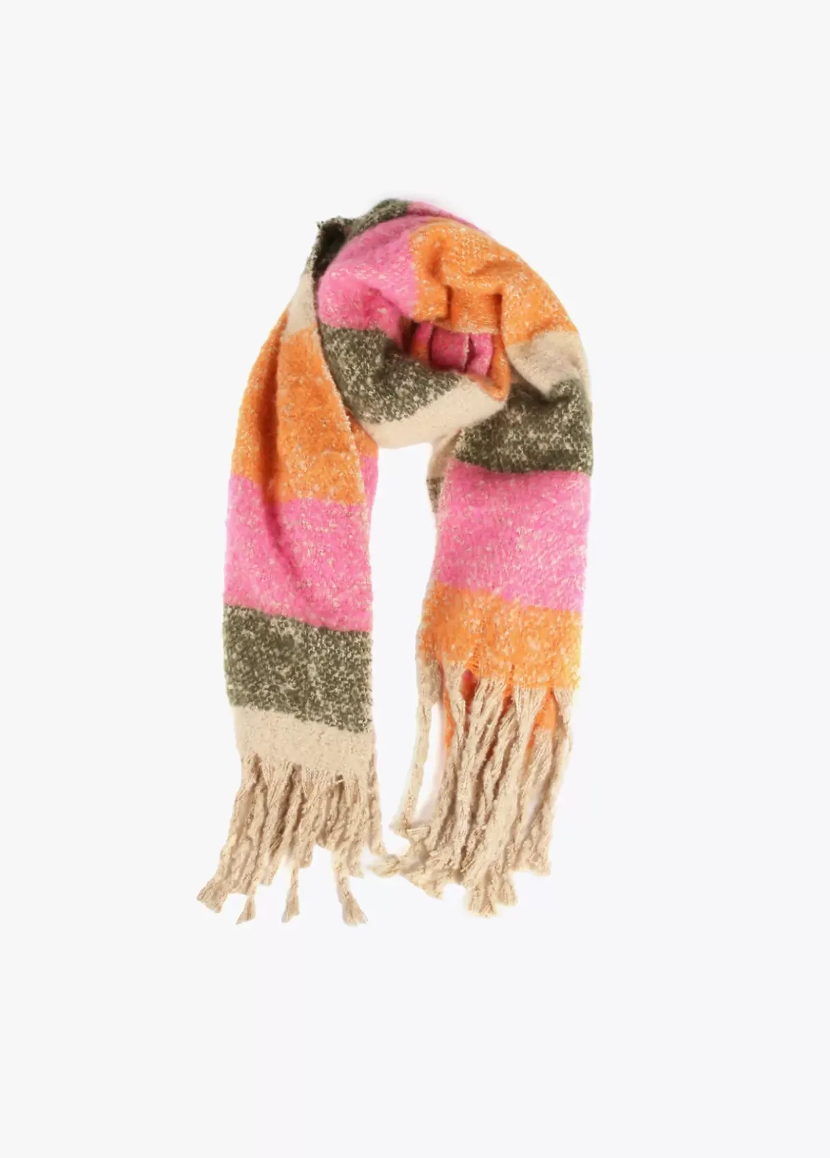 Bufanda de rayas gruesas multicolores con flecos en los extremos.