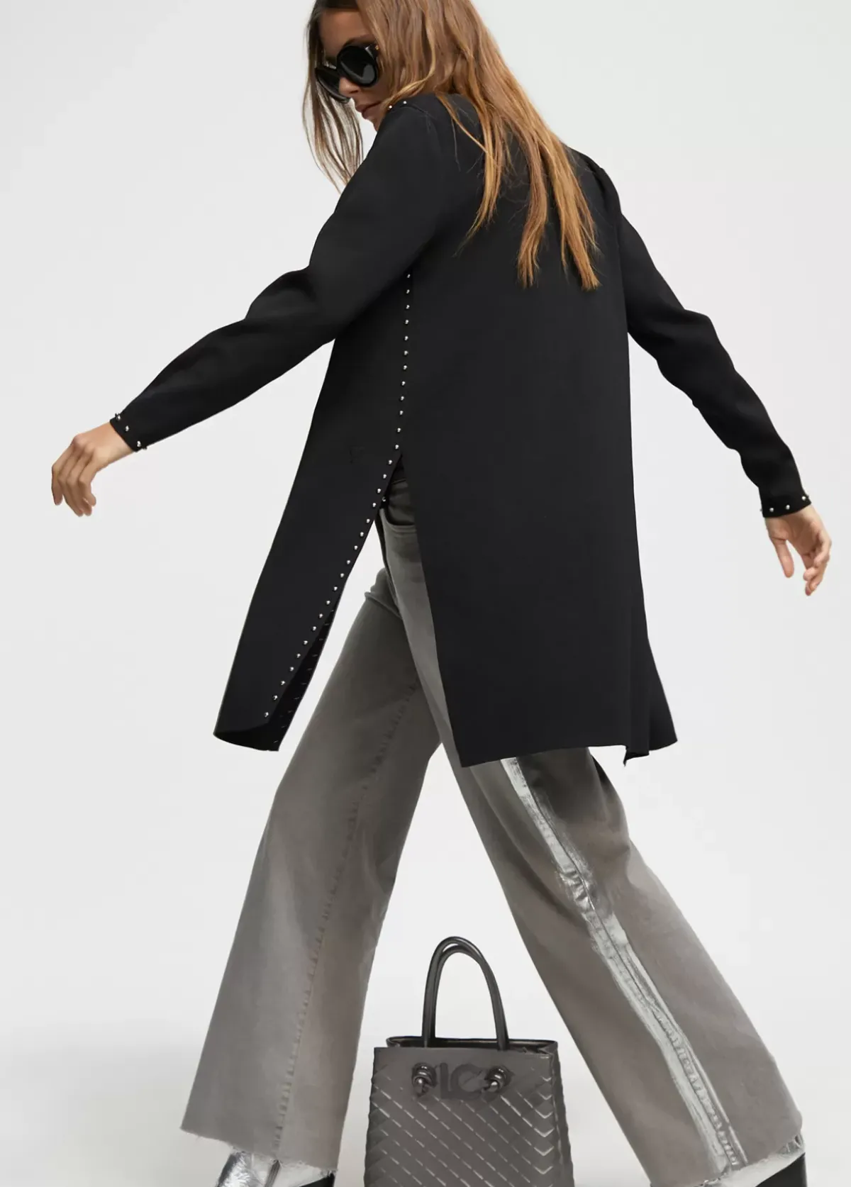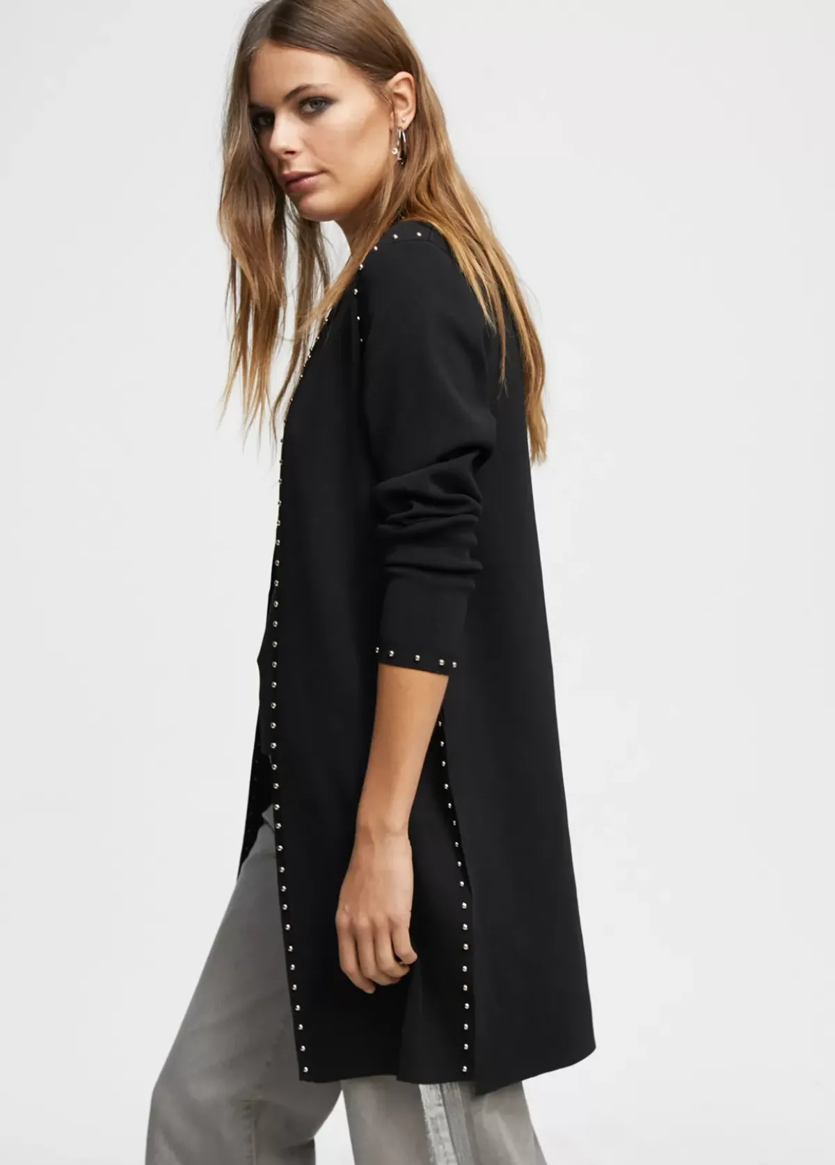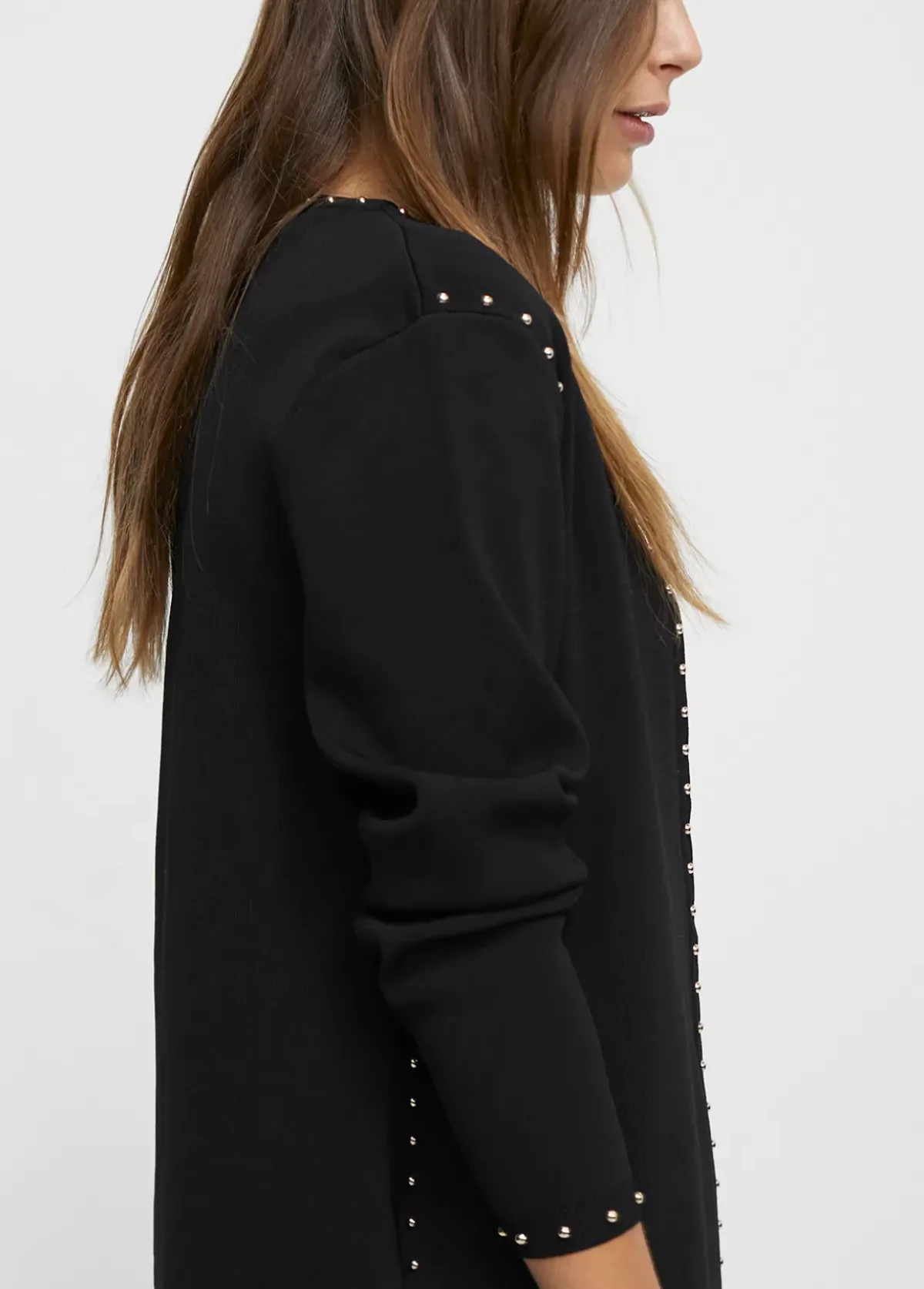 Cárdigan de punto con detalles de tachas doradas en hombro, puño y frontal.