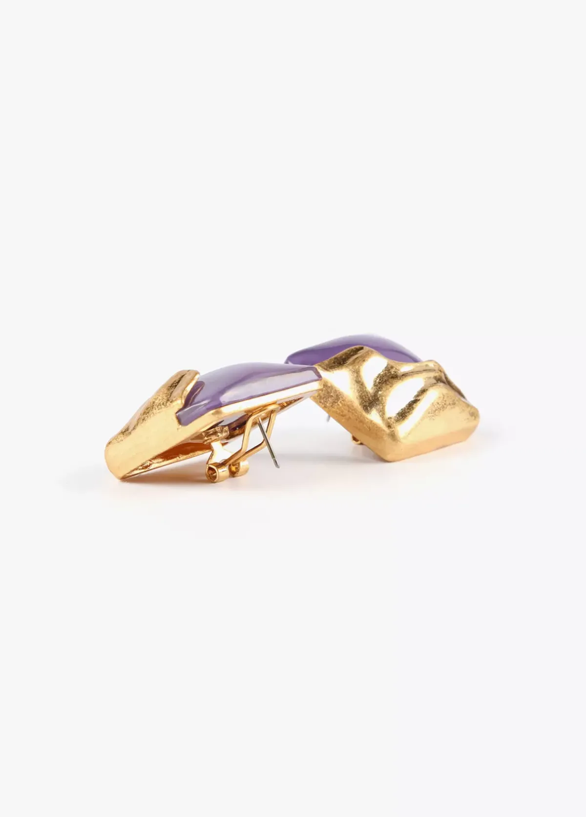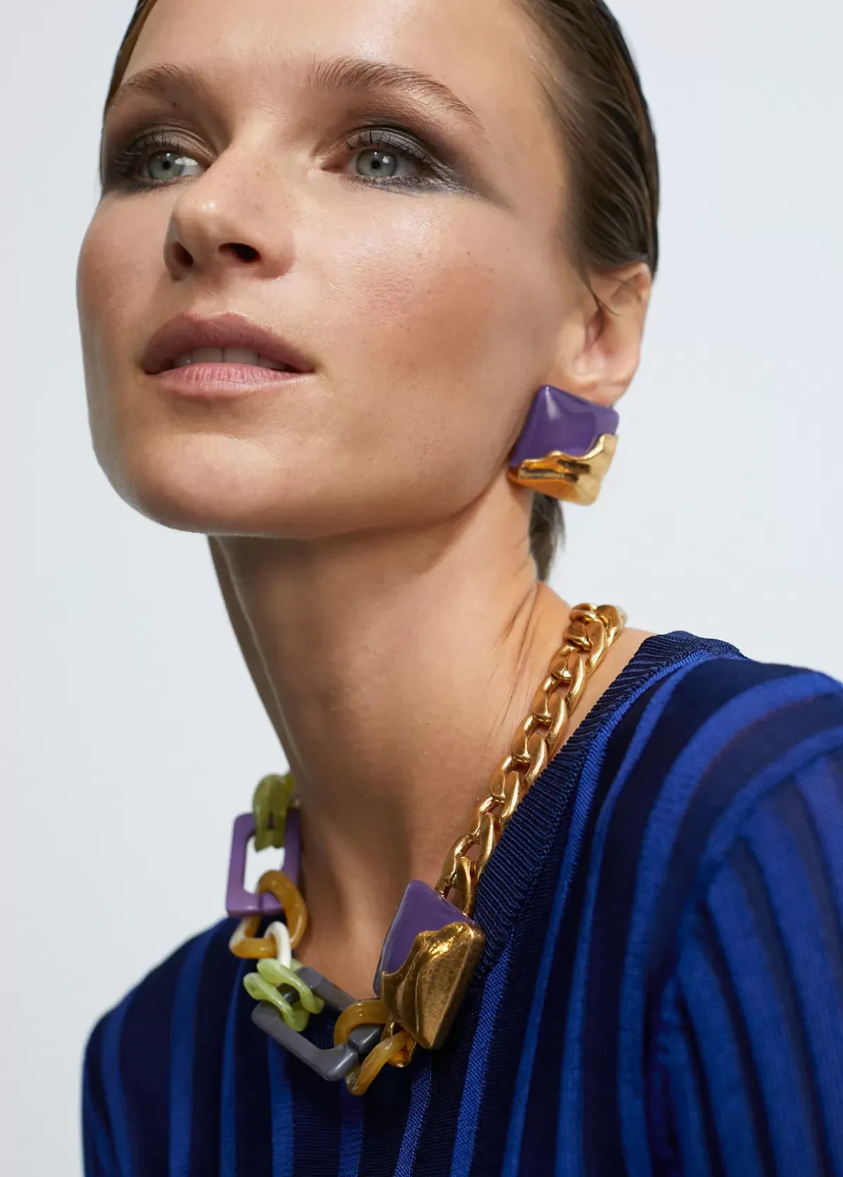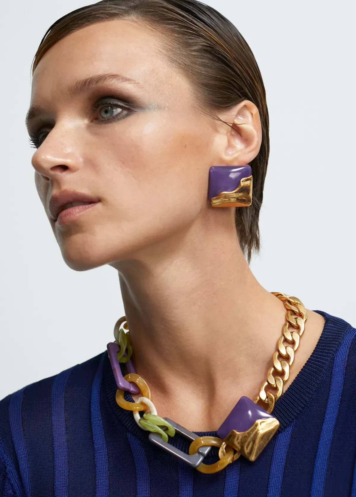 Pendientes dorados de botón cuadrado combinados con acetato de color.