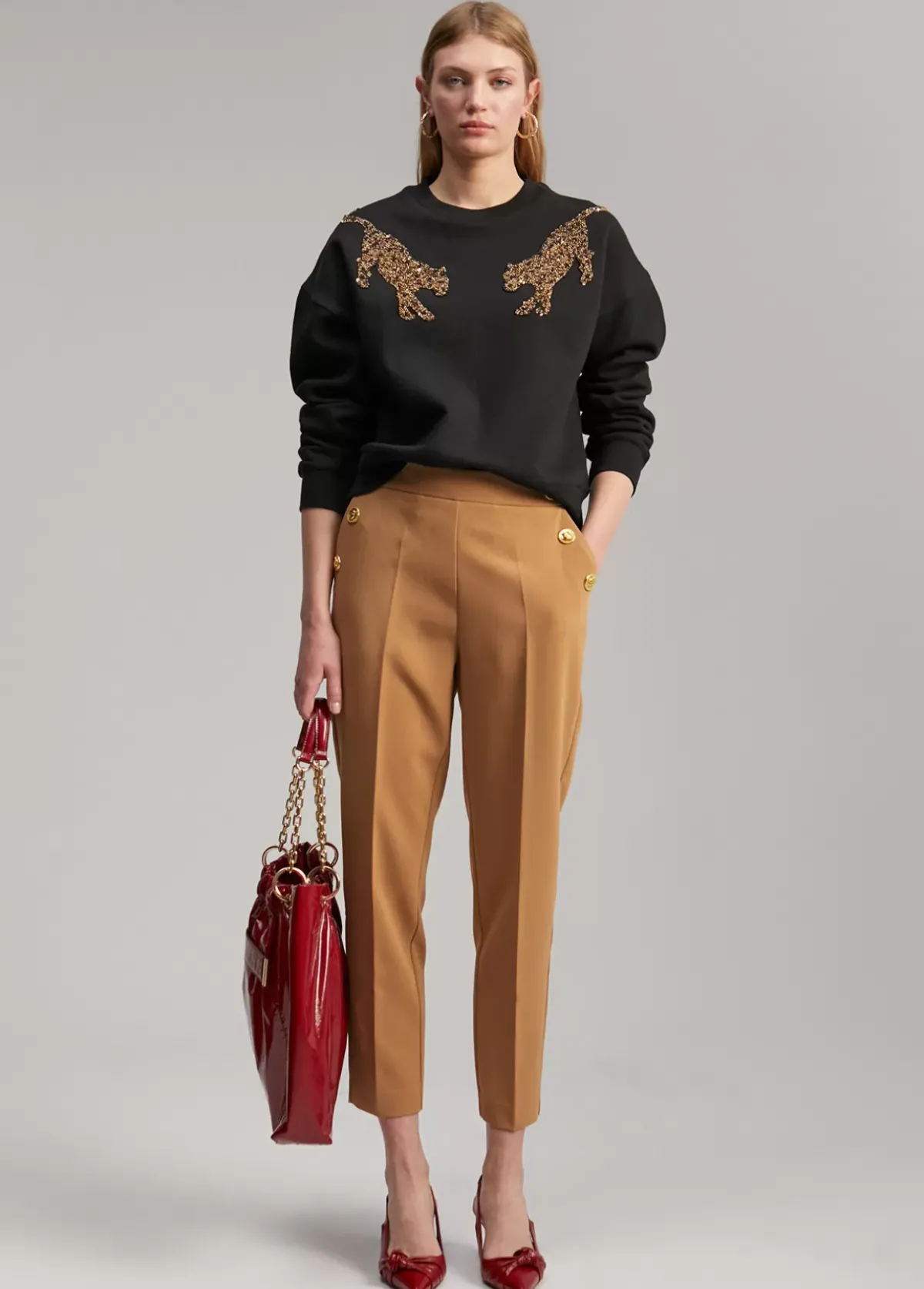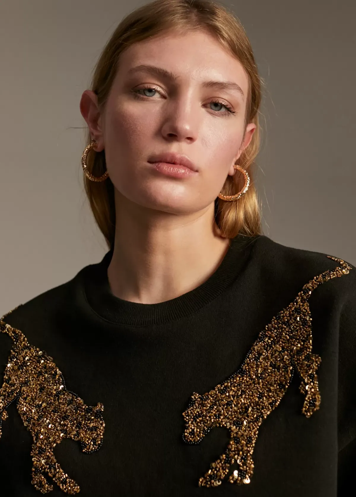 Sudadera de cuello caja. Tigres bordados con aplicaciones metálicas en parte frontal.