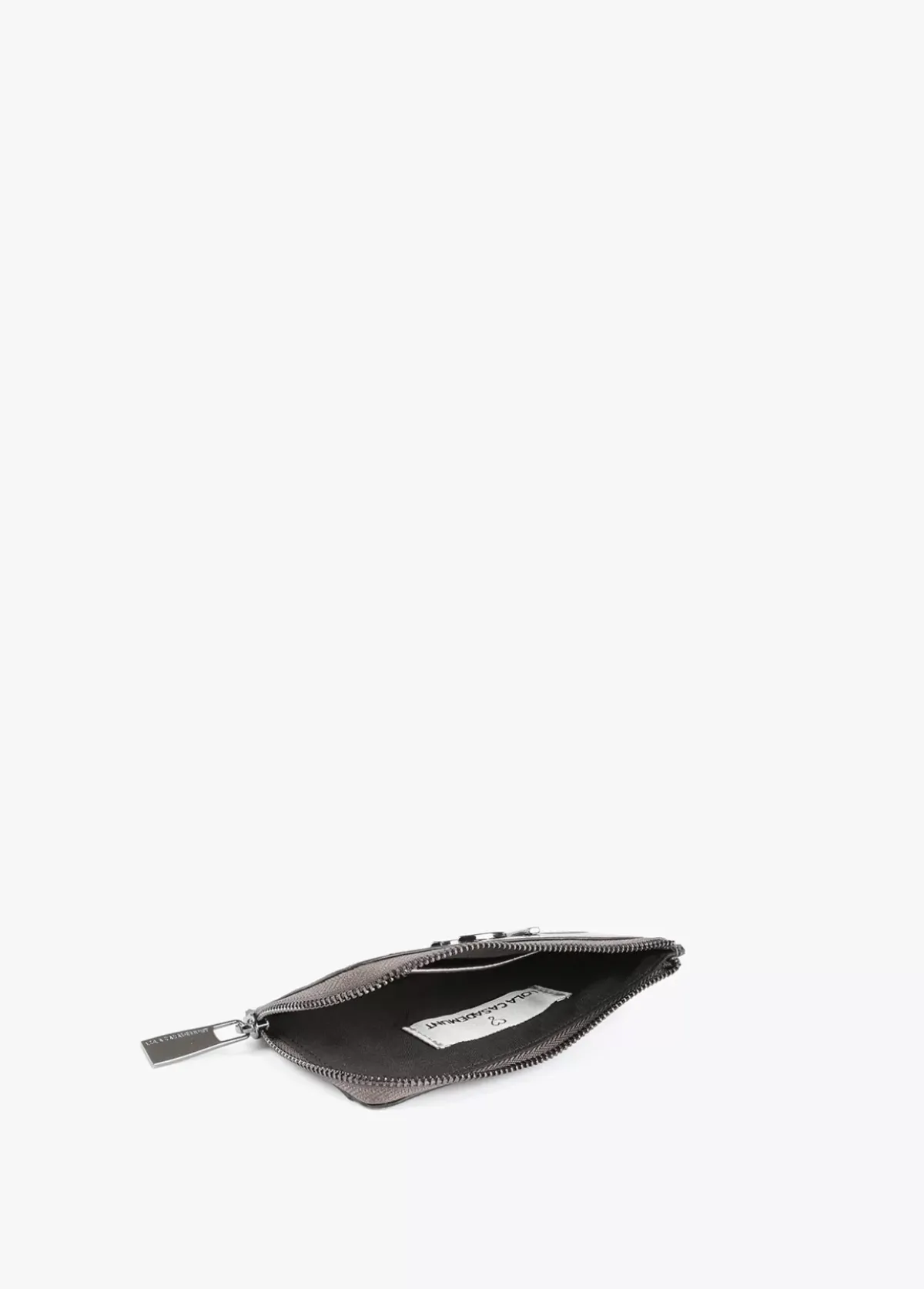 Tarjetero en efecto piel metalizado y logo grabado. Logo metalizado en parte frontal. Bolsillo con cierre de cremallera.