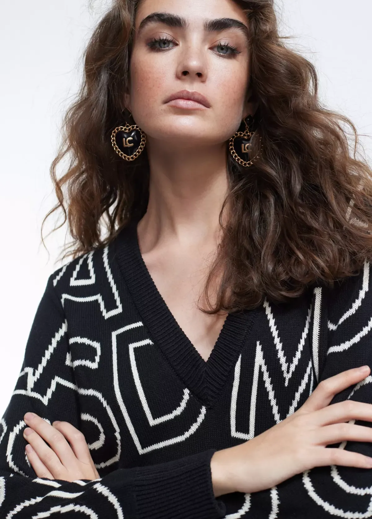 Vestido de punto de cuello pico. Estampado con maxi letras en color contrastado.