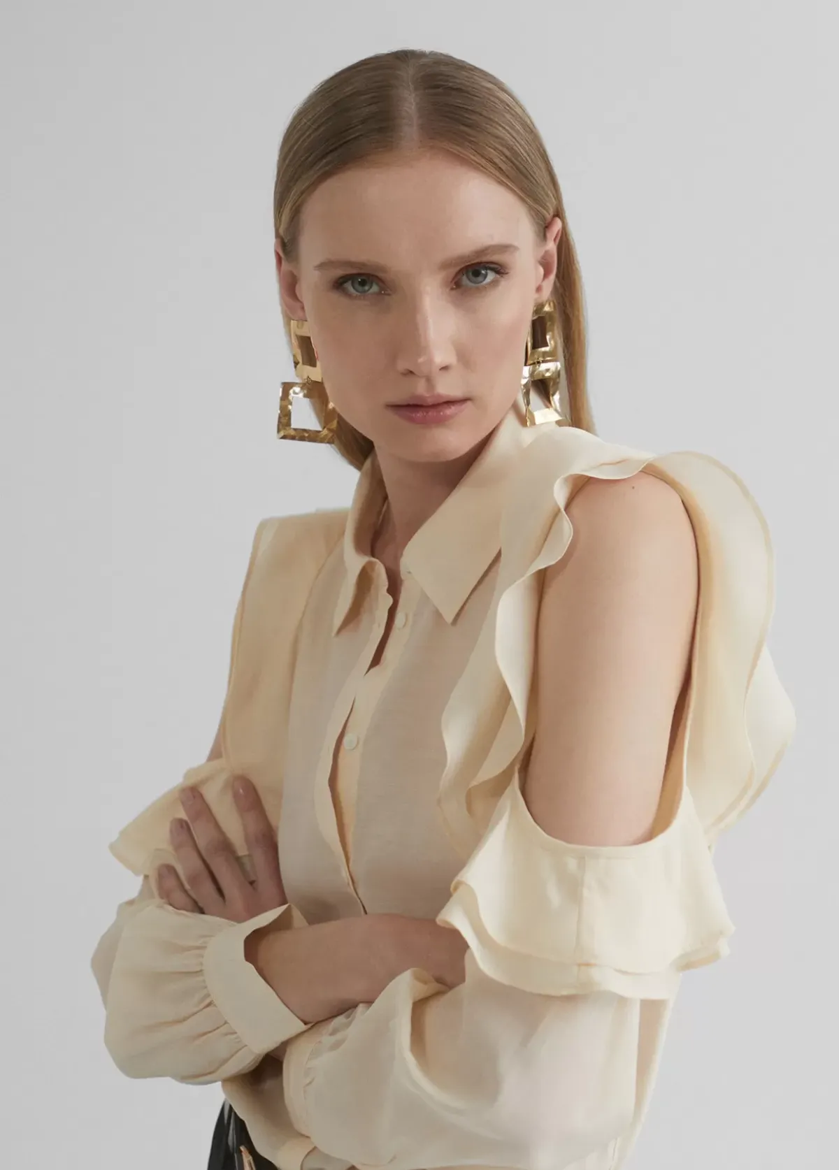 Blusa fluida con manga de volantes y hombros descubiertos. Cuello y puños camisero y cierre con botones a tono.