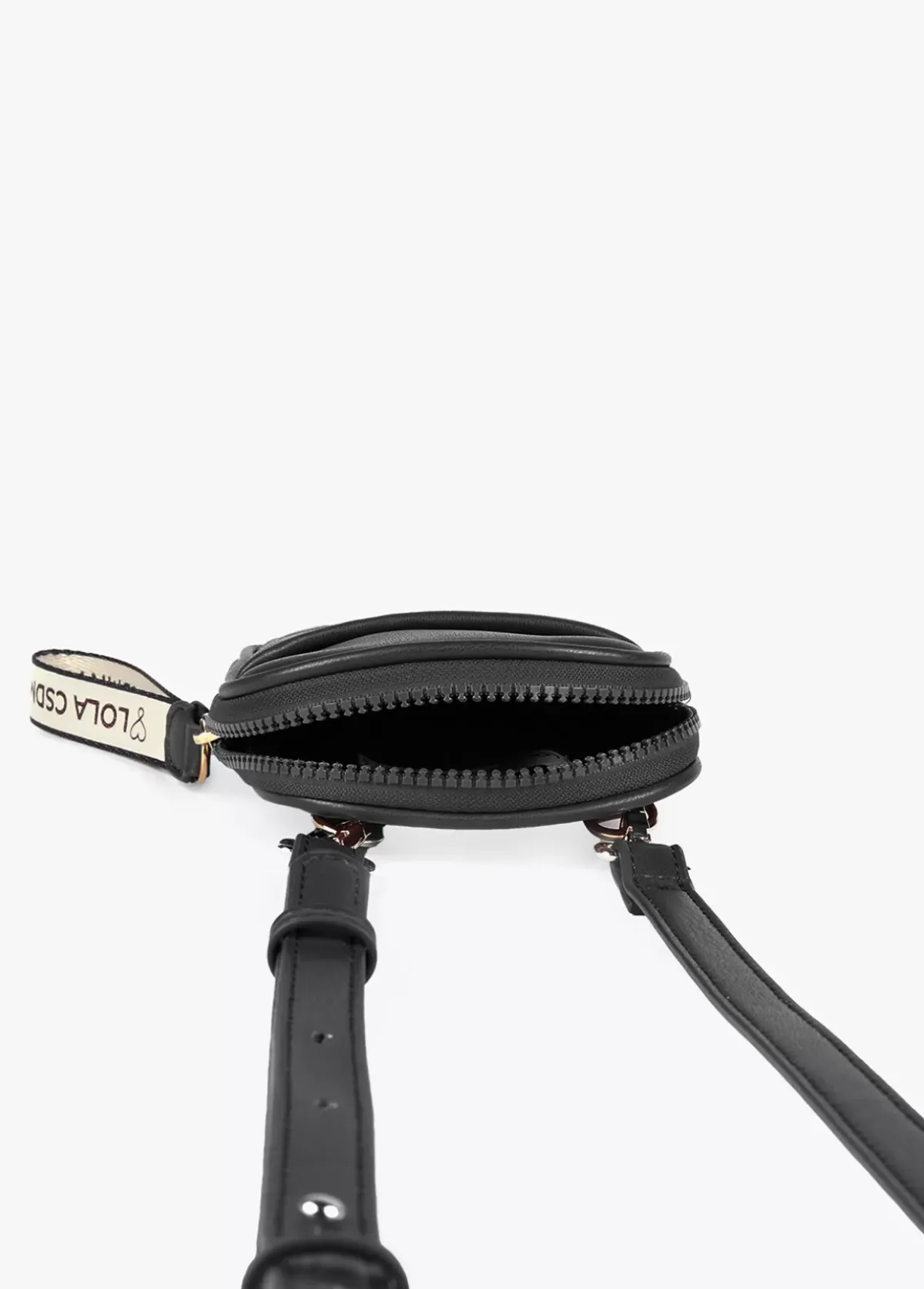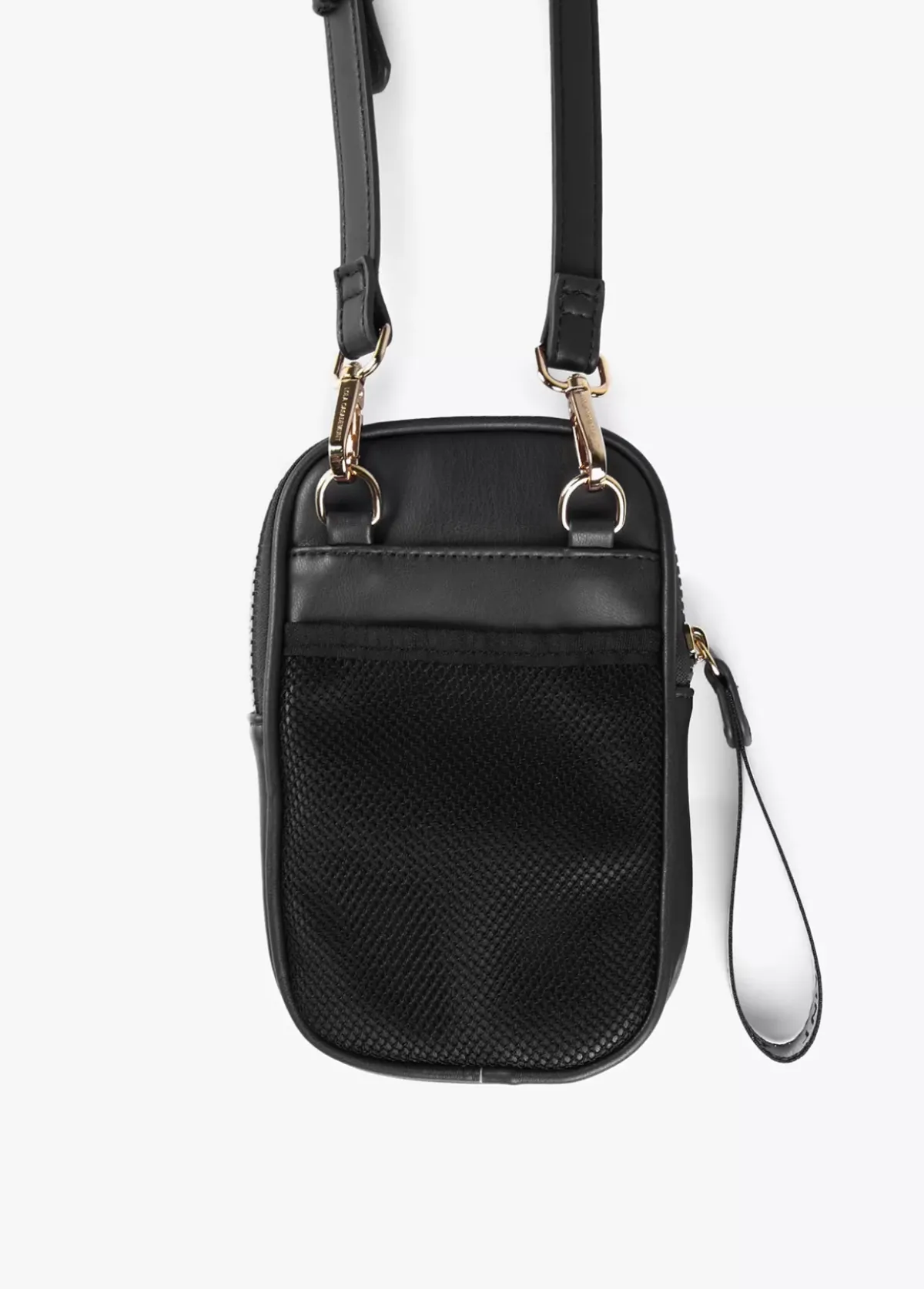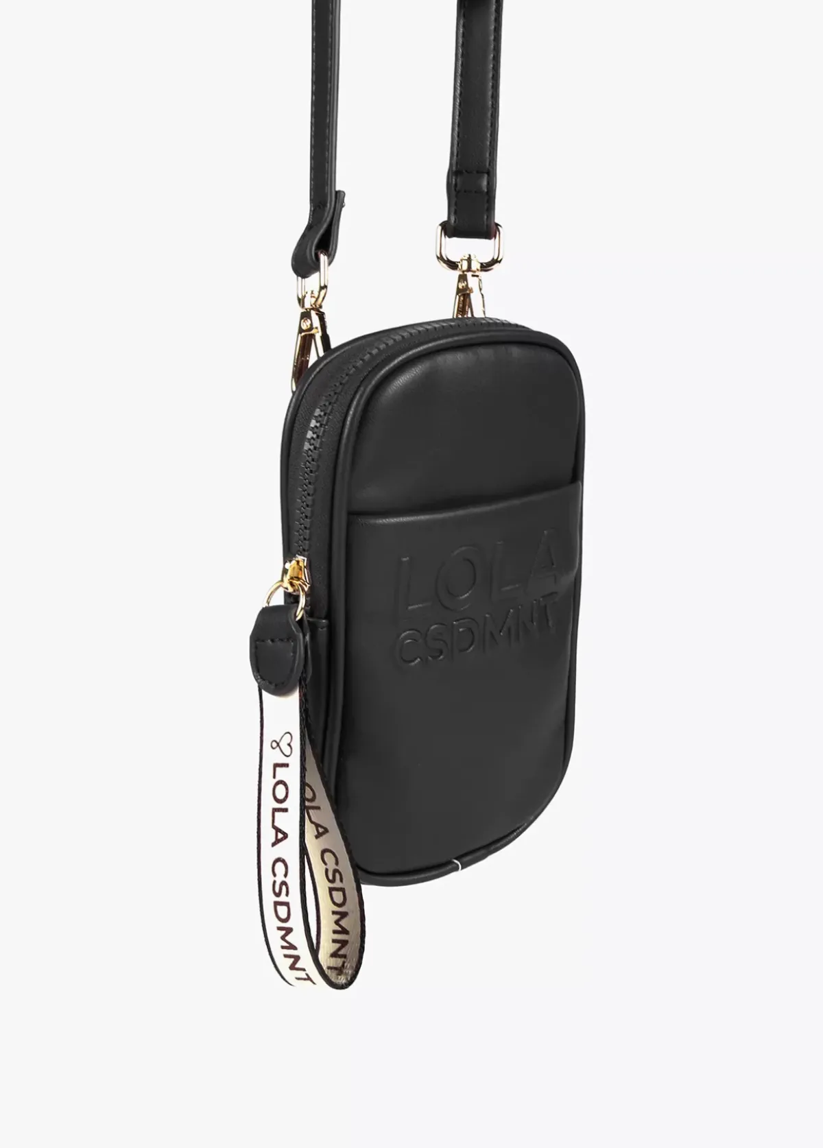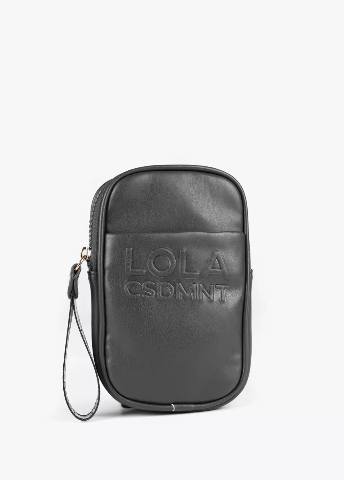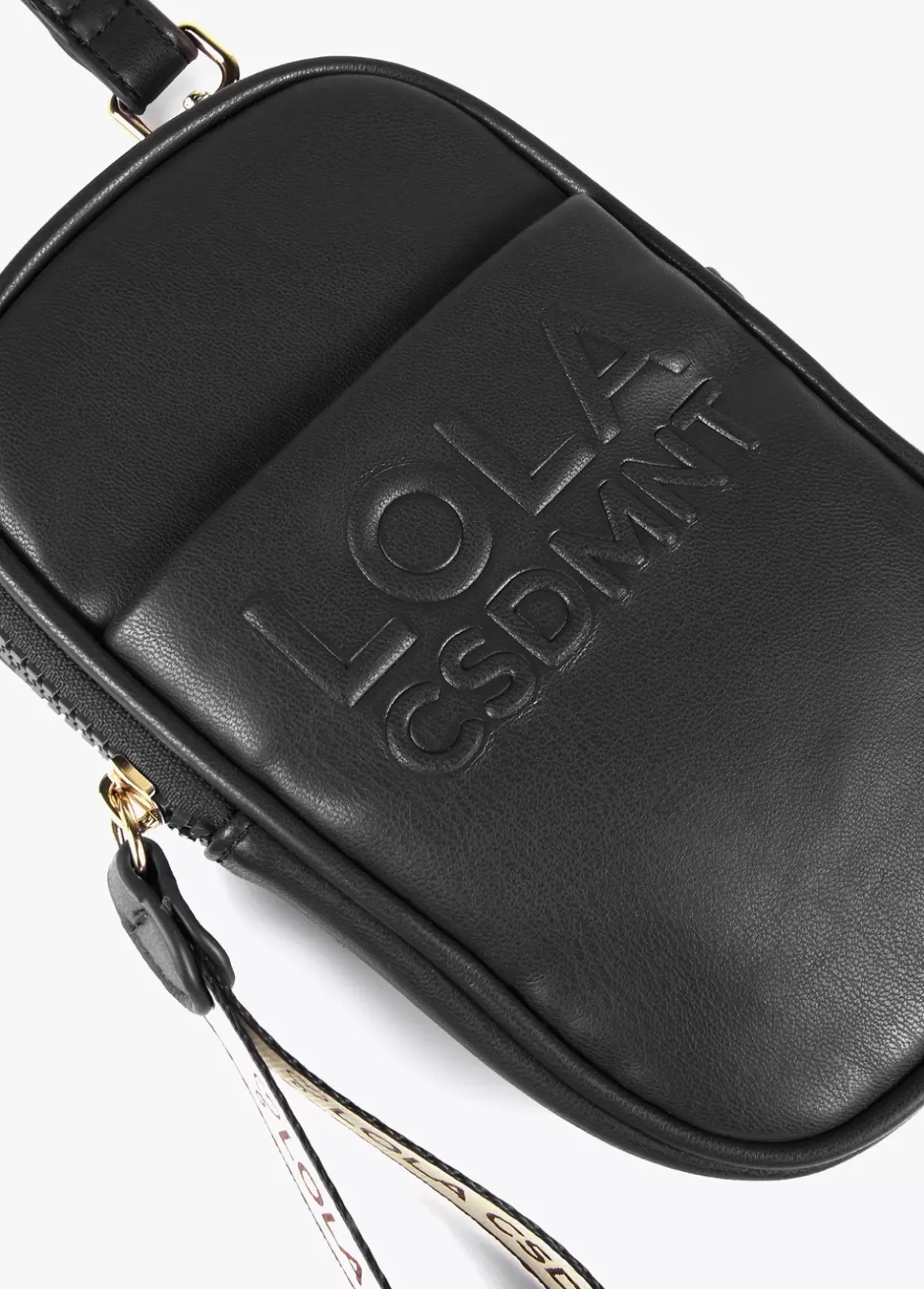 Bolsito portamovil en efecto piel y logo grabado en bolsillo frontal. Cierre de cremallera y asa de mano logotipada. Asa bandolera graduable y extraible.
