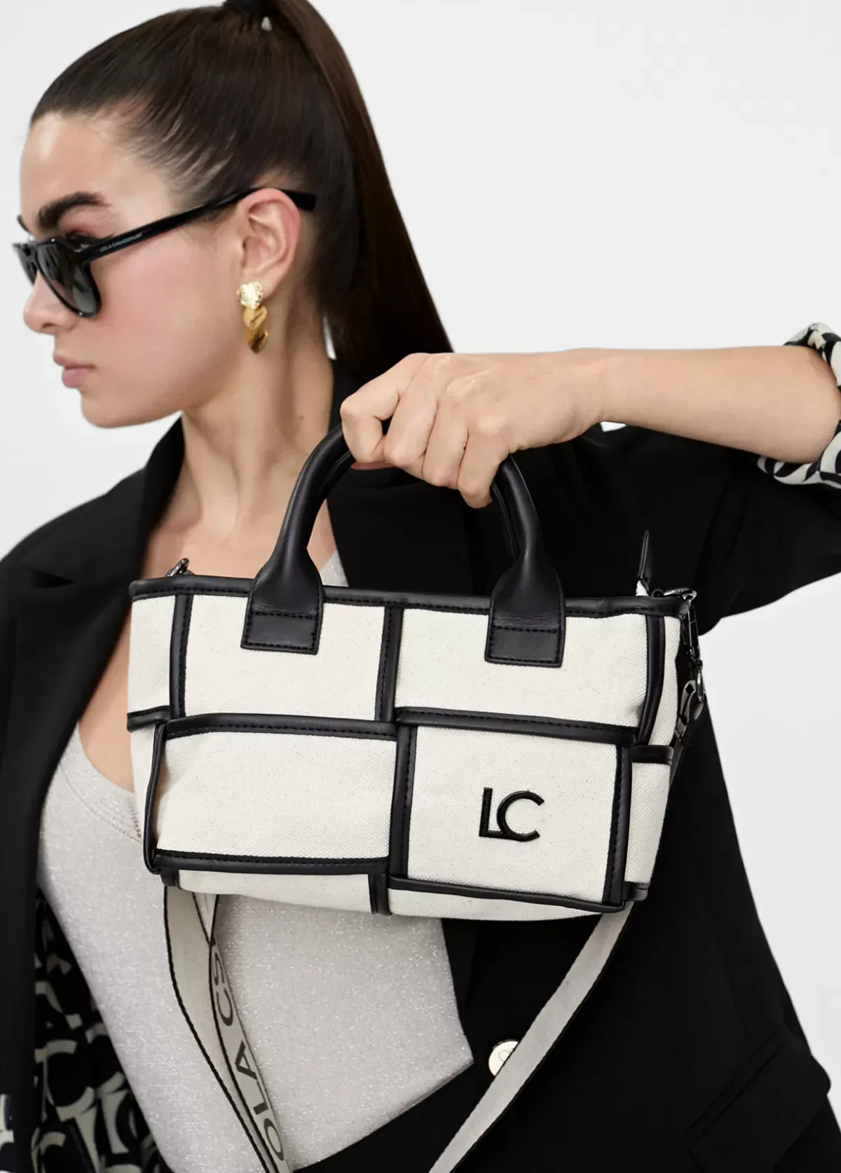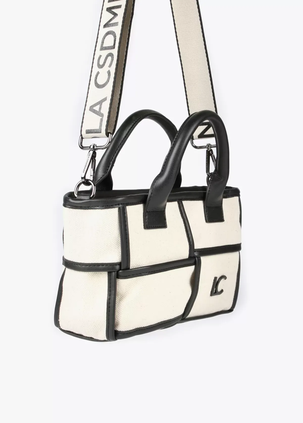 Bolso bandolera con detalles en efecto piel a contraste. Asas de mano y asa bandolera logotipada, ajustable y extraible. Logo lacado y cierre de cremallera.