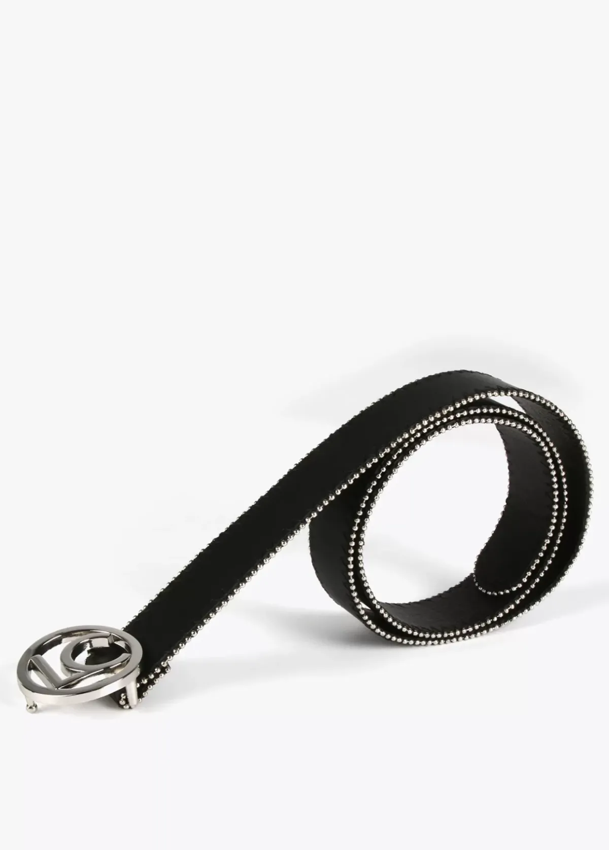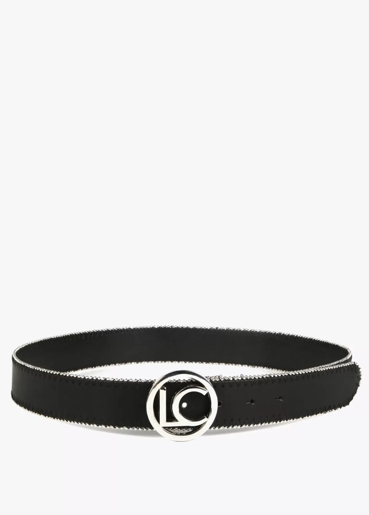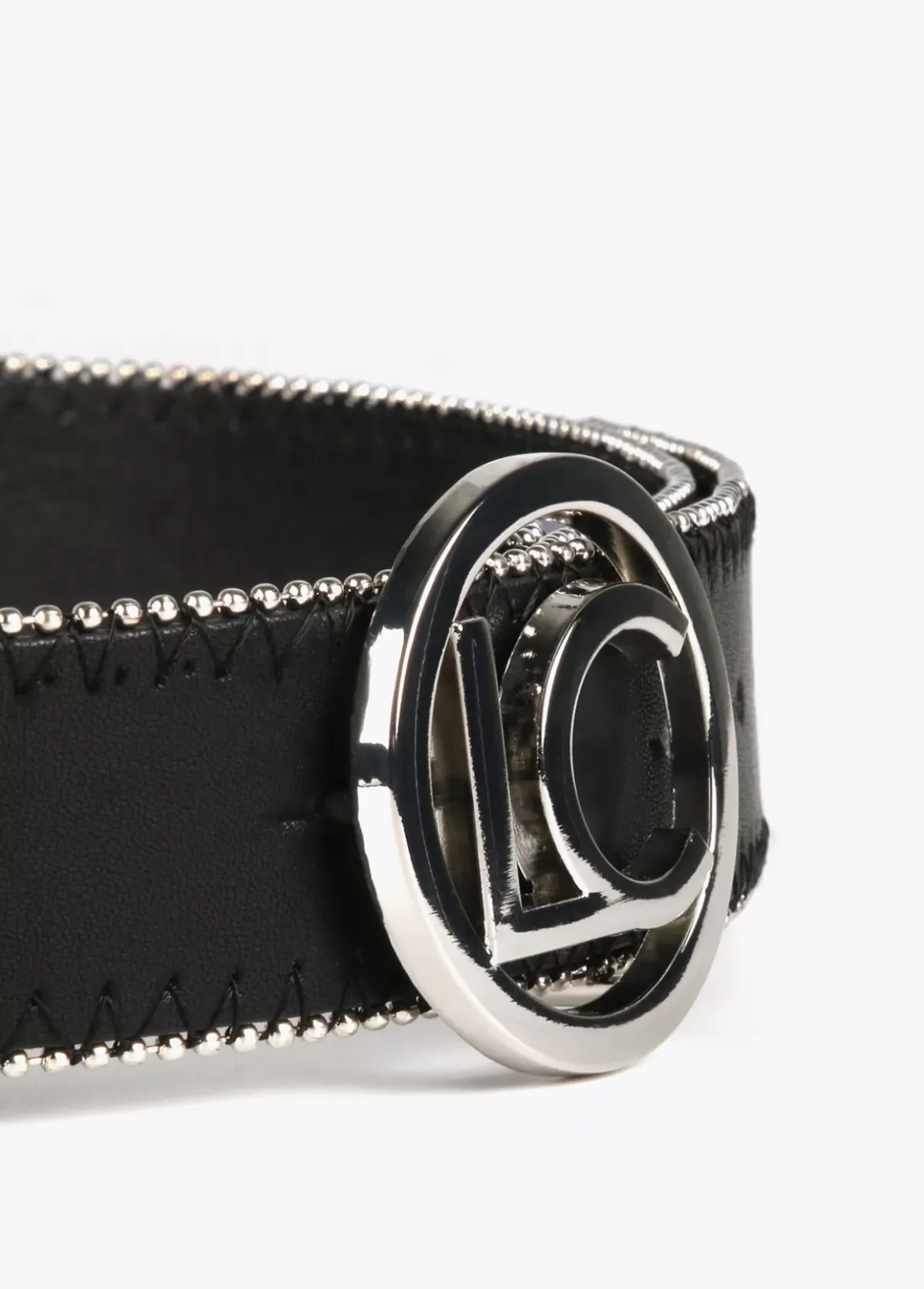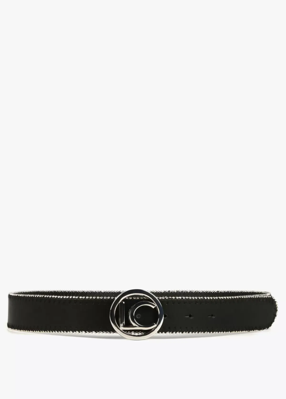 Cinturón con ribete y letras logo dorado a modo de hebilla.