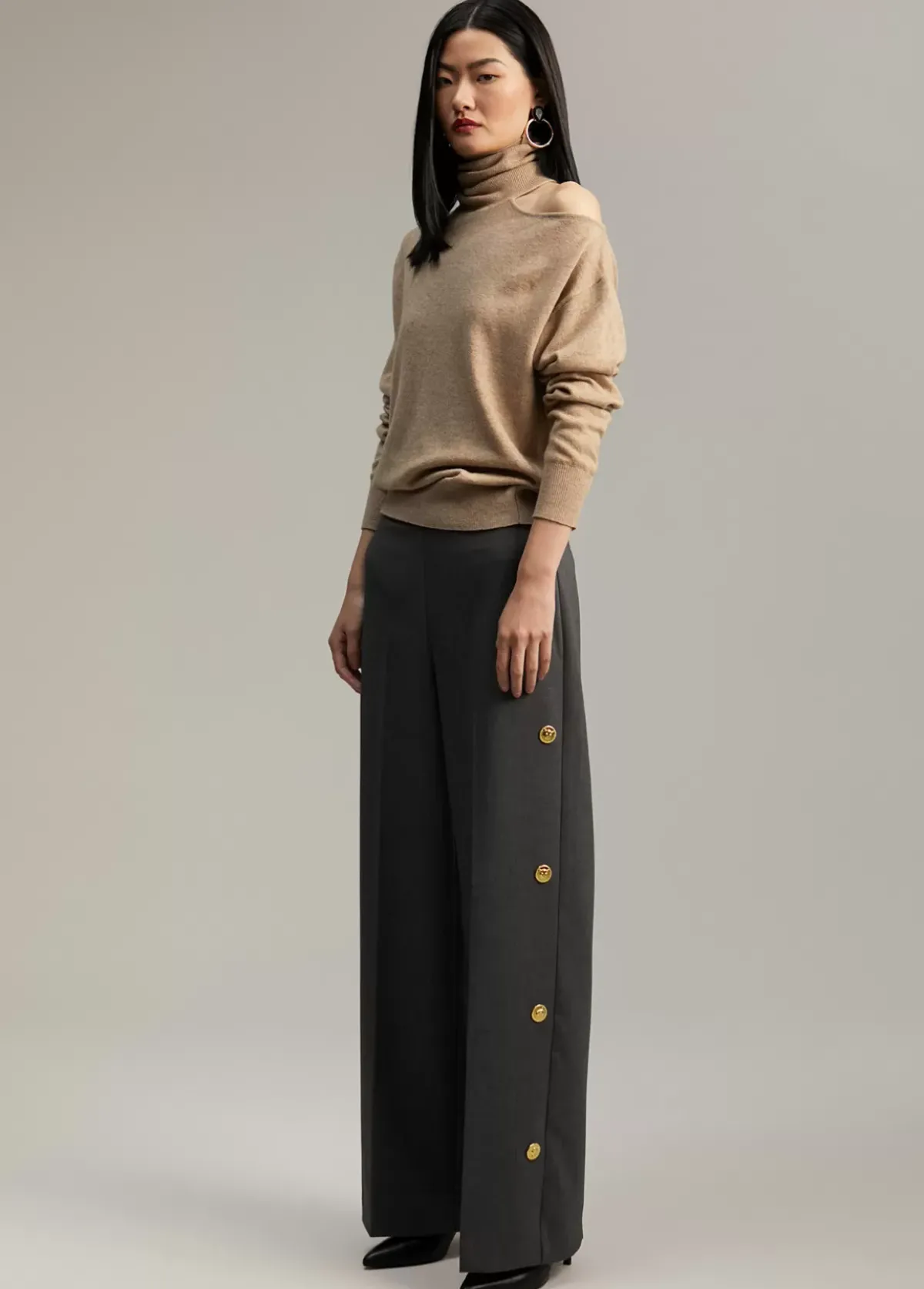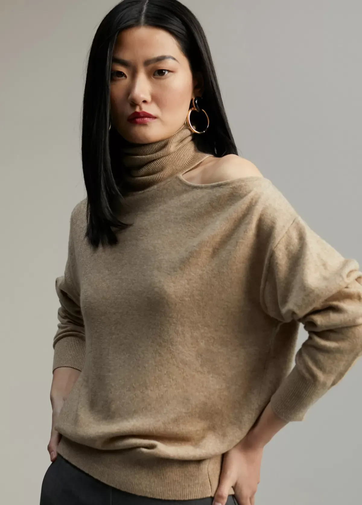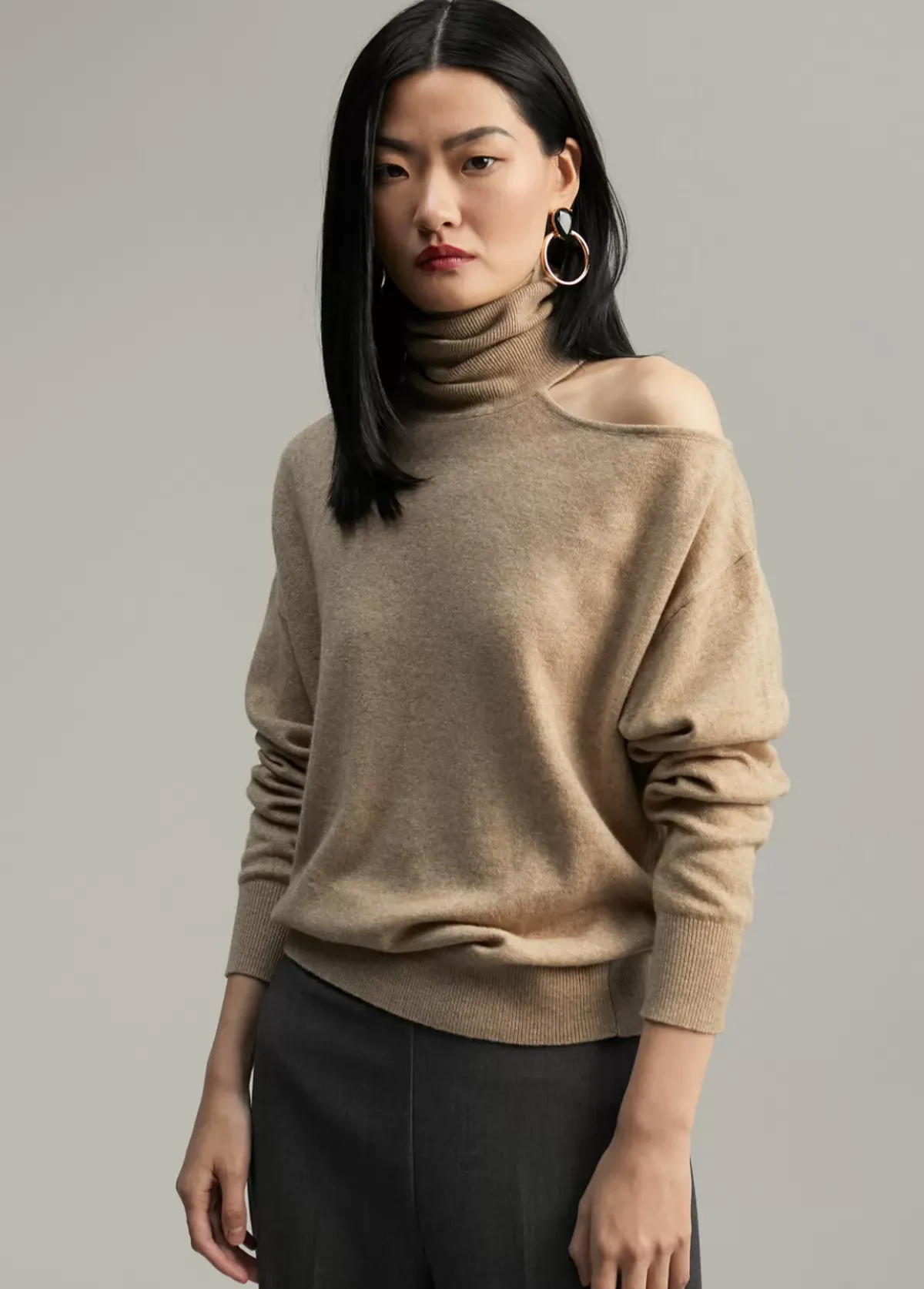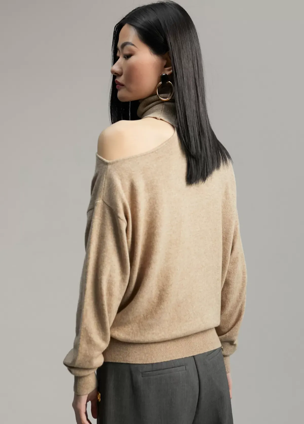 Jersey cuello alto y manga larga. Detalle de abertura en hombro.
