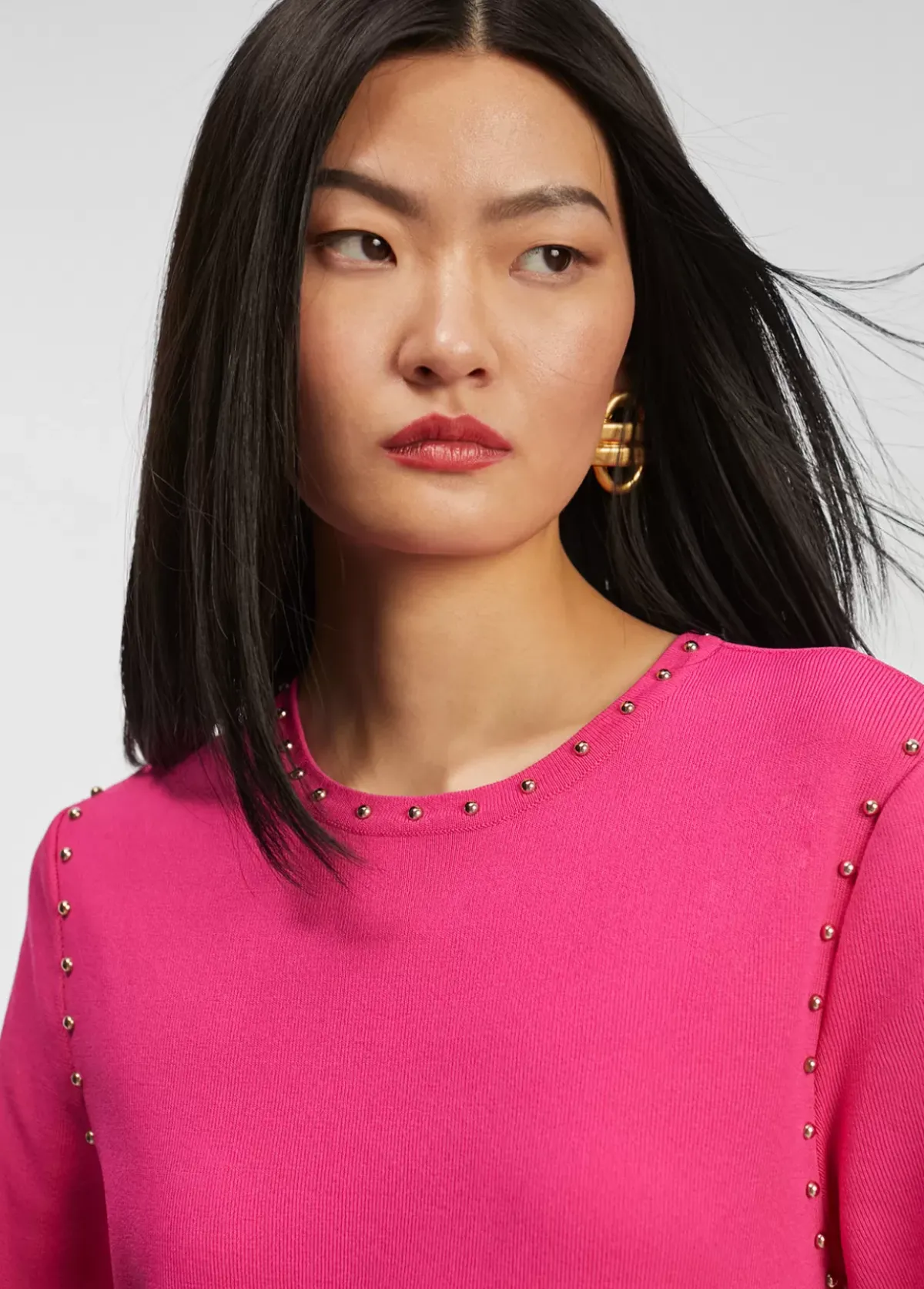Jersey de cuello redondo y manga corta. Detalle de tachas doradas en cuello, sisa, manga y lateral.