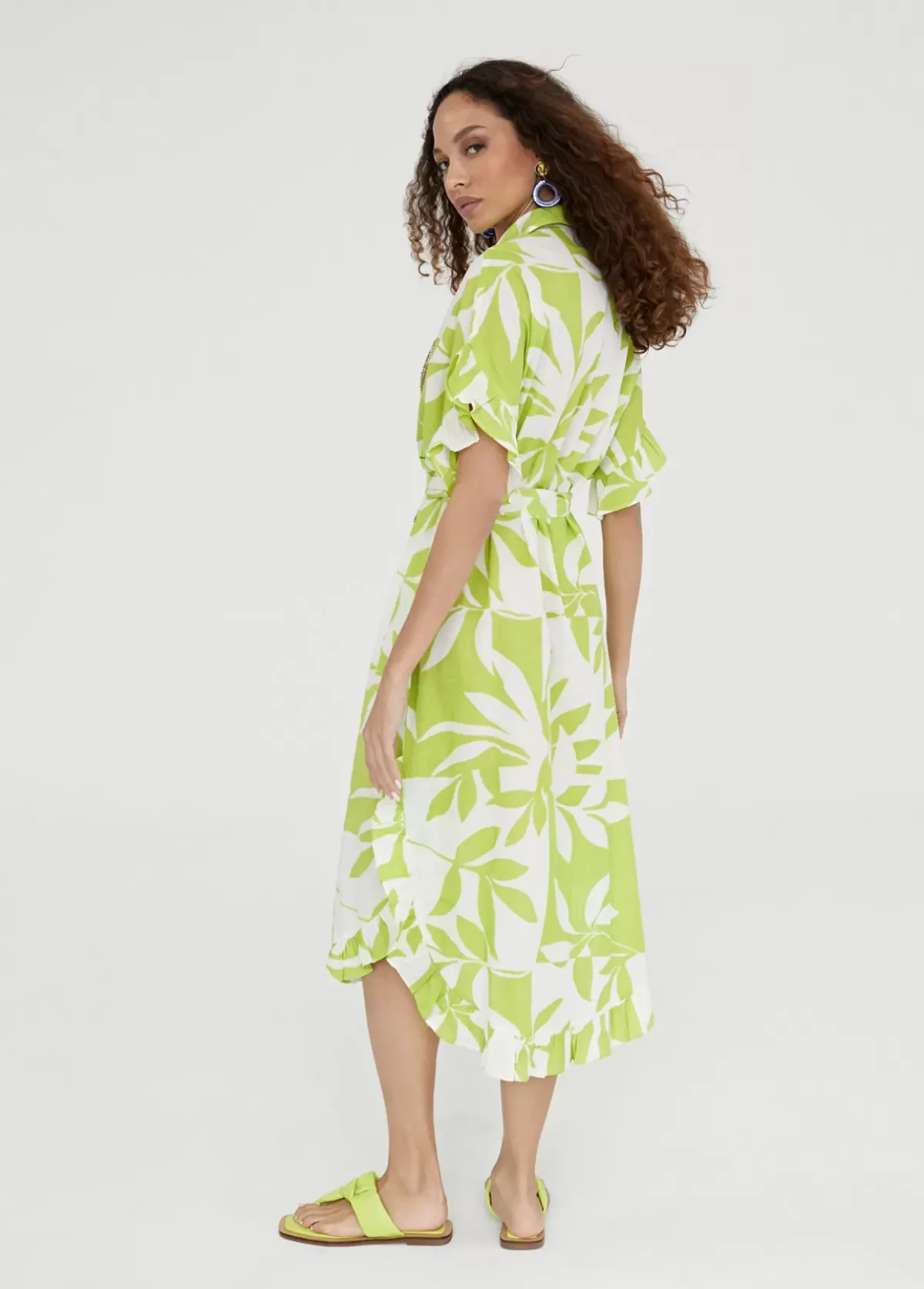 Vestido estilo caftan de largo midi y estampado bicolor. Cuello camisero y abrochado con botones. Bordado a contraste en pechera.Manga corta terminada en volante. Aberturas en bajo con volante.